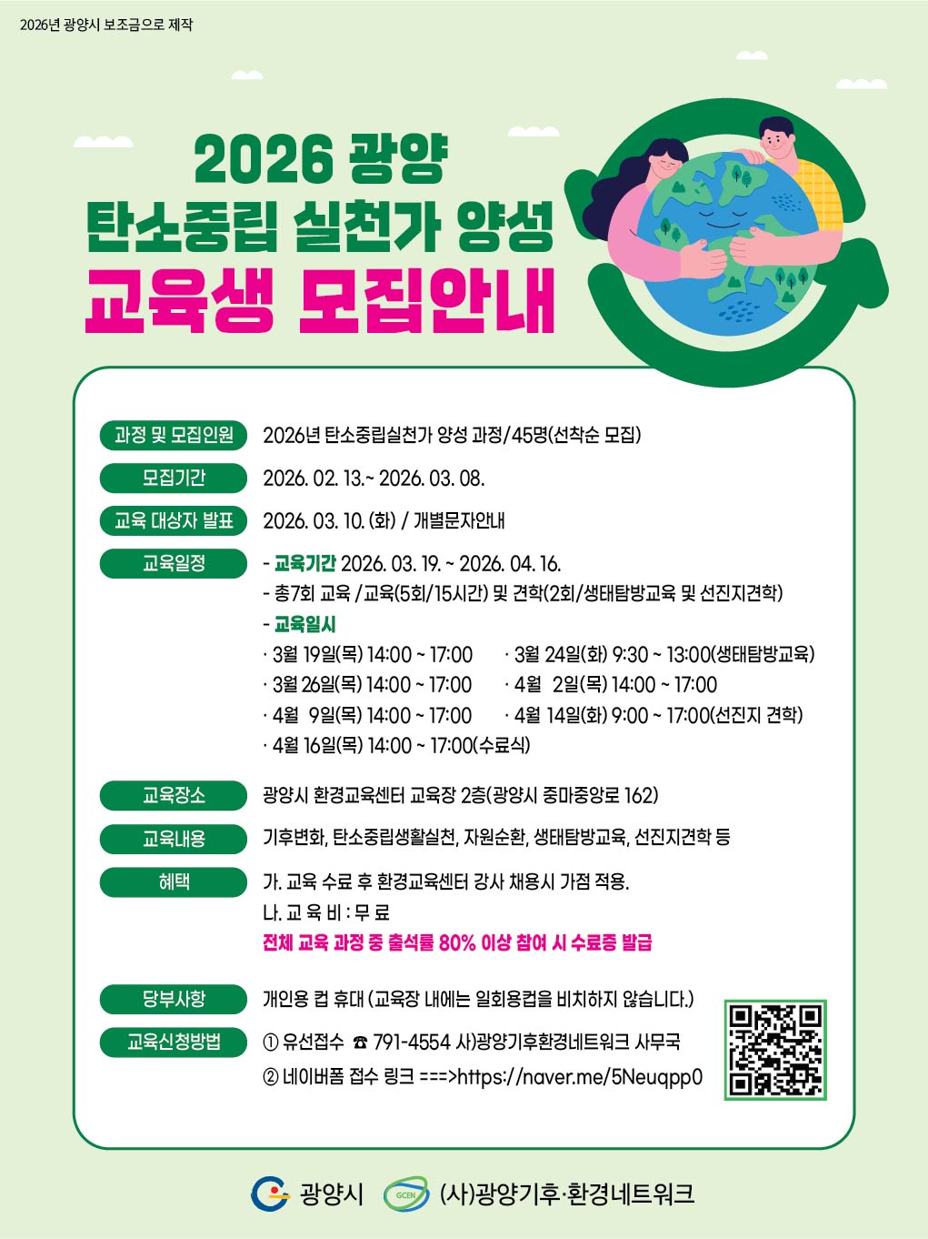 | 7762 | 2026년 광양시 탄소중립 실천가 양성 교육생 모집 안내 | |