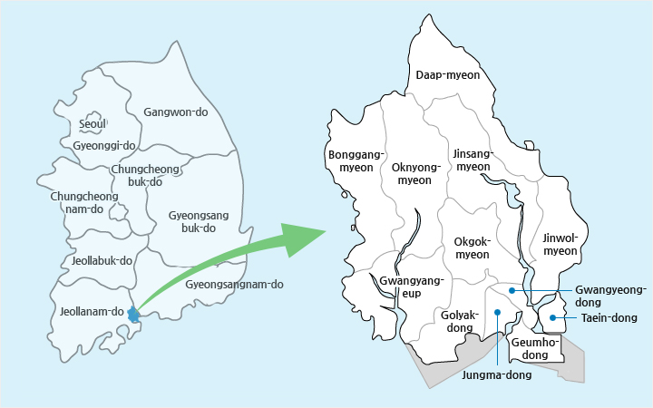 Located in the middle of the southernmost part of the Korean Peninsula, Gwangyang is a strategic city in national maritime administration. It borders Gurye to the north, Hadong to the east, Suncheon to the west, and the Gwangyang Bay to the south. Overlooking the Yeosu, Gwangyang is in the heart of the Gwangyang Bay and Jinju area. Being a strategic location, the city has served as the gateway for cultural exchanges between the Yeongnam and Honam areas and plays an important part in balanced national development.