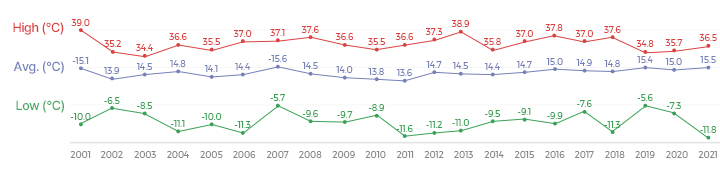 | Average Temperature | 14.4 | 15.1 | 13.9 | 14.4 | 14.8 | 14.1 | 14.4 | 15.6 | 14.5 | 14.0 | 13.8 | 13.6 | 14.7 | 14.5 | 14.9 | 14.7 |