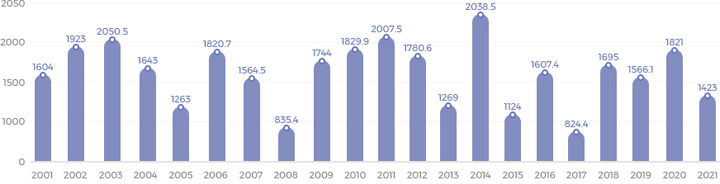 | Rainfall | 1,833 | 1,604 | 1,923 | 2,050.5 | 1,643 | 1,263 | 1820.7 | 1,564.5 | 835.4 | 1,744 | 1,829.9 | 2,007.5 | 1,780.6 | 1,269.0 | 2,038.5 | 1,124.0 |