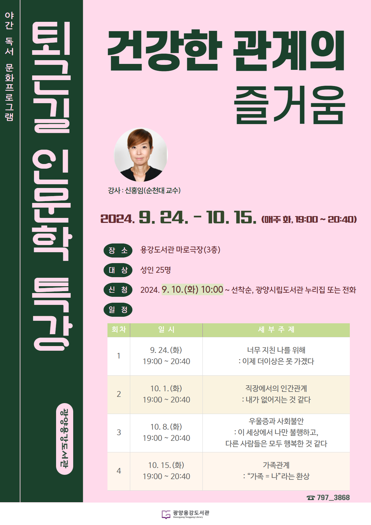 | 6585 | 용강도서관 <퇴근길 인문학 특강> - 건강한 관계의 즐거움 - | |