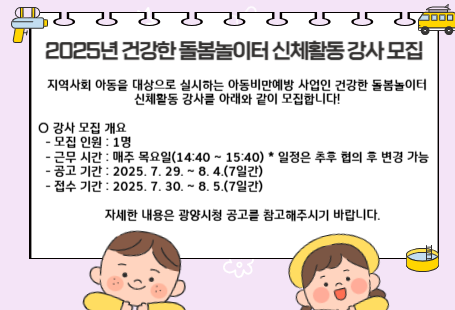 | 7325 | 2025년 아동비만예방사업 '건강한 돌봄놀이터' 신체활동 강사 모집 안내 | |
