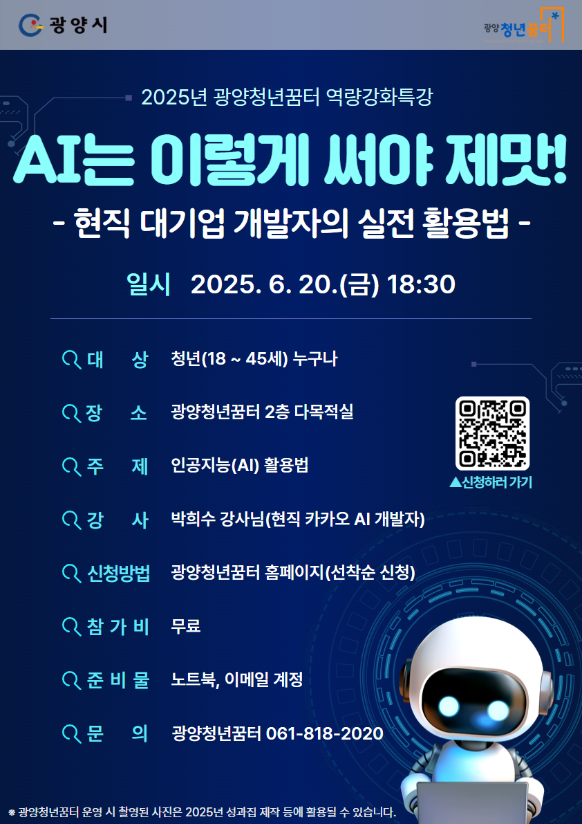 | 7194 | 광양청년꿈터 역량강화특강 「AI는 이렇게 써야 제맛!」 수강생 모집 홍보 | |