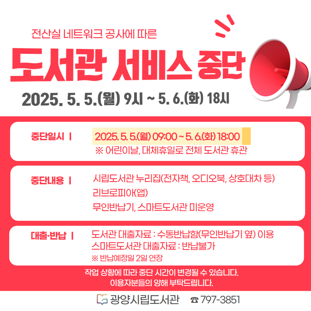 | 7106 | 5월 5일(월) ~ 6일(화) 광양시립도서관 서비스 중단 안내 | |