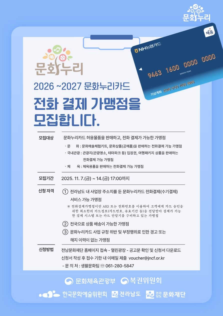 | 7540 | 2026~2027 통합문화이용권 문화누리카드 전화결제 가맹점 모집 공고 | |
