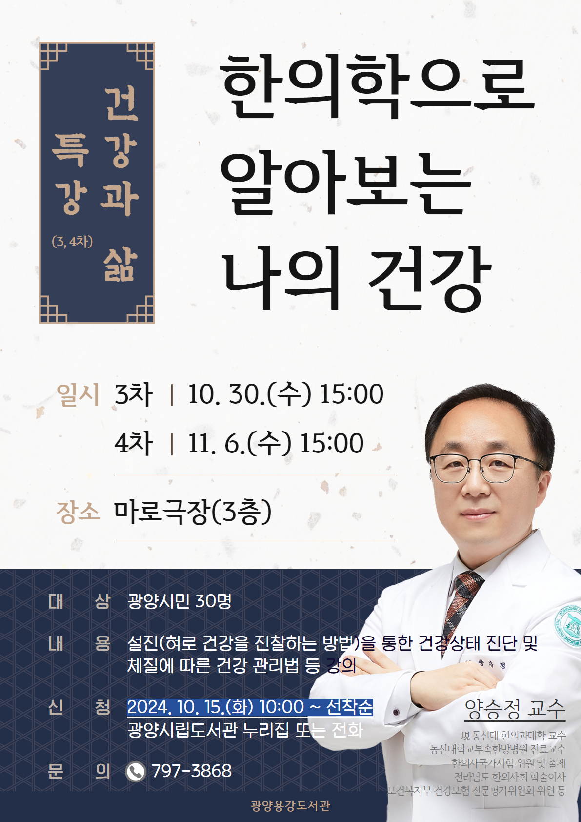 | 6693 | 용강도서관 <건강과 삶 특강(3, 4차)> -한의학으로 알아보는 나의 건강- | |