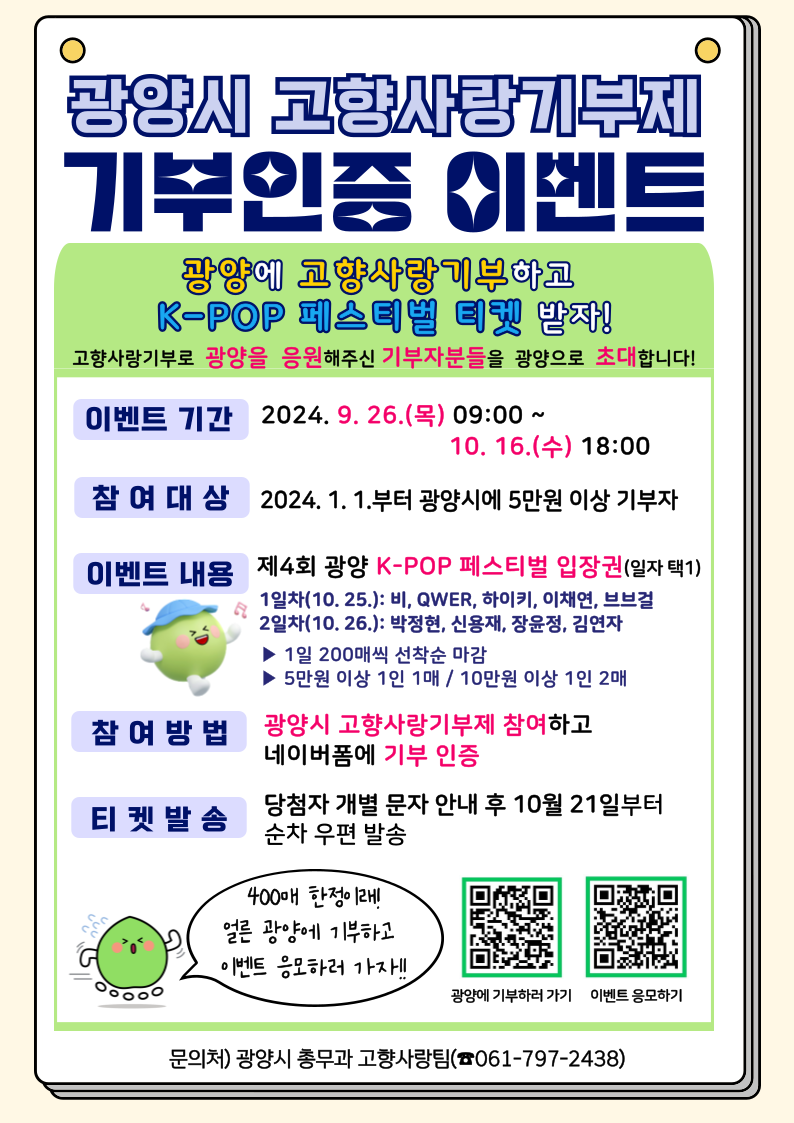 | 6640 | 「광양에 고향사랑 기부하고 광양 K-POP 페스티벌 티켓 받자!」기부인증 이벤트 안내 | |