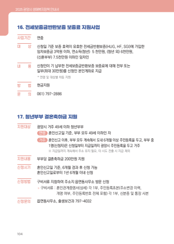 2025 %uad11%uc591%uc2dc %uc0dd%uc560%ubcf5%uc9c0%uc815%ucc45 %uc548%ub0b4%uc11c10416. %uc804%uc138%ubcf4%uc99d%uae08%ubc18%ud658%ubcf4%uc99d %ubcf4%uc99d%ub8cc %uc9c0%uc6d0%uc0ac%uc5c5%uc0ac%uc5c5%uae30%uac04%u0009 %uc5f0%uc911%ub300%u0009 %uc0c1 %uc2e0%uccad%uc77c %uae30%uc900 %ubcf4%uc99d %ud6a8%ub825%uc774 %uc720%ud6a8%ud55c %uc804%uc138%uae08%ubc18%ud658%ubcf4%uc99d(HUG, HF, SGI)%uc5d0 %uac00%uc785%ud55c %uc784%ucc28%ubcf4%uc99d%uae08 3%uc5b5%uc6d0 %uc774%ud558, %uc5f0%uc18c%ub4dd(%uccad%ub144) 5 %ucc9c%ub9cc%uc6d0, (%uccad%ub144 %uc678) 6%ucc9c%ub9cc%uc6d0, (%uc2e0%ud63c%ubd80%ubd80) 7.5%ucc9c%ub9cc%uc6d0 %uc774%ud558%uc778 %uc784%ucc28%uc778 %ub0b4%u0009 %uc6a9 %uc2e0%uccad%uc778%uc774 %uae30 %ub0a9%ubd80%ud55c %uc804%uc138%ubcf4%uc99d%uae08%ubc18%ud658%ubcf4%uc99d %ubcf4%uc99d%ub8cc%uc5d0 %ub300%ud574 %uc804%ubd80 %ub610%ub294 %uc77c%ubd80(%ucd5c%ub300 30%ub9cc%uc6d0)%ub97c %uc2e0%uccad%uc778 %ubcf8%uc778%uacc4%uc88c%ub85c %uc9c0%uae09 * %uc5f0%ub839 %ubc0f %ub300%uc0c1%ubcc4 %ucc28%ub4f1 %uc9c0%uc6d0%ubc29%u0009 %ubc95 %ud604%uae08%uc9c0%uc6d0%ubb38%u0009 %uc758 061) 797-288617. %uccad%ub144%ubd80%ubd80 %uacb0%ud63c%ucd95%ud558%uae08 %uc9c0%uc6d0%uc9c0%uc6d0%ub300%uc0c1%u0009 %uad11%uc591%uc2dc %uac70%uc8fc 49%uc138 %uc774%ud558 %uccad%ub144%ubd80%ubd80 %uc5f0%ub839 %ud63c%uc778%uc2e0%uace0%uc77c %uae30%uc900, %ubd80%ubd80 %ubaa8%ub450 49%uc138 %uc774%ud558%uc778 %uc790 %uac70%uc8fc %ud63c%uc778%uc2e0%uace0 %uc774%ud6c4, %ubd80%ubd80 %ubaa8%ub450 %uacc4%uc18d%ud574%uc11c %ub3c4%ub0b4 6%uac1c%uc6d4 %uc774%uc0c1 %uc8fc%ubbfc%ub4f1%ub85d%uc744 %ub450%uace0, %ubd80%ubd80 %uc911 1%uba85(%uc2e0%uccad%uc790)%uc740 %uc2e0%uccad%uc77c%ubd80%ud130 %uc9c0%uae09%uc77c%uae4c%uc9c0 %uad11%uc591%uc2dc %uc8fc%ubbfc%ub4f1%ub85d%uc744 %ub450%uace0 %uac70%uc8fc%u203b %uc9c0%uae09%uc77c%uae4c%uc9c0 %uacc4%uc18d%ud574%uc11c %uc8fc%uc18c %uc720%uc9c0 %ud544%uc694, %ud0c0 %uc2dc%ub3c4 %uc804%ucd9c %uc2dc %uc9c0%uae09 %uc81c%uc678%uc9c0%uc6d0%ub0b4%uc6a9%u0009 %ubd80%ubd80%ub2f9 %uacb0%ud63c%ucd95%ud558%uae08 200%ub9cc%uc6d0 %uc9c0%uc6d0 %uc2e0%uccad%uc2dc%uae30%u0009 %ud63c%uc778%uc2e0%uace0%uc77c %uae30%uc900, 6%uac1c%uc6d4 %uacbd%uacfc %ud6c4 %uc2e0%uccad %uac00%ub2a5%ud63c%uc778%uc2e0%uace0%uc77c%ub85c%ubd80%ud130 1%ub144 6%uac1c%uc6d4 %uc774%ub0b4 %uc2e0%uccad %uc2e0%uccad%ubc29%ubc95%u0009 %uad6c%ube44%uc11c%ub958 %uc9c0%ucc38%ud558%uc5ec %uc8fc%uc18c%uc9c0 %uc74d%uba74%ub3d9%uc0ac%ubb34%uc18c %ubc29%ubb38 %uc2e0%uccad %u00bb %uad6c%ube44%uc11c%ub958 : %ud63c%uc778%uad00%uacc4%uc99d%uba85%uc11c(%uc0c1%uc138) %uac01 1%ubd80, %uc8fc%ubbfc%ub4f1%ub85d%ucd08%ubcf8(%uc8fc%uc18c%ubcc0%uacbd %uc774%ub825, %uac1c%uba85 %uc5ec%ubd80, %uc8fc%ubbfc%ub4f1%ub85d%ubc88%ud638 %uc804%uccb4 %ud3ec%ud568) %uac01 1%ubd80, %uc2e0%ubd84%uc99d %ubc0f %ud1b5%uc7a5 %uc0ac%ubcf8 %uc2e0%uccad%ubb38%uc758%u0009 %uc74d%uba74%ub3d9%uc0ac%ubb34%uc18c, %ucd9c%uc0dd%ubcf4%uac74%uacfc 797-4032
