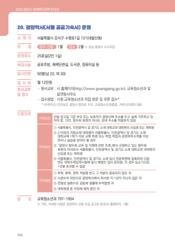 2025 %uad11%uc591%uc2dc %uc0dd%uc560%ubcf5%uc9c0%uc815%ucc45 %uc548%ub0b4%uc11c10620. %uad11%uc591%ud559%uc0ac(%uc11c%uc6b8 %uacf5%uacf5%uae30%uc219%uc0ac) %uc6b4%uc601%uc18c %uc7ac %uc9c0%u0009 %uc11c%uc6b8%ud2b9%ubcc4%uc2dc %uac15%uc11c%uad6c %uc218%uba85%ub85c1%uae38 131(%ub0b4%ubc1c%uc0b0%ub3d9)%ubaa8%u0009 %uc9d1 %uc811%uc218%u00b7%uc120%ubc1c 1%uc6d4 %uc785%uc18c 2%uc6d4 %u203b %uacf5%uc2e4 %ubc1c%uc0dd%uc2dc %uc218%uc2dc%ubaa8%uc9d1%uc6b4%uc601%ud638%uc218%u0009 25%ud638%uc2e4(2%uc778 1%uc2e4)%ubd80%ub300%uc2dc%uc124%u0009 %uacf5%uc720%uc8fc%ubc29, %uccb4%ub825%ub2e8%ub828%uc2e4, %ub3c4%uc11c%uad00, %ucef4%ud4e8%ud130%uc2e4 %ub4f1%uc785%uc0ac%uc778%uc6d0%u0009 50%uba85(%ub0a8 20, %uc5ec 30)%uc785 %uc0ac %ube44%u0009 %uc6d4 12%ub9cc%uc6d0%u00bb %uc6d0%uc11c%uad50%ubd80 : %uc2dc %ud648%ud398%uc774%uc9c0(http://www.gwangyang.go.kr), %uad50%uc721%uccad%uc18c%ub144%uacfc %ubc0f %uc74d%uba74%ub3d9%uc0ac%ubb34%uc18c%u00bb %uc811%uc218%ubc29%ubc95 : %uc2dc%uccad %uad50%uc721%uccad%uc18c%ub144%uacfc %uc9c1%uc811 %ubc29%ubb38 %ubc0f %uc6b0%ud3b8 %uc811%uc218* * (%uc6b0%ud3b8%uc8fc%uc18c) %uc804%ub77c%ub0a8%ub3c4 %uad11%uc591%uc2dc %uc911%ub9c8%ub85c 410, %uad50%uc721%uccad%uc18c%ub144%uacfc(%uc911%ub3d9, %ucee4%ubba4%ub2c8%ud2f0%uc13c%ud130 5%uce35)%uc9c0%uc5ed%uc694%uac74 %uc120%ubc1c %uacf5%uace0%uc77c %uae30%uc900 %ubd80%ubaa8 %ub610%ub294 %ubcf4%ud638%uc790%uac00 %uad11%uc591%uc2dc%uc5d0 %uc8fc%uc18c%ub97c %ub450%uace0 %uc2e4%uc81c %uac70%uc8fc%ud558%uace0 %uc788%uc5b4%uc57c %ud568. %ub2e4%ub9cc, %ud5a5%uc6b0%ud68c %ud68c%uc6d0%uc758 %uc790%ub140%ub294 %uad00%ub0b4 %uc8fc%uc18c%ub97c %uc801%uc6a9%ubc1b%uc9c0 %uc54a%uc74c%uc790%uaca9%uc694%uac74%u2460 %uc11c%uc6b8%ud2b9%ubcc4%uc2dc, %uc778%ucc9c%uad11%uc5ed%uc2dc %ubc0f %uacbd%uae30%ub3c4 %uc18c%uc7ac %ub300%ud559%uad50%uc640 %ub300%ud559%uc6d0%uc758 %uc2e0%uc785%uc0dd %ub610%ub294 %uc7ac%ud559%uc0dd%u2461 %u2460%uc774%uc678%uc758 %uc9c0%ubc29%uc18c%uc7ac %ub300%ud559%uc0dd%uc774 %uc11c%uc6b8%ud2b9%ubcc4%uc2dc, %uc778%ucc9c%uad11%uc5ed%uc2dc %ubc0f %uacbd%uae30%ub3c4 %uc18c%uc7ac %ub300%ud559%uad50%uc5d0 1%ud559%uae30 %uc774%uc0c1 %uad50%ud658 %ud559%uc0dd %ub610%ub294 %ud559%uc5c5%u00b7%ucde8%uc5c5%uacfc %uad00%ub828%ud558%uc5ec 6%uac1c%uc6d4 %uc774%uc0c1 %uc5f0%uc218%ub098 %uc2e4%uc2b5%uc744 %ubc1b%uc544%uc57c %ud560 %uacbd%uc6b0%u2462 %u300c%uad11%uc591%uc2dc %ud5a5%uc6b0%ud68c %uad50%uc720 %ubc0f %uc9c0%uc6d0%uc5d0 %uad00%ud55c %uc870%ub840%u300d%uc5d0%uc11c %uaddc%uc815%ud558%uace0 %uc788%ub294 %ud5a5%uc6b0%ud68c %ud68c%uc6d0%uc758 %uc790%ub140%ub85c%uc11c %uc11c%uc6b8%ud2b9%ubcc4%uc2dc, %uc778%ucc9c%uad11%uc5ed%uc2dc %ubc0f %uacbd%uae30%ub3c4 %uc18c%uc7ac %ub300%ud559%uad50%uc640 %ub300%ud559%uc6d0%uc758 %uc2e0%uc785%uc0dd %ub610%ub294 %uc7ac%ud559%uc0dd%u2463 %uc11c%uc6b8%ud2b9%ubcc4%uc2dc, %uc778%ucc9c%uad11%uc5ed%uc2dc %ubc0f %uacbd%uae30%ub3c4 %uc18c%uc7ac %uc785%uc2dc %uc804%ubb38%ud559%uc6d0%uc5d0 %ub4f1%ub85d%ud558%uc5ec %ub2e4%uc74c%uc5f0%ub3c4 %ub300%ud559%uc218%ud559%ub2a5%ub825%uc2dc%ud5d8%uc5d0 %uc751%uc2dc %uc608%uc815%uc778 %uc785%uc2dc %uc900%ube44%uc0dd, %uc774 %uacbd%uc6b0 %uc785%uc18c%uae30%uac04%uc740 1%ub144%uc744 %ucd08%uacfc%ud560 %uc218 %uc5c6%uc74c%uc790%uaca9%uc81c%ud55c%u2460 %ud1f4%ud559, %ud734%ud559, %uc815%ud559 %ucc98%ubd84%uc744 %ubc1b%uace0 %uadf8 %ucc98%ubd84%uc774 %uc885%ub8cc%ub418%uc9c0 %uc54a%uc740 %uc790%u2461 %uc0ac%uc0dd%uc218%uce59 %uc704%ubc18%uc73c%ub85c %uad11%uc591%ud559%uc0ac%uc5d0%uc11c %ud1f4%uc0ac%ud55c %uc9c0 1%ub144%uc774 %uc9c0%ub098%uc9c0 %uc54a%uc740 %uc790%u2462 %uc804%uc5fc%uc131 %uc9c8%ud658%uc73c%ub85c %uacf5%ub3d9%uccb4 %uc0dd%ud65c%uc5d0 %ubd80%uc801%ud569%ud55c %uc790%u2463 %ub300%ud559%uc6d0%uc0dd %uc911 %uc9c1%uc7a5%uc5d0 %uc7ac%uc9c1 %uc911%uc778 %uc790%ubb38%u0009 %uc758 %uad50%uc721%uccad%uc18c%ub144%uacfc 797-1954%u203b %uae30%ud0c0, %uc790%uc138%ud55c %uc0ac%ud56d%uc740 %uad11%uc591%ud559%uc0ac %uc120%ubc1c %ubaa8%uc9d1 %uacf5%uace0%ubb38 %ucc38%uc870(%uc2dc %ud648%ud398%uc774%uc9c0, 1%uc6d4)%uc6d0%uc11c%uad50%ubd80%ubc0f %uc811%uc218%uc9c0%uc6d0%uc790%uaca9