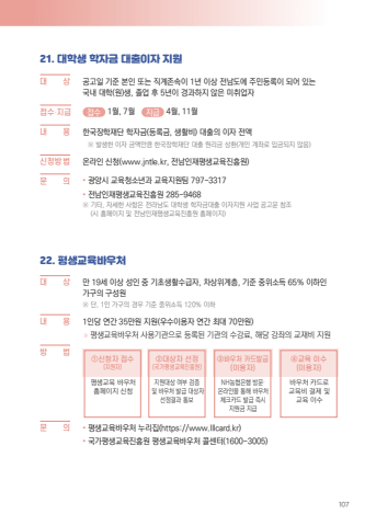 10721. %ub300%ud559%uc0dd %ud559%uc790%uae08 %ub300%ucd9c%uc774%uc790 %uc9c0%uc6d0%ub300%u0009 %uc0c1 %uacf5%uace0%uc77c %uae30%uc900 %ubcf8%uc778 %ub610%ub294 %uc9c1%uacc4%uc874%uc18d%uc774 1%ub144 %uc774%uc0c1 %uc804%ub0a8%ub3c4%uc5d0 %uc8fc%ubbfc%ub4f1%ub85d%uc774 %ub418%uc5b4 %uc788%ub294 %uad6d%ub0b4 %ub300%ud559(%uc6d0)%uc0dd, %uc878%uc5c5 %ud6c4 5%ub144%uc774 %uacbd%uacfc%ud558%uc9c0 %uc54a%uc740 %ubbf8%ucde8%uc5c5%uc790%uc811%uc218%u00b7%uc9c0%uae09 %uc811%uc218 1%uc6d4, 7%uc6d4 %uc9c0%uae09 4%uc6d4, 11%uc6d4%ub0b4 %uc6a9 %ud55c%uad6d%uc7a5%ud559%uc7ac%ub2e8 %ud559%uc790%uae08(%ub4f1%ub85d%uae08, %uc0dd%ud65c%ube44) %ub300%ucd9c%uc758 %uc774%uc790 %uc804%uc561 %u203b %ubc1c%uc0dd%ud55c %uc774%uc790 %uae08%uc561%ub9cc%ud07c %ud55c%uad6d%uc7a5%ud559%uc7ac%ub2e8 %ub300%ucd9c %uc6d0%ub9ac%uae08 %uc0c1%ud658(%uac1c%uc778 %uacc4%uc88c%ub85c %uc785%uae08%ub418%uc9c0 %uc54a%uc74c)%uc2e0%uccad%ubc29%u0009%ubc95 %uc628%ub77c%uc778 %uc2e0%uccad(www.jntle.kr, %uc804%ub0a8%uc778%uc7ac%ud3c9%uc0dd%uad50%uc721%uc9c4%ud765%uc6d0)%ubb38%u0009 %uc758 %u2022 %uad11%uc591%uc2dc %uad50%uc721%uccad%uc18c%ub144%uacfc %uad50%uc721%uc9c0%uc6d0%ud300 797-3317%u2022 %uc804%ub0a8%uc778%uc7ac%ud3c9%uc0dd%uad50%uc721%uc9c4%ud765%uc6d0 285-9468%u203b %uae30%ud0c0, %uc790%uc138%ud55c %uc0ac%ud56d%uc740 %uc804%ub77c%ub0a8%ub3c4 %ub300%ud559%uc0dd %ud559%uc790%uae08%ub300%ucd9c %uc774%uc790%uc9c0%uc6d0 %uc0ac%uc5c5 %uacf5%uace0%ubb38 %ucc38%uc870(%uc2dc %ud648%ud398%uc774%uc9c0 %ubc0f %uc804%ub0a8%uc778%uc7ac%ud3c9%uc0dd%uad50%uc721%uc9c4%ud765%uc6d0 %ud648%ud398%uc774%uc9c0)22. %ud3c9%uc0dd%uad50%uc721%ubc14%uc6b0%ucc98%ub300 %u0009 %uc0c1 %ub9cc 19%uc138 %uc774%uc0c1 %uc131%uc778 %uc911 %uae30%ucd08%uc0dd%ud65c%uc218%uae09%uc790, %ucc28%uc0c1%uc704%uacc4%uce35, %uae30%uc900 %uc911%uc704%uc18c%ub4dd 65% %uc774%ud558%uc778 %uac00%uad6c%uc758 %uad6c%uc131%uc6d0%u203b %ub2e8, 1%uc778 %uac00%uad6c%uc758 %uacbd%uc6b0 %uae30%uc900 %uc911%uc704%uc18c%ub4dd 120% %uc774%ud558%ub0b4%u0009 %uc6a9 1%uc778%ub2f9 %uc5f0%uac04 35%ub9cc%uc6d0 %uc9c0%uc6d0(%uc6b0%uc218%uc774%uc6a9%uc790 %uc5f0%uac04 %ucd5c%ub300 70%ub9cc%uc6d0)%u00bb %ud3c9%uc0dd%uad50%uc721%ubc14%uc6b0%ucc98 %uc0ac%uc6a9%uae30%uad00%uc73c%ub85c %ub4f1%ub85d%ub41c %uae30%uad00%uc758 %uc218%uac15%ub8cc, %ud574%ub2f9 %uac15%uc88c%uc758 %uad50%uc7ac%ube44 %uc9c0%uc6d0%ubc29%u0009 %ubc95 %ubb38%u0009 %uc758 %u2022 %ud3c9%uc0dd%uad50%uc721%ubc14%uc6b0%ucc98 %ub204%ub9ac%uc9d1(https://www.lllcard.kr)%u2022 %uad6d%uac00%ud3c9%uc0dd%uad50%uc721%uc9c4%ud765%uc6d0 %ud3c9%uc0dd%uad50%uc721%ubc14%uc6b0%ucc98 %ucf5c%uc13c%ud130(1600-3005)%u2460%uc2e0%uccad%uc790 %uc811%uc218(%uc9c0%uc6d0%uc790)%ud3c9%uc0dd%uad50%uc721 %ubc14%uc6b0%ucc98 %ud648%ud398%uc774%uc9c0 %uc2e0%uccad%u2461%ub300%uc0c1%uc790 %uc120%uc815(%uad6d%uac00%ud3c9%uc0dd%uad50%uc721%uc9c4%ud765%uc6d0)%uc9c0%uc6d0%ub300%uc0c1 %uc5ec%ubd80 %uac80%uc99d %ubc0f %ubc14%uc6b0%ucc98 %ubc1c%uae09 %ub300%uc0c1%uc790 %uc120%uc815%uacb0%uacfc %ud1b5%ubcf4%u2462%ubc14%uc6b0%ucc98 %uce74%ub4dc%ubc1c%uae09(%uc774%uc6a9%uc790)NH%ub18d%ud611%uc740%ud589 %ubc29%ubb38%u00b7%uc628%ub77c%uc778%uc744 %ud1b5%ud574 %ubc14%uc6b0%ucc98 %uccb4%ud06c%uce74%ub4dc %ubc1c%uae09 %uc989%uc2dc %uc9c0%uc6d0%uae08 %uc9c0%uae09%u2463%uad50%uc721 %uc774%uc218(%uc774%uc6a9%uc790)%ubc14%uc6b0%ucc98 %uce74%ub4dc%ub85c %uad50%uc721%ube44 %uacb0%uc81c %ubc0f %uad50%uc721 %uc774%uc218