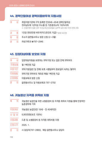 2025 %uad11%uc591%uc2dc %uc0dd%uc560%ubcf5%uc9c0%uc815%ucc45 %uc548%ub0b4%uc11c11844. %uacbd%ub825%ub2e8%uc808%uc5ec%uc131 %uacbd%ub825%uc774%uc74c%ubc14%uc6b0%ucc98 %uc9c0%uc6d0%uc0ac%uc5c5%ub300%u0009 %uc0c1 %ucde8%uc5c5%uc9c0%uc6d0%uae30%uad00%uc5d0 %uad6c%uc9c1 %ub4f1%ub85d%ud55c %ub9cc30%uc138%u223c65%uc138 %uacbd%ub825%ub2e8%uc808%uc5ec%uc131%uc804%ub77c%ub0a8%ub3c4%uc5d0 1%ub144%uc774%uc0c1 %uc8fc%uc18c%ub97c %ub454 %uae30%uc900%uc911%uc704%uc18c%ub4dd 150%%uc774%ud558%u203b %uc2e0%uccad%uc778%uc6d0%uc774 %ub9ce%uc744 %uacbd%uc6b0 %uc6b0%uc120%uc21c%uc704(%uac74%uac15%ubcf4%ud5d8%ub8cc %ub0a9%ubd80%uc561 %ub0ae%uc740%uc0ac%ub78c %uc6b0%uc120) %ubc18%uc601 %uc120%uc815%ub0b4%u0009 %uc6a9 1%uc778%ub2f9 %uc5f050%ub9cc%uc6d0 %ubc14%uc6b0%ucc98%uce74%ub4dc(%ud3ec%uc778%ud2b8 %uc9c0%uae09) *%uc0dd%uc5601%ud68c%uc9c0%uc6d0%ubc29%u0009 %ubc95 %uc8fc%uc18c%uc9c0 %uc74d%uba74%ub3d9%uc0ac%ubb34%uc18c %ubc29%ubb38 %uc2e0%uccad (2%u223c3%uc6d4)%ubb38%u0009 %uc758 %uc5ec%uc131%uac00%uc871%uacfc %u260e797-294645. %uc785%uc591%ub300%uc0c1%uc544%ub3d9 %ubcf4%ud638%ube44 %uc9c0%uc6d0%ub300 %u0009 %uc0c1 %uc785%uc591%ub300%uc0c1%uc544%ub3d9%uc744 %ubcf4%ud638%ud558%ub294 %uc704%ud0c1%uac00%uc815 %ub610%ub294 %uc785%uc591 %uc804%uc81c %uc704%ud0c1%ubd80%ubaa8%u0009%uc9c0%uc6d0%ub0b4%uc6a9 %uc6d4 1%ubc31%ub9cc%uc6d0 %uc9c0%uae09%uc9c0%uc6d0%uae30%uac04%u0009 %uc704%ud0c1%uac00%uc815(%uc77c%ubc18 %ubc0f %uc804%uc81c) %ubcf4%ud638 %uc2dc%ud589%uc77c%ubd80%ud130 %uc885%ub8cc%uc77c%uc774 %uc18d%ud558%ub294 %uc6d4%uae4c%uc9c0%uc9c0%uc6d0%ubc29%ubc95%u0009 %uc704%ud0c1%uac00%uc815 %uc704%ud0c1%ubd80%ubaa8 %uacc4%uc88c%ub85c %ub9e4%uc6d4 1%ubc31%ub9cc%uc6d0 %uc9c0%uae09%uc2e0%uccad%ubc29%ubc95%u0009 %uc544%ub3d9%ubcf4%uc721%uacfc %ubc29%ubb38 %uc2e0%uccad%ubb38%u0009 %uc758 %uc74d%uba74%ub3d9%uc0ac%ubb34%uc18c %ubc0f %uc544%ub3d9%ubcf4%uc721%uacfc 797-375046. %uadc0%ub18d%uccad%ub144 %uc790%uaca9%uc99d %ucde8%ub4dd%ube44 %uc9c0%uc6d0%ubaa9%u0009 %uc801 %uadc0%ub18d%uccad%ub144 %ub18d%uc5c5%uc778%uc744 %uc704%ud55c %uc18c%ud615%uc911%uc7a5%ube44 %ub4f1 %uc790%uaca9%uc99d %ucde8%ub4dd%ube44 %uc9c0%uc6d0%uc744 %ud1b5%ud574 %uc548%uc815%uc801%uc778 %ub18d%ucd0c%uc815%ucc29%uc5d0 %uae30%uc5ec%uc9c0%uc6d0%ub300%uc0c1%u0009 %uadc0%ub18d%uccad%ub144 %ub18d%uc5c5%uc778(%ub9cc 18%uc138 ~ %ub9cc 45%uc138%ubbf8%ub9cc)%uc0ac %uc5c5 %ube44%u0009 9,900%ucc9c%uc6d0(%ubcf4%uc870 100%)%uc0ac%uc5c5%ub0b4%uc6a9%u0009 %ub4dc%ub860 %ubc0f %uc18c%ud615%uc911%uc7a5%ube44 %ub4f1 %uc790%uaca9%uc99d %ucde8%ub4dd%ube44%uc6a9 %uc9c0%uc6d0%uc2e0%uccad%uc2dc%uae30%u0009 2025. 1.%ubb38 %uc758 %uc2dc %ub2f4%ub2f9%uc790(797-2883), %ud574%ub2f9 %uc74d%uba74%ub3d9%uc0ac%ubb34%uc18c %ub2f4%ub2f9%uc790