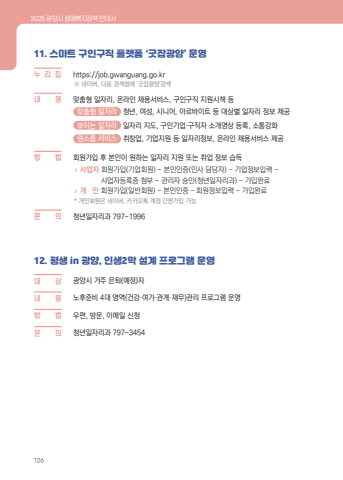 2025 %uad11%uc591%uc2dc %uc0dd%uc560%ubcf5%uc9c0%uc815%ucc45 %uc548%ub0b4%uc11c12611. %uc2a4%ub9c8%ud2b8 %uad6c%uc778%uad6c%uc9c1 %ud50c%ub7ab%ud3fc %u2018%uad7f%uc7a1%uad11%uc591%u2019 %uc6b4%uc601 %ub204 %ub9ac %uc9d1%u0009 https://job.gwanguang.go.kr%u203b %ub124%uc774%ubc84, %ub2e4%uc74c %uac80%uc0c9%ucc3d%uc5d0 '%uad7f%uc7a1%uad11%uc591'%uac80%uc0c9%ub0b4%u0009 %uc6a9 %ub9de%ucda4%ud615 %uc77c%uc790%ub9ac, %uc628%ub77c%uc778 %ucc44%uc6a9%uc11c%ube44%uc2a4, %uad6c%uc778%uad6c%uc9c1 %uc9c0%uc6d0%uc2dc%ucc45 %ub4f1 %ub9de%ucda4%ud615 %uc77c%uc790%ub9ac %uccad%ub144, %uc5ec%uc131, %uc2dc%ub2c8%uc5b4, %uc544%ub974%ubc14%uc774%ud2b8 %ub4f1 %ub300%uc0c1%ubcc4 %uc77c%uc790%ub9ac %uc815%ubcf4 %uc81c%uacf5 %ubcf4%uc774%ub294 %uc77c%uc790%ub9ac %uc77c%uc790%ub9ac %uc9c0%ub3c4, %uad6c%uc778%uae30%uc5c5%u00b7%uad6c%uc9c1%uc790 %uc18c%uac1c%uc601%uc0c1 %ub4f1%ub85d, %uc18c%ud1b5%uac15%ud654 %uc6d0%uc2a4%ud1b1 %uc11c%ube44%uc2a4 %ucde8%ucc3d%uc5c5, %uae30%uc5c5%uc9c0%uc6d0 %ub4f1 %uc77c%uc790%ub9ac%uc815%ubcf4, %uc628%ub77c%uc778 %ucc44%uc6a9%uc11c%ube44%uc2a4 %uc81c%uacf5%ubc29%u0009 %ubc95 %ud68c%uc6d0%uac00%uc785 %ud6c4 %ubcf8%uc778%uc774 %uc6d0%ud558%ub294 %uc77c%uc790%ub9ac %uc9c0%uc6d0 %ub610%ub294 %ucde8%uc5c5 %uc815%ubcf4 %uc2b5%ub4dd%u00bb %uc0ac%uc5c5%uc790 %ud68c%uc6d0%uac00%uc785(%uae30%uc5c5%ud68c%uc6d0) - %ubcf8%uc778%uc778%uc99d(%uc778%uc0ac %ub2f4%ub2f9%uc790) - %uae30%uc5c5%uc815%ubcf4%uc785%ub825 -%uc0ac%uc5c5%uc790%ub4f1%ub85d%uc99d %ucca8%ubd80 - %uad00%ub9ac%uc790 %uc2b9%uc778(%uccad%ub144%uc77c%uc790%ub9ac%uacfc) - %uac00%uc785%uc644%ub8cc%u00bb %uac1c %uc778 %ud68c%uc6d0%uac00%uc785(%uc77c%ubc18%ud68c%uc6d0) - %ubcf8%uc778%uc778%uc99d %u2013 %ud68c%uc6d0%uc815%ubcf4%uc785%ub825 - %uac00%uc785%uc644%ub8cc* %uac1c%uc778%ud68c%uc6d0%uc740 %ub124%uc774%ubc84, %uce74%uce74%uc624%ud1a1 %uacc4%uc815 %uac04%ud3b8%uac00%uc785 %uac00%ub2a5%ubb38%u0009 %uc758 %uccad%ub144%uc77c%uc790%ub9ac%uacfc 797-199612. %ud3c9%uc0dd in %uad11%uc591, %uc778%uc0dd2%ub9c9 %uc124%uacc4 %ud504%ub85c%uadf8%ub7a8 %uc6b4%uc601 %ub300%u0009 %uc0c1 %uad11%uc591%uc2dc %uac70%uc8fc %uc740%ud1f4(%uc608%uc815)%uc790%ub0b4%u0009 %uc6a9 %ub178%ud6c4%uc900%ube44 4%ub300 %uc601%uc5ed(%uac74%uac15%u00b7%uc5ec%uac00%u00b7%uad00%uacc4%u00b7%uc7ac%ubb34)%uad00%ub9ac %ud504%ub85c%uadf8%ub7a8 %uc6b4%uc601%ubc29%u0009 %ubc95 %uc6b0%ud3b8, %ubc29%ubb38, %uc774%uba54%uc77c %uc2e0%uccad%ubb38%u0009 %uc758 %uccad%ub144%uc77c%uc790%ub9ac%uacfc 797-3454