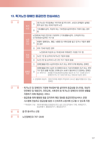 12713. %ub3c5%uac70%ub178%uc778%u00b7%uc7a5%uc560%uc778 %uc751%uae09%uc548%uc804 %uc548%uc2ec%uc11c%ube44%uc2a4%ub300 %u0009 %uc0c1%ub3c5%uac70%ub178%uc778%u2460 (%ub3c5%uac70%ub178%uc778) %uc8fc%ubbfc%ub4f1%ub85d%uc0c1 %uac70%uc8fc%uc9c0%uc640 %ub3d9%uac70%uc790 %uc720%ubb34, %uc18c%ub4dd%uacfc %uad00%uacc4%uc5c6%uc774 %uc2e4%uc81c%ub85c %ud63c%uc790 %uc0b4%uace0 %uc788%ub294 65%uc138 %uc774%uc0c1%uc758 %ub178%uc778%u2461 %uae30%ucd08%uc0dd%ud65c%uc218%uae09%uc790, %ucc28%uc0c1%uc704 %ub610%ub294 %uae30%ucd08%uc5f0%uae08%uc218%uae09%uc790%uc774%uba74%uc11c %uac00%uc871%uc774 %uc5c6%ub294 %uacbd%uc6b0 %ub4f1%ub178%uc7782%uc778%uac00%uad6c%ub178%uc778(65%uc138 %uc774%uc0c1) 2%uc778%uc73c%ub85c %uad6c%uc131%ub418%uba70 %u2460%uae30%ucd08%uc0dd%ud65c%uc218%uae09%uc790, %u2461%ucc28%uc0c1%uc704 %ub610%ub294%u2462%uae30%ucd08%uc5f0%uae08%uc218%uae09%uc790%uc778 %uac00%uad6c %uc911%u2460 %ud55c%uba85%uc774 %uc9c8%ud658(%ub2f9%ub1e8, %ud608%uc555, %ub1cc%uc878%uc911 %ubc0f %uce58%ub9e4 %ub4f1)%uc744 %uc553%uace0 %uc788%uac70%ub098 %uac70%ub3d9%uc774 %ubd88%ud3b8%ud55c %uacbd%uc6b0%u2461 %ubaa8%ub450 75%uc138 %uc774%uc0c1%uc778 %uacbd%uc6b0%uc870%uc190%uac00%uad6c%ub178%uc778(65%uc138 %uc774%uc0c1)%uacfc %uc190%u00b7%uc790%ub140(24%uc138 %uc774%ud558)%ub85c%ub9cc %uad6c%uc131%ub41c %uac00%uad6c %uc911%u2460 (%ub178%uc778 1%uc778 %ubc0f %uc190%uc790%ub140) %ub3c5%uac70%ub178%uc778 %uae30%uc900%uacfc %ub3d9%uc77c%u2461 (%ub178%uc778 2%uc778 %ubc0f %uc190%uc790%ub140) %ub178%uc778 2%uc778 %uac00%uad6c %uae30%uc900%uacfc %ub3d9%uc77c%uc7a5%uc560%uc778%uac00%uad6c%u2460 %uc7a5%uc560%uc778%ud65c%ub3d9%uc9c0%uc6d0 %uc218%uae09%uc790%uc774%uba74%uc11c %ub3c5%uac70 %ub610%ub294 %ucde8%uc57d%uac00%uad6c%uc5d0 %ud574%ub2f9%ud558%ub294 %uc7a5%uc560%uc778%u2461%uc7a5%uc560%uc778%ud65c%ub3d9%uc9c0%uc6d0 %uc218%uae09%uc790 %uc678 %uc7a5%uc560%uc778%uc73c%ub85c%uc11c %uae30%ucd08%uc9c0%uc790%uccb4%uc7a5%uc774 %ub3c5%uac70 %ub610%ub294 %ucde8%uc57d%uac00%uad6c %ub4f1%uc758 %uc0dd%ud65c %uc5ec%uac74%uc744 %uace0%ub824%ud574 %uc0c1%uc2dc %ubcf4%ud638%uac00 %ud544%uc694%ud558%ub2e4%uace0 %uc778%uc815%ud558%ub294 %uc7a5%uc560%uc778(%u203b %ucde8%uc57d%uac00%uad6c : %uc138%ub300%ubcc4 %uc8fc%ubbfc%ub4f1%ub85d%ud45c%uc5d0 %ub4f1%uc7ac%ub41c %ub300%uc0c1%uc790 %uc678 %uac00%uad6c %uad6c%uc131%uc6d0 %ubaa8%ub450%uac00 %uc7a5%uc560%uc778%uc774%uac70%ub098 %ub9cc 18%uc138 %uc774%ud558 %ub610%ub294 %ub9cc65%uc138 %uc774%uc0c1%uc778 %uacbd%uc6b0)%u203b %uc120%uc815%uc81c%uc678 %ub300%uc0c1%uc790 : %uc815%ubd80(%uc9c0%uc790%uccb4) %uc7ac%uc815%uc774 %ud22c%uc785%ub418%uc5b4 24%uc2dc%uac04 %ud65c%ub3d9%uc9c0%uc6d0%uc744 %ubc1b%uace0 %uc788%ub294 %uc7a5%uc560%uc778%ub0b4 %u0009 %uc6a9 %u2022 %ub3c5%uac70%ub178%uc778 %ubc0f %uc7a5%uc560%uc778%uc758 %uac00%uc815%uc5d0 %ub301%ub0b4%uc7a5%ube44*%ub97c %uc124%uce58%ud558%uc5ec %uc751%uae09%uc0c1%ud669 %ubaa8%ub2c8%ud130%ub9c1, %ub300%uc0c1%uc790 %uc548%uc804%ud655%uc778 %ubc0f %ub300%uc751%uc870%uce58, %uc548%uc804%uad50%uc721, %uc0ac%ud6c4%uad00%ub9ac %ub4f1 %ub3c5%uac70%ub178%uc778 %uc7a5%uc560%uc778%uc758 %uc548%uc804%ud55c %uc0dd%ud65c%uc744 %uc9c0%uc6d0%ud558%uae30 %uc704%ud574 %uc81c%uacf5%ub418%ub294 %uc11c%ube44%uc2a4%u2022 %uc751%uae09%ud638%ucd9c%u00b7%ud654%uc7ac%u00b7%ud65c%ub3d9%ub7c9 %ub4f1%uc744 %uac10%uc9c0%ud558%uc5ec %ud574%ub2f9 %uc815%ubcf4%ub97c %uc751%uae09%uc548%uc804%uc548%uc2ec%uc11c%ube44%uc2a4 %uc6b4%uc601 %uc2dc%uc2a4%ud15c%uc5d0 %uc804%uc1a1%ud558%uace0 %uc751%uae09%uc0c1%ud669 %ubc1c%uc0dd %uc2dc %uc2e0%uc18d%ud558%uac8c %uc18c%ubc29%uc11c%uc5d0 %uc2e0%uace0%ud560 %uc218 %uc788%ub3c4%ub85d %uc9c0%uc6d0 * %ub301%ub0b4%uc7a5%ube44 %uad6c%uc131 : %uac8c%uc774%ud2b8%uc6e8%uc774(%ud1b5%uc2e0%ub2e8%ub9d0%uc7a5%uce58/%uc870%ub3c4%u00b7%uc2b5%ub3c4%u00b7%uc628%ub3c4%uac10%uc9c0%uc13c%uc11c %uae30%uacc4), %ud654%uc7ac%uac10%uc9c0%uae30, %uc751%uae09%ud638%ucd9c%uae30, %ud65c%ub3d9%ub7c9%uac10%uc9c0%uae30, %ucd9c%uc785%ubb38%uac10%uc9c0%uae30%ubc29%u0009 %ubc95 %uc74d%u00b7%uba74%u00b7%ub3d9%uc0ac%ubb34%uc18c %uc2e0%uccad%ubb38 %u0009 %uc758 %ub178%uc778%uc7a5%uc560%uc778%uacfc 797-2649