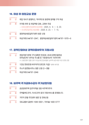 12916. %uc5ec%uc131 %ucde8%u00b7%ucc3d%uc5c5%uad50%uc2e4 %uc6b4%uc601%ub300%u0009 %uc0c1 %ucde8%uc5c5 %uc758%uc0ac%uac00 %ubd84%uba85%ud558%uace0, %uc801%uadf9%uc801%uc73c%ub85c %ud6c8%ub828%uc5d0 %ucc38%uc5ec%ud560 %uad6c%uc9c1 %uc5ec%uc131%ub0b4%u0009 %uc6a9 %uc790%uaca9%uc99d %ucde8%ub4dd %ubc0f %ucde8%uc5c5%uc5ed%ub7c9 %uac15%ud654, %uad50%uc721%ube44 %ubb34%ub8cc%u00bb %uc0b0%ubaa8%uc2e0%uc0dd%uc544%uac74%uac15%uad00%ub9ac%uc0ac(20%uba85) : 2025. 6. 9. %u223c 6. 20.%u00bb %uc2dc%ub2c8%uc5b4%uac74%uac15%uc9c0%ub3c4%uc0ac(20%uba85) : 2025. 6. 23. %u223c 7. 15.%ubc29%u0009 %ubc95 %uad11%uc591%uc5ec%uc131%uc0c8%ub85c%uc77c%ud558%uae30%uc13c%ud130 %ubc29%ubb38 %uc2e0%uccad%ubb38 %u0009 %uc758 %uc5ec%uc131%uac00%uc871%uacfc %u260e797-2947, %uad11%uc591%uc5ec%uc131%uc0c8%ub85c%uc77c%ud558%uae30%uc13c%ud130 %u260e797-1970%u223c617. %uacbd%ub825%ub2e8%uc808%uc5ec%uc131 %uacbd%ub825%uc774%uc74c%ubc14%uc6b0%ucc98 %uc9c0%uc6d0%uc0ac%uc5c5%ub300%u0009 %uc0c1 %ucde8%uc5c5%uc9c0%uc6d0%uae30%uad00%uc5d0 %uad6c%uc9c1 %ub4f1%ub85d%ud55c %ub9cc30%uc138%u223c65%uc138 %uacbd%ub825%ub2e8%uc808%uc5ec%uc131%uc804%ub77c%ub0a8%ub3c4%uc5d0 1%ub144%uc774%uc0c1 %uc8fc%uc18c%ub97c %ub454 %uae30%uc900%uc911%uc704%uc18c%ub4dd 150%%uc774%ud558%u203b %uc2e0%uccad%uc778%uc6d0%uc774 %ub9ce%uc744 %uacbd%uc6b0 %uc6b0%uc120%uc21c%uc704(%uac74%uac15%ubcf4%ud5d8%ub8cc %ub0a9%ubd80%uc561 %ub0ae%uc740%uc0ac%ub78c %uc6b0%uc120) %ubc18%uc601 %uc120%uc815%ub0b4%u0009 %uc6a9 1%uc778%ub2f9 %uc5f050%ub9cc%uc6d0 %ubc14%uc6b0%ucc98%uce74%ub4dc(%ud3ec%uc778%ud2b8 %uc9c0%uae09) *%uc0dd%uc5601%ud68c%uc9c0%uc6d0%ubc29%u0009 %ubc95 %uc8fc%uc18c%uc9c0 %uc74d%uba74%ub3d9%uc0ac%ubb34%uc18c %ubc29%ubb38 %uc2e0%uccad (2%u223c3%uc6d4)%ubb38%u0009 %uc758 %uc5ec%uc131%uac00%uc871%uacfc %u260e797-294618. %ube44%uc8fc%ud0dd %uc8fc%uac70%uae09%uc5ec%uc218%uae09%uc790 %uc8fc%uac70%uc0c1%ud5a5%uc9c0%uc6d0%ub300%u0009 %uc0c1 %uacf5%uacf5%uc784%ub300%uc8fc%ud0dd %uc785%uc8fc%uc790%uaca9%uc744 %uac16%ucd98 %ube44%uc8fc%ud0dd%uac70%uc8fc%uc790%ub0b4%u0009 %uc6a9 %uc8fc%ud0dd%ubb3c%uc0c9%ub3c4%uc6b0%ubbf8, %uc774%uc0ac%ub3c4%uc6b0%ubbf8 %ub4f1%uc758 %uc9c0%uc6d0%uc11c%ube44%uc2a4%ub97c %uc6b4%uc601%ud569%ub2c8%ub2e4.%ubc29%u0009 %ubc95 %uac70%uc8fc%uc9c0 %uad00%ud560 %uc8fc%ubbfc%uc13c%ud130 %ubc29%ubb38 %ubc0f %uc804%ud654%uc2e0%uccad%ubb38%u0009 %uc758 %uad6d%ud1a0%uad50%ud1b5%ubd80 %ucf5c%uc13c%ud130 1599-0001 / %ub9c8%uc774%ud648 1600-0777