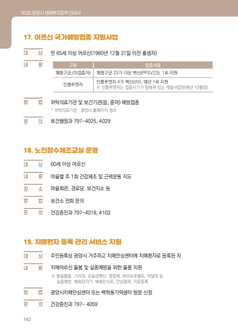 2025 %uad11%uc591%uc2dc %uc0dd%uc560%ubcf5%uc9c0%uc815%ucc45 %uc548%ub0b4%uc11c14217. %uc5b4%ub974%uc2e0 %uad6d%uac00%uc608%ubc29%uc811%uc885 %uc9c0%uc6d0%uc0ac%uc5c5%ub300 %u0009 %uc0c1 %ub9cc 65%uc138 %uc774%uc0c1 %uc5b4%ub974%uc2e0(1960%ub144 12%uc6d4 31%uc77c %uc774%uc804 %ucd9c%uc0dd%uc790)%ub0b4%u0009 %uc6a9 %uad6c%ubd84 %uc811%uc885%ub0b4%uc6a9%ud3d0%ub834%uad6c%uade0 (%ubbf8%uc811%uc885%uc790) %ud3d0%ub834%uad6c%uade0 23%uac00 %ub2e4%ub2f9 %ubc31%uc2e0(PPSV23), 1%ud68c %uc9c0%uc6d0%uc778%ud50c%ub8e8%uc5d4%uc790 %uc778%ud50c%ub8e8%uc5d4%uc790 4%uac00 %ubc31%uc2e0(IIV), %ub9e4%ub144 1%ud68c %uc9c0%uc6d0%u203b %uc778%ud50c%ub8e8%uc5d4%uc790%ub294 %uc811%uc885%uc2dc%uae30%uac00 %uc815%ud574%uc838 %uc788%ub294 %uacc4%uc808%uc0ac%uc5c5%uc784(%ub9e4%ub144 10%uc6d4%uacbd)%ubc29%u0009 %ubc95 %uc704%ud0c1%uc758%ub8cc%uae30%uad00 %ubc0f %ubcf4%uac74%uae30%uad00(%uc74d, %uc911%ub9c8) %uc608%ubc29%uc811%uc885* %uc704%ud0c1%uc758%ub8cc%uae30%uad00 : %uad11%uc591%uc2dc %ud648%ud398%uc774%uc9c0 %ucc38%uc870%ubb38 %u0009 %uc758 %ubcf4%uac74%ud589%uc815%uacfc 797-4025, 402918. %ub178%uc778%uc7a5%uc218%uccb4%uc870%uad50%uc2e4 %uc6b4%uc601%ub300%u0009 %uc0c1 60%uc138 %uc774%uc0c1 %uc5b4%ub974%uc2e0%ub0b4 %u0009 %uc6a9 %ub9c8%uc744%ubcc4 %uc8fc 1%ud68c %uac74%uac15%uccb4%uc870 %ubc0f %uadfc%ub825%uc6b4%ub3d9 %uc9c0%ub3c4%uc7a5 %u0009 %uc18c %ub9c8%uc744%ud68c%uad00, %uacbd%ub85c%ub2f9, %ubcf4%uac74%uc9c0%uc18c %ub4f1%ubc29 %u0009 %ubc95 %ubcf4%uac74%uc18c %uc804%ud654 %ubb38%uc758%ubb38 %u0009 %uc758 %uac74%uac15%uc99d%uc9c4%uacfc 797-4018, 410319. %uce58%ub9e4%ud658%uc790 %ub4f1%ub85d %uad00%ub9ac %uc11c%ube44%uc2a4 %uc9c0%uc6d0%ub300%u0009 %uc0c1 %uc8fc%ubbfc%ub4f1%ub85d%uc0c1 %uad11%uc591%uc2dc %uac70%uc8fc%ud558%uace0 %uce58%ub9e4%uc548%uc2ec%uc13c%ud130%uc5d0 %uce58%ub9e4%ud658%uc790%ub85c %ub4f1%ub85d%ub41c %uc790%ub0b4%u0009 %uc6a9 %uce58%ub9e4%uc5b4%ub974%uc2e0 %ub3cc%ubd04 %ubc0f %uc2e4%uc885%uc608%ubc29%uc744 %uc704%ud55c %ubb3c%ud488 %uc9c0%uc6d0%u203b %ub3cc%ubd04%ubb3c%ud488: %uae30%uc800%uadc0, %uc694%uc2e4%uae08%ud32c%ud2f0, %uc601%uc591%uc81c, %ud5c8%ub9ac%ubcf4%ud638%ubca8%ud2b8, %uc57d%ub2ec%ub825 %ub4f1%uc2e4%uc885%uc608%ubc29: %ubc30%ud68c%uac10%uc9c0%uae30, %ubc30%ud68c%uc778%uc2dd%ud45c, %uc548%uc2ec%ud314%ucc0c, %uc9c0%ubb38%ub4f1%ub85d%ubc29%u0009 %ubc95 %uad11%uc591%uc2dc%uce58%ub9e4%uc548%uc2ec%uc13c%ud130 %ub610%ub294 %ubc31%ud559%ub3d9%uae30%uc5b5%uc0d8%ud130 %ubc29%ubb38 %uc2e0%uccad%ubb38 %u0009 %uc758 %uac74%uac15%uc99d%uc9c4%uacfc 797- 4059