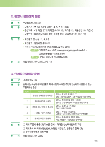 1552. %uad11%uc591%uc2dc %ubb38%ud654%ub300%ud559 %uc6b4%uc601%ub300 %u0009 %uc0c1 %uc8fc%ubbfc%ub4f1%ub85d%uc0c1 %uad11%uc591%uc2dc%ubbfc%ub0b4 %u0009 %uc6a9 %u2022 %uc6b4%uc601%uae30%uac04 : %uc5f0 3%uae30, 3%uac1c%uc6d4 %uacfc%uc815(1~4, 5~7, 9~11%uc6d4)%u2022 %uc6b4%uc601%uacfc%ubaa9 : 4%uac1c %uacfc%uc815, 37%uac1c %uacfc%ubaa9(%ubb38%ud654%ucde8%ubbf8 10, %uc790%uaca9%uc99d 13, %uae30%uc220%ucc3d%uc5c5 10, %uc57c%uac04 4)%u2022 %uc6b4%uc601%uc778%uc6d0 : 688%uba85(%ubb38%ud654%ucde8%ubbf8 192, %uc790%uaca9%uc99d 231, %uae30%uc220%ucc3d%uc5c5 185, %uc57c%uac04 80)%ubc29%u0009 %ubc95 %u2022 %ubaa8%uc9d1%uacf5%uace0 %ubc0f %uc2e0%uccad : 1, 4, 8%uc6d4%u2022 %ubaa8%uc9d1%uacf5%uace0 : %uad11%uc591%uc2dc%uccad %ud648%ud398%uc774%uc9c0%u2022 %uc2e0%uccad : %uc120%ucc29%uc21c(%ubaa8%uc9d1%uc815%uc6d0%uc758 %uc628%ub77c%uc778 80% & %ubc29%ubb38 20%) %uc628%ub77c%uc778 %u2018%ud3c9%uc0dd%ud559%uc2b5%ub3c4%uc2dc %uad11%uc591(www.gwangyang.go.kr/edu)%u2019%u2192%uac15%uc758%uc548%ub0b4/%uc2e0%uccad%u2192%uc5ec%uc131%ubb38%ud654%uc13c%ud130 %ubc29 %ubb38 %uad11%uc591%uc2dc %uc5ec%uc131%ubb38%ud654%uc13c%ud130(%uc81c%ucca0%ub85c 69)%ubb38%u0009 %uc758 %uc5ec%uc131%uac00%uc871%uacfc 797-2347, 2781~33. %uc548%uc2ec%ubb34%uc778%ud0dd%ubc30%ud568 %uc6b4%uc601%ub300 %u0009 %uc0c1 %uad11%uc591%uc2dc%ubbfc %ub204%uad6c%ub098%ub0b4 %u0009 %uc6a9 %ud63c%uc790 %uc0ac%ub294 %uc5ec%uc131%uc774%ub098 %uc9c1%uc7a5%uc0dd%ud65c%ub85c %ud0dd%ubc30 %uc218%ub839%uc774 %uc5b4%ub824%uc6b4 %uc8fc%ubbfc%uc774 %uc548%uc2ec%ud558%uace0 %uc0ac%uc6a9%ud560 %uc218 %uc788%ub294 %ubb34%uc778%ud0dd%ubc30%ud568 %uc6b4%uc601%ubc88%ud638 %ud0dd%ubc30%ud568 %uc704%uce58 %ud0dd%ubc30%uc218%ub839 %uc8fc%uc18c1 %uad11%uc591%uc74d %uc7a5%uc560%uc778%uc885%ud569%ubcf5%uc9c0%uad00 %uad11%uc591%uc2dc %uad11%uc591%uc74d %uc624%uc131%ub85c 117%uad11%uc591%uc2dc%uc7a5%uc560%uc778%uc885%ud569%ubcf5%uc9c0%uad00 %uc5ec%uc131%uc548%uc2ec%ubb34%uc778%ud0dd%ubc30%ud5682 %uc911%ub9c8%ub3d9 %uc8fc%ubbfc%uc790%uce58%uc13c%ud130 %uad11%uc591%uc2dc %uc911%ub9c8%uc911%uc559%ub85c 119-1(%uc911%ub3d9)%uc911%ub9c8%ub3d9 %uc8fc%ubbfc%uc790%uce58%uc13c%ud130 %uc5ec%uc131%uc548%uc2ec%ubb34%uc778%ud0dd%ubc30%ud5683 %uc911%ub9c8%ub3d9 %uac15%ub0a8%ubcd1%uc6d0 %ub4a4 %uc8fc%ucc28%uc7a5 %uad11%uc591%uc2dc %uae38%ud6381%uae38 17(%uc911%ub3d9) %uc5ec%uc131%uc548%uc2ec%ubb34%uc778%ud0dd%ubc30%ud5684 %uae08%ud638%ub3d9 %uc8fc%ubbfc%uc790%uce58%uc13c%ud130 %uad11%uc591%uc2dc %ud76c%ub9dd%uae38 42(%uae08%ud638%ub3d9)%uae08%ud638%ub3d9%uc8fc%ubbfc%uc790%uce58%uc13c%ud130 %uc5ec%uc131%uc548%uc2ec%ubb34%uc778%ud0dd%ubc30%ud5685 %uae08%ud638%ub3d9 %ubc31%uc6b4%uc1fc%ud551%uc13c%ud130 %uad11%uc591%uc2dc %ud3ed%ud3ec%uc0ac%ub791%uae38 99(%uae08%ud638%ub3d9)%ubc31%uc6b4%uc1fc%ud551%uc13c%ud130 %uc5ec%uc131%uc548%uc2ec%ubb34%uc778%ud0dd%ubc30%ud568%ubc29%u0009 %ubc95 %u2780 %ud0dd%ubc30 %uc8fc%ubb38%uc2dc %ubb3c%ud488%uc218%ub839%uc790%uc18c%ub97c %uc9d1%uc5d0%uc11c %uac00%uae4c%uc6b4 %uc548%uc2ec%ud0dd%ubc30%ud568%uc73c%ub85c %uc9c0%uc815%u2781 %ud0dd%ubc30%ub3c4%ucc29 %ud6c4 %ud0dd%ubc30%ubcf4%uad00%ud568%ubc88%ud638, %ubcf4%uad00%ud568 %ube44%ubc00%ubc88%ud638, %uc778%uc99d%ubc88%ud638 %ubb38%uc790 %uc218%ub839%u2782 %ubb34%uc778%ud0dd%ubc30%ud568%uc5d0%uc11c %ud0dd%ubc30 %uc218%ub839%ubb38%u0009 %uc758 %uc5ec%uc131%uac00%uc871%uacfc 797-3342