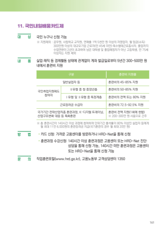 16111. %uad6d%ubbfc%ub0b4%uc77c%ubc30%uc6c0%uce74%ub4dc%uc81c%ub300 %u0009 %uc0c1 %uad6d%ubbfc %ub204%uad6c%ub098 %uc2e0%uccad %uac00%ub2a5%u203b %uc9c0%uc6d0%uc81c%uc678 : %uacf5%ubb34%uc6d0, %uc0ac%ub9bd%ud559%uad50 %uad50%uc9c1%uc6d0, %uc5f0%ub9e4%ucd9c 1%uc5b5 5%ucc9c%ub9cc %uc6d0 %uc774%uc0c1%uc758 %uc790%uc601%uc5c5%uc790, %uc6d4 %uc784%uae08(%uc18c%ub4dd)300%ub9cc%uc6d0 %uc774%uc0c1%uc758 %ub300%uaddc%ubaa8%uae30%uc5c5 %uadfc%ub85c%uc790(%ub9cc 45%uc138 %ubbf8%ub9cc)%u00b7%ud2b9%uc218%ud615%ud0dc%uadfc%ub85c%uc885%uc0ac%uc790, %uc878%uc5c5%uae4c%uc9c0 %uc218%uc5c5%uc5f0%ud55c%uc774 2%ub144%uc774 %ucd08%uacfc%ud558%uc5ec %ub0a8%uc740 %ub300%ud559%uc0dd %ubc0f %uc878%uc5c5%uc608%uc815%uc790%uac00 %uc544%ub2cc %uace0%ub4f1%ud559%uc0dd, %ub9cc 75%uc138 %uc774%uc0c1%uc790%ub294 %uc9c0%uc6d0 %uc81c%uc678%ub0b4%u0009 %uc6a9 %uc2e4%uc5c5%u00b7%uc7ac%uc9c1 %ub4f1 %uacbd%uc81c%ud65c%ub3d9 %uc0c1%ud0dc%uc5d0 %uad00%uacc4%uc5c6%uc774 %uacc4%uc88c %ubc1c%uae09%uc77c%ub85c%ubd80%ud130 5%ub144%uac04 300~500%ub9cc %uc6d0 %ub0b4%uc5d0%uc11c %ud6c8%ub828%ube44 %uc9c0%uc6d0%uad6c%ubd84 %ud6c8%ub828%ube44 %uc9c0%uc6d0%uc728%uc77c%ubc18%uc2e4%uc5c5%uc790 %ub4f1 %ud6c8%ub828%ube44%uc758 45~85% %uc9c0%uc6d0%uad6d%ubbfc%ucde8%uc5c5%uc9c0%uc6d0%uc81c%ub3c4%ucc38%uc5ec%uc790%u2161%uc720%ud615 %uc911 %uccad%u00b7%uc911%uc7a5%ub144%uce35 %ud6c8%ub828%ube44%uc758 50~85% %uc9c0%uc6d0%u2160%uc720%ud615 %ubc0f %u2161%uc720%ud615 %uc911 %ud2b9%uc815%uacc4%uce35 %ud6c8%ub828%ube44%uc758 %uc804%uc561 %ub610%ub294 80% %uc9c0%uc6d0%uadfc%ub85c%uc7a5%ub824%uae08 %uc218%uae09%uc790 %ud6c8%ub828%ube44%uc758 72.5~92.5% %uc9c0%uc6d0%uad6d%uac00%uae30%uac04%u00b7%uc804%ub7b5%uc0b0%uc5c5%uc9c1%uc885 %ud6c8%ub828%uacfc%uc815, K-%ub514%uc9c0%ud138 %ud2b8%ub808%uc774%ub2dd, %uc0b0%uc5c5%uad6c%uc870%ubcc0%ud654 %ub300%uc751 %ub4f1 %ud2b9%ud654%ud6c8%ub828%ud6c8%ub828%ube44 %uc804%uc561 %uc9c0%uc6d0(1%ud68c%uc5d0 %ud55c%ud568)%u203b 200~300%ub9cc %uc6d0 %uc0ac%uc6a9%uc73c%ub85c %uac04%uc8fc%u203b %ucd1d %ud6c8%ub828%uc2dc%uac04%uc774 140%uc2dc%uac04 %uc774%uc0c1 %uacfc%uc815%uc5d0 %ucc38%uc5ec%ud558%uba70 %ub2e8%uc704%uae30%uac04 %ucd9c%uc11d%ub960%uc774 80% %uc774%uc0c1%uc778 %uc2e4%uc5c5%uc790 %ub4f1%uc5d0%uac8c %uc6d4 %ucd5c%ub300 11%ub9cc 6,000%uc6d0%uc758 %ud6c8%ub828%uc7a5%ub824%uae08 %uc9c0%uae09(%uad6d%uae30%ud6c8%ub828%uc758 %uacbd%uc6b0 %uc6d4 %ucd5c%ub300 20%ub9cc %uc6d0)%ubc29%u0009 %ubc95 %u2022 %uce74%ub4dc %uc2e0%uccad: %uac00%uae4c%uc6b4 %uace0%uc6a9%uc13c%ud130%ub97c %ubc29%ubb38%ud558%uac70%ub098 HRD-Net%uc744 %ud1b5%ud574 %uc2e0%uccad %u2022 %ud6c8%ub828%uacfc%uc815 %uc218%uac15%uc2e0%uccad: 140%uc2dc%uac04 %uc774%uc0c1 %ud6c8%ub828%uacfc%uc815%uc740 %uace0%uc6a9%uc13c%ud130 %ub610%ub294 HRD-Net %uc9c4%ub2e8%u00b7%uc0c1%ub2f4%uc744 %ud1b5%ud574 %uc2e0%uccad %uac00%ub2a5, 140%uc2dc%uac04 %ubbf8%ub9cc %ud6c8%ub828%uacfc%uc815%uc740 %uace0%uc6a9%uc13c%ud130 %ub610%ub294 HRD-Net%uc744 %ud1b5%ud574 %uc2e0%uccad %uac00%ub2a5 %ubb38%u0009 %uc758 %uc9c1%uc5c5%ud6c8%ub828%ud3ec%ud138(www.hrd.go.kr), %uace0%uc6a9%ub178%ub3d9%ubd80 %uace0%uac1d%uc0c1%ub2f4%uc13c%ud130 1350