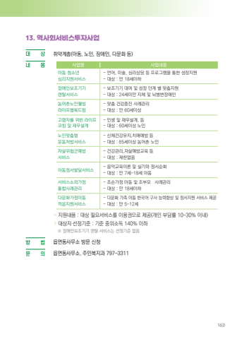 16313. %uc5ed%uc0ac%ud68c%uc11c%ube44%uc2a4%ud22c%uc790%uc0ac%uc5c5%ub300%u0009 %uc0c1 %ucde8%uc57d%uacc4%uce35(%uc544%ub3d9, %ub178%uc778, %uc7a5%uc560%uc778, %ub2e4%ubb38%ud654 %ub4f1)%ub0b4%u0009 %uc6a9 %uc0ac%uc5c5%uba85 %uc0ac%uc5c5%ub0b4%uc6a9%uc544%ub3d9%u00b7%uccad%uc18c%ub144%uc2ec%ub9ac%uc9c0%uc6d0%uc11c%ube44%uc2a4- %uc5b8%uc5b4, %ubbf8%uc220, %uc2ec%ub9ac%uc0c1%ub2f4 %ub4f1 %ud504%ub85c%uadf8%ub7a8%uc744 %ud1b5%ud55c %uc131%uc7a5%uc9c0%uc6d0- %ub300%uc0c1 : %ub9cc 18%uc138%uc774%ud558%uc7a5%uc560%uc778%ubcf4%uc870%uae30%uae30%ub80c%ud0c8%uc11c%ube44%uc2a4- %ubcf4%uc870%uae30%uae30 %ub300%uc5ec %ubc0f %uc131%uc7a5 %ub2e8%uacc4 %ubcc4 %ub9de%ucda4%uc9c0%uc6d0- %ub300%uc0c1 : 24%uc138%ubbf8%ub9cc %uc9c0%uccb4 %ubc0f %ub1cc%ubcd1%ubcc0%uc7a5%uc560%uc778%ub18d%uc5b4%ucd0c%ub178%uc778%uc6f0%ube59%ub77c%uc774%ud504%ud589%ubcf5%ub4dc%ub9bc- %ub9de%ucda4 %uac74%uac15%uc99d%uc9c4 %uc0ac%ub840%uad00%ub9ac- %ub300%uc0c1 : %ub9cc 60%uc138%uc774%uc0c1%uace0%ub839%uc790%ub97c %uc704%ud55c %ub77c%uc774%ud504 %ucf54%uce6d %ubc0f %uc7ac%ubb34%uc124%uacc4 - %uc778%uc0dd %ubc0f %uc7ac%ubb34%uc124%uacc4, %ub4f1- %ub300%uc0c1 : 60%uc138%uc774%uc0c1 %ub178%uc778%ub178%uc778%ub9de%ucda4%ud615%uc6b4%ub3d9%ucc98%ubc29%uc11c%ube44%uc2a4- %uc2e0%uccb4%uac74%uac15%uc720%uc9c0,%uce58%ub9e4%uc608%ubc29 %ub4f1- %ub300%uc0c1 : 65%uc138%uc774%uc0c1 %ub18d%uc5b4%ucd0c %ub178%uc778%uc790%uc0b4%uc704%ud5d8%uad70%uc608%ubc29%uc11c%ube44%uc2a4- %uac74%uac15%uad00%ub9ac,%uc790%uc0b4%uc608%ubc29%uad50%uc721 %ub4f1- %ub300%uc0c1 : %uc81c%ud55c%uc5c6%uc74c%uc544%ub3d9%uc815%uc11c%ubc1c%ub2ec%uc11c%ube44%uc2a4 - %uc74c%uc545%uad50%uc721%uc774%ub860 %ubc0f %uc2e4%uae30%uc640 %uc815%uc11c%uc21c%ud654- %ub300%uc0c1 : %ub9cc 7%uc138~18%uc138 %uc544%ub3d9%uc11c%ube44%uc2a4%uc18c%uc678%uac00%uc815%ud1b5%ud569%uc0ac%ub840%uad00%ub9ac- %uc870%uc190%uac00%uc815 %uc544%ub3d9 %ubc0f %uc870%ubd80%ubaa8 %uc0ac%ub840%uad00%ub9ac- %ub300%uc0c1 : %ub9cc 18%uc138%uc774%ud558%ub2e4%ubb38%ud654%uac00%uc815%uc544%ub3d9%uc801%uc751%uc9c0%uc6d0%uc11c%ube44%uc2a4- %ub2e4%ubb38%ud654 %uac00%uc871 %uc544%ub3d9 %ud55c%uad6d%uc5b4 %uad6c%uc0ac %ub2a5%ub825%ud5a5%uc0c1 %ubc0f %uc815%uc11c%uc9c0%uc6d0 %uc11c%ube44%uc2a4 %uc81c%uacf5- %ub300%uc0c1 : %ub9cc 5~12%uc138%u00bb %uc9c0%uc6d0%ub0b4%uc6a9 : %ub300%uc0c1 %ud544%uc694%uc11c%ube44%uc2a4%ub97c %uc774%uc6a9%uad8c%uc73c%ub85c %uc81c%uacf5(%uac1c%uc778 %ubd80%ub2f4%ub960 10~30% %uc774%ub0b4)%u00bb %ub300%uc0c1%uc790 %uc120%uc815%uae30%uc900 : %uae30%uc900 %uc911%uc704%uc18c%ub4dd 140% %uc774%ud558 %u203b %uc7a5%uc560%uc778%ubcf4%uc870%uae30%uae30 %ub80c%ud0c8 %uc11c%ube44%uc2a4%ub294 %uc120%uc815%uae30%uc900 %uc5c6%uc74c%ubc29%u0009 %ubc95 %uc74d%uba74%ub3d9%uc0ac%ubb34%uc18c %ubc29%ubb38 %uc2e0%uccad%ubb38%u0009 %uc758 %uc74d%uba74%ub3d9%uc0ac%ubb34%uc18c, %uc8fc%ubbfc%ubcf5%uc9c0%uacfc 797-3311