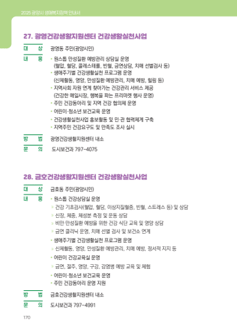 2025 %uad11%uc591%uc2dc %uc0dd%uc560%ubcf5%uc9c0%uc815%ucc45 %uc548%ub0b4%uc11c17027. %uad11%uc601%uac74%uac15%uc0dd%ud65c%uc9c0%uc6d0%uc13c%ud130 %uac74%uac15%uc0dd%ud65c%uc2e4%ucc9c%uc0ac%uc5c5%ub300%u0009 %uc0c1 %uad11%uc601%ub3d9 %uc8fc%ubbfc(%uad11%uc591%uc2dc%ubbfc)%ub0b4%u0009 %uc6a9 %u2022 %uc6d0%uc2a4%ud1b1 %ub9cc%uc131%uc9c8%ud658 %uc608%ubc29%uad00%ub9ac %uc0c1%ub2f4%uc2e4 %uc6b4%uc601(%ud608%uc555, %ud608%ub2f9, %ucf5c%ub808%uc2a4%ud14c%ub864, %ube48%ud608, %uae08%uc5f0%uc0c1%ub2f4, %uce58%ub9e4 %uc120%ubcc4%uac80%uc0ac %ub4f1)%u2022 %uc0dd%uc560%uc8fc%uae30%ubcc4 %uac74%uac15%uc0dd%ud65c%uc2e4%ucc9c %ud504%ub85c%uadf8%ub7a8 %uc6b4%uc601(%uc2e0%uccb4%ud65c%ub3d9, %uc601%uc591, %ub9cc%uc131%uc9c8%ud658 %uc608%ubc29%uad00%ub9ac, %uce58%ub9e4 %uc608%ubc29, %ud790%ub9c1 %ub4f1)%u2022 %uc9c0%uc5ed%uc0ac%ud68c %uc790%uc6d0 %uc5f0%uacc4 %ucc3e%uc544%uac00%ub294 %uac74%uac15%uad00%ub9ac %uc11c%ube44%uc2a4 %uc81c%uacf5(%uac74%uac15%ud55c %ub9e4%uc77c%uc2dc%uc7a5, %ud589%ubcf5%uc744 %ud30c%ub294 %ud504%ub9ac%ub9c8%ucf13 %ud589%uc0ac %uc6b4%uc601)%u2022 %uc8fc%ubbfc %uac74%uac15%ub3d9%uc544%ub9ac %ubc0f %uc9c0%uc5ed %uac74%uac15 %ud611%uc758%uccb4 %uc6b4%uc601%u2022 %uc5b4%ub9b0%uc774%u00b7%uccad%uc18c%ub144 %ubcf4%uac74%uad50%uc721 %uc6b4%uc601%u2022 %uac74%uac15%uc0dd%ud65c%uc2e4%ucc9c%uc0ac%uc5c5 %ud64d%ubcf4%ud65c%ub3d9 %ubc0f %ubbfc%u00b7%uad00 %ud611%ub825%uccb4%uacc4 %uad6c%ucd95%u2022 %uc9c0%uc5ed%uc8fc%ubbfc %uac74%uac15%uc694%uad6c%ub3c4 %ubc0f %ub9cc%uc871%ub3c4 %uc870%uc0ac %uc2e4%uc2dc%ubc29%u0009 %ubc95 %uad11%uc601%uac74%uac15%uc0dd%ud65c%uc9c0%uc6d0%uc13c%ud130 %ub0b4%uc18c%ubb38%u0009 %uc758 %ub3c4%uc2dc%ubcf4%uac74%uacfc 797-4075 28. %uae08%ud638%uac74%uac15%uc0dd%ud65c%uc9c0%uc6d0%uc13c%ud130 %uac74%uac15%uc0dd%ud65c%uc2e4%ucc9c%uc0ac%uc5c5%ub300 %u0009 %uc0c1 %uae08%ud638%ub3d9 %uc8fc%ubbfc(%uad11%uc591%uc2dc%ubbfc)%ub0b4 %u0009 %uc6a9 %u2022 %uc6d0%uc2a4%ud1b1 %uac74%uac15%uc0c1%ub2f4%uc2e4 %uc6b4%uc601%u00bb %uac74%uac15 %uae30%ucd08%uac80%uc0ac(%ud608%uc555, %ud608%ub2f9, %uc774%uc0c1%uc9c0%uc9c8%ud608%uc99d, %ube48%ud608, %uc2a4%ud2b8%ub808%uc2a4 %ub4f1) %ubc0f %uc0c1%ub2f4%u00bb %uc2e0%uc7a5, %uccb4%uc911, %uccb4%uc131%ubd84 %uce21%uc815 %ubc0f %uc6b4%ub3d9 %uc0c1%ub2f4%u00bb %ube44%ub9cc%u00b7%ub9cc%uc131%uc9c8%ud658 %uc608%ubc29%uc744 %uc704%ud55c %uac74%uac15 %uc2dd%ub2e8 %uad50%uc721 %ubc0f %uc601%uc591 %uc0c1%ub2f4%u00bb %uae08%uc5f0 %ud074%ub9ac%ub2c9 %uc6b4%uc601, %uce58%ub9e4 %uc120%ubcc4 %uac80%uc0ac %ubc0f %ubcf4%uac74%uc18c %uc5f0%uacc4%u2022 %uc0dd%uc560%uc8fc%uae30%ubcc4 %uac74%uac15%uc0dd%ud65c%uc2e4%ucc9c %ud504%ub85c%uadf8%ub7a8 %uc6b4%uc601%u00bb %uc2e0%uccb4%ud65c%ub3d9, %uc601%uc591, %ub9cc%uc131%uc9c8%ud658 %uc608%ubc29%uad00%ub9ac, %uce58%ub9e4 %uc608%ubc29, %uc815%uc11c%uc801 %uc9c0%uc9c0 %ub4f1%u2022 %uc5b4%ub9b0%uc774 %uac74%uac15%uad50%uc721%uc2e4 %uc6b4%uc601%u00bb %uae08%uc5f0, %uc808%uc8fc, %uc601%uc591, %uad6c%uac15, %uac10%uc5fc%ubcd1 %uc608%ubc29 %uad50%uc721 %ubc0f %uccb4%ud5d8%u2022 %uc5b4%ub9b0%uc774%u00b7%uccad%uc18c%ub144 %ubcf4%uac74%uad50%uc721 %uc6b4%uc601%u2022 %uc8fc%ubbfc %uac74%uac15%ub3d9%uc544%ub9ac %uc6b4%uc601 %uc9c0%uc6d0%ubc29%u0009 %ubc95 %uae08%ud638%uac74%uac15%uc0dd%ud65c%uc9c0%uc6d0%uc13c%ud130 %ub0b4%uc18c%ubb38%u0009 %uc758 %ub3c4%uc2dc%ubcf4%uac74%uacfc 797-4991