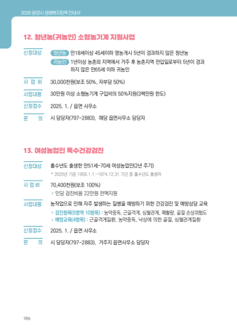 2025 %uad11%uc591%uc2dc %uc0dd%uc560%ubcf5%uc9c0%uc815%ucc45 %uc548%ub0b4%uc11c18612. %uccad%ub144%ub18d(%uadc0%ub18d%uc778) %uc18c%ud615%ub18d%uae30%uacc4 %uc9c0%uc6d0%uc0ac%uc5c5%uc2e0%uccad%ub300%uc0c1%u0009 %uccad%ub144%ub18d %ub9cc18%uc138%uc774%uc0c1 45%uc138%uc774%ud558 %uc601%ub18d%uac1c%uc2dc 5%ub144%uc774 %uacbd%uacfc%ud558%uc9c0 %uc54a%uc740 %uccad%ub144%ub18d %uadc0%ub18d%uc778 1%ub144%uc774%uc0c1 %ub18d%ucd0c%uc678 %uc9c0%uc5ed%uc5d0%uc11c %uac70%uc8fc %ud6c4 %ub18d%ucd0c%uc9c0%uc5ed %uc804%uc785%uc77c%ub85c%ubd80%ud130 5%ub144%uc774 %uacbd%uacfc %ud558%uc9c0 %uc54a%uc740 %ub9cc65%uc138 %uc774%ud558 %uadc0%ub18d%uc778%uc0ac %uc5c5 %ube44%u0009 30,000%ucc9c%uc6d0(%ubcf4%uc870 50%, %uc790%ubd80%ub2f4 50%)%uc0ac%uc5c5%ub0b4%uc6a9%u0009 30%ub9cc%uc6d0 %uc774%uc0c1 %uc18c%ud615%ub18d%uae30%uacc4 %uad6c%uc785%ube44%uc758 50%%uc9c0%uc6d0(3%ubc31%ub9cc%uc6d0 %ud55c%ub3c4)%uc2e0%uccad%uc811%uc218%u0009 2025. 1. / %uc74d%uba74 %uc0ac%ubb34%uc18c%ubb38%u0009 %uc758 %uc2dc %ub2f4%ub2f9%uc790(797-2883), %ud574%ub2f9 %uc74d%uba74%uc0ac%ubb34%uc18c %ub2f4%ub2f9%uc79013. %uc5ec%uc131%ub18d%uc5c5%uc778 %ud2b9%uc218%uac74%uac15%uac80%uc9c4%uc2e0%uccad%ub300%uc0c1%u0009 %ud640%uc218%ub144%ub3c4 %ucd9c%uc0dd%ud55c %ub9cc51%uc138~70%uc138 %uc5ec%uc131%ub18d%uc5c5%uc778(2%ub144 %uc8fc%uae30)* 2025%ub144 %uae30%uc900 1955.1.1.~1974.12.31.%uae30%uac04 %uc911 %ud640%uc218%ub144%ub3c4 %ucd9c%uc0dd%uc790%uc0ac %uc5c5 %ube44%u0009 70,400%ucc9c%uc6d0(%ubcf4%uc870 100%)%u00bb %uc778%ub2f9 %uac80%uc9c4%ube44%uc6a9 22%ub9cc%uc6d0 %uc804%uc561%uc9c0%uc6d0%uc0ac%uc5c5%ub0b4%uc6a9%u0009 %ub18d%uc791%uc5c5%uc73c%ub85c %uc778%ud574 %uc790%uc8fc %ubc1c%uc0dd%ud558%ub294 %uc9c8%ubcd1%uc744 %uc608%ubc29%ud558%uae30 %uc704%ud55c %uac74%uac15%uac80%uc9c4 %ubc0f %uc608%ubc29%uc0c1%ub2f4 %uad50%uc721%u00bb %uac80%uc9c4%ud56d%ubaa9(5%uc601%uc5ed 10%ud56d%ubaa9) : %ub18d%uc57d%uc911%ub3c5, %uadfc%uace8%uaca9%uacc4, %uc2ec%ud608%uad00%uacc4, %ud3d0%ud65c%ub7c9, %uace8%uc808%u00b7%uc190%uc0c1%uc704%ud5d8%ub3c4%u00bb %uc608%ubc29%uad50%uc721(4%ud56d%ubaa9) : %uadfc%uace8%uaca9%uacc4%uc9c8%ud658, %ub18d%uc57d%uc911%ub3c5, %ub099%uc0c1%uc5d0 %uc758%ud55c %uace8%uc808, %uc2ec%ud608%uad00%uacc4%uc9c8%ud658%uc2e0%uccad%uc811%uc218%u0009 2025. 1. / %uc74d%uba74 %uc0ac%ubb34%uc18c%ubb38%u0009 %uc758 %uc2dc %ub2f4%ub2f9%uc790(797-2883), %uac70%uc8fc%uc9c0 %uc74d%uba74%uc0ac%ubb34%uc18c %ub2f4%ub2f9%uc790