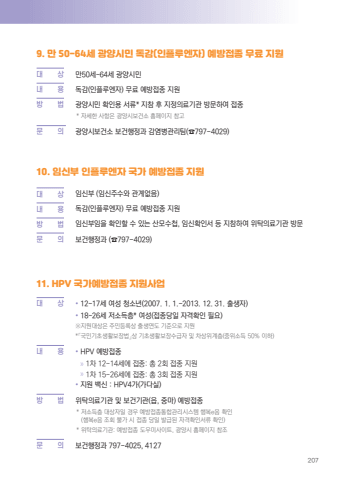 2079. %ub9cc 50-64%uc138 %uad11%uc591%uc2dc%ubbfc %ub3c5%uac10(%uc778%ud50c%ub8e8%uc5d4%uc790) %uc608%ubc29%uc811%uc885 %ubb34%ub8cc %uc9c0%uc6d0%ub300%u0009 %uc0c1 %ub9cc50%uc138~64%uc138 %uad11%uc591%uc2dc%ubbfc%ub0b4%u0009 %uc6a9 %ub3c5%uac10(%uc778%ud50c%ub8e8%uc5d4%uc790) %ubb34%ub8cc %uc608%ubc29%uc811%uc885 %uc9c0%uc6d0%ubc29%u0009 %ubc95 %uad11%uc591%uc2dc%ubbfc %ud655%uc778%uc6a9 %uc11c%ub958* %uc9c0%ucc38 %ud6c4 %uc9c0%uc815%uc758%ub8cc%uae30%uad00 %ubc29%ubb38%ud558%uc5ec %uc811%uc885* %uc790%uc138%ud55c %uc0ac%ud56d%uc740 %uad11%uc591%uc2dc%ubcf4%uac74%uc18c %ud648%ud398%uc774%uc9c0 %ucc38%uace0%ubb38%u0009 %uc758 %uad11%uc591%uc2dc%ubcf4%uac74%uc18c %ubcf4%uac74%ud589%uc815%uacfc %uac10%uc5fc%ubcd1%uad00%ub9ac%ud300(%u260e797-4029)10. %uc784%uc2e0%ubd80 %uc778%ud50c%ub8e8%uc5d4%uc790 %uad6d%uac00 %uc608%ubc29%uc811%uc885 %uc9c0%uc6d0%ub300%u0009 %uc0c1 %uc784%uc2e0%ubd80 (%uc784%uc2e0%uc8fc%uc218%uc640 %uad00%uacc4%uc5c6%uc74c)%ub0b4%u0009 %uc6a9 %ub3c5%uac10(%uc778%ud50c%ub8e8%uc5d4%uc790) %ubb34%ub8cc %uc608%ubc29%uc811%uc885 %uc9c0%uc6d0%ubc29%u0009 %ubc95 %uc784%uc2e0%ubd80%uc784%uc744 %ud655%uc778%ud560 %uc218 %uc788%ub294 %uc0b0%ubaa8%uc218%ucca9, %uc784%uc2e0%ud655%uc778%uc11c %ub4f1 %uc9c0%ucc38%ud558%uc5ec %uc704%ud0c1%uc758%ub8cc%uae30%uad00 %ubc29%ubb38%ubb38%u0009 %uc758 %ubcf4%uac74%ud589%uc815%uacfc (%u260e797-4029)11. HPV %uad6d%uac00%uc608%ubc29%uc811%uc885 %uc9c0%uc6d0%uc0ac%uc5c5%ub300%u0009 %uc0c1 %u2022 12~17%uc138 %uc5ec%uc131 %uccad%uc18c%ub144(2007. 1. 1.~2013. 12. 31. %ucd9c%uc0dd%uc790)%u2022 18~26%uc138 %uc800%uc18c%ub4dd%uce35* %uc5ec%uc131(%uc811%uc885%ub2f9%uc77c %uc790%uaca9%ud655%uc778 %ud544%uc694)%u203b%uc9c0%uc6d0%ub300%uc0c1%uc740 %uc8fc%ubbfc%ub4f1%ub85d%uc0c1 %ucd9c%uc0dd%uc5f0%ub3c4 %uae30%uc900%uc73c%ub85c %uc9c0%uc6d0*%u300c%uad6d%ubbfc%uae30%ucd08%uc0dd%ud65c%ubcf4%uc7a5%ubc95%u300d%uc0c1 %uae30%ucd08%uc0dd%ud65c%ubcf4%uc7a5%uc218%uae09%uc790 %ubc0f %ucc28%uc0c1%uc704%uacc4%uce35(%uc911%uc704%uc18c%ub4dd 50% %uc774%ud558)%ub0b4%u0009 %uc6a9 %u2022 HPV %uc608%ubc29%uc811%uc885%u00bb 1%ucc28 12~14%uc138%uc5d0 %uc811%uc885: %ucd1d 2%ud68c %uc811%uc885 %uc9c0%uc6d0%u00bb 1%ucc28 15~26%uc138%uc5d0 %uc811%uc885: %ucd1d 3%ud68c %uc811%uc885 %uc9c0%uc6d0%u2022 %uc9c0%uc6d0 %ubc31%uc2e0 : HPV4%uac00(%uac00%ub2e4%uc2e4) %ubc29%u0009 %ubc95 %uc704%ud0c1%uc758%ub8cc%uae30%uad00 %ubc0f %ubcf4%uac74%uae30%uad00(%uc74d, %uc911%ub9c8) %uc608%ubc29%uc811%uc885* %uc800%uc18c%ub4dd%uce35 %ub300%uc0c1%uc790%uc77c %uacbd%uc6b0 %uc608%ubc29%uc811%uc885%ud1b5%ud569%uad00%ub9ac%uc2dc%uc2a4%ud15c %ud589%ubcf5e%uc74c %ud655%uc778(%ud589%ubcf5e%uc74c %uc870%ud68c %ubd88%uac00 %uc2dc %uc811%uc885 %ub2f9%uc77c %ubc1c%uae09%ub41c %uc790%uaca9%ud655%uc778%uc11c%ub958 %ud655%uc778)* %uc704%ud0c1%uc758%ub8cc%uae30%uad00: %uc608%ubc29%uc811%uc885 %ub3c4%uc6b0%ubbf8%uc0ac%uc774%ud2b8, %uad11%uc591%uc2dc %ud648%ud398%uc774%uc9c0 %ucc38%uc870%ubb38%u0009 %uc758 %ubcf4%uac74%ud589%uc815%uacfc 797-4025, 4127