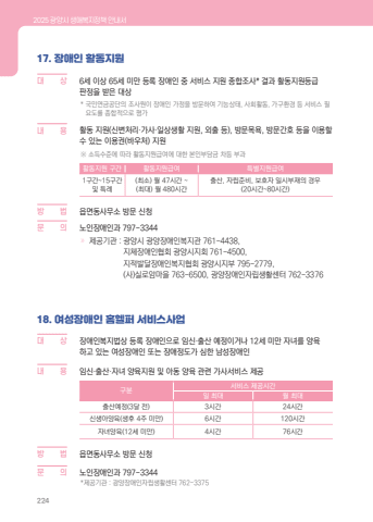 2025 %uad11%uc591%uc2dc %uc0dd%uc560%ubcf5%uc9c0%uc815%ucc45 %uc548%ub0b4%uc11c22417. %uc7a5%uc560%uc778 %ud65c%ub3d9%uc9c0%uc6d0%ub300 %u0009 %uc0c1 6%uc138 %uc774%uc0c1 65%uc138 %ubbf8%ub9cc %ub4f1%ub85d %uc7a5%uc560%uc778 %uc911 %uc11c%ube44%uc2a4 %uc9c0%uc6d0 %uc885%ud569%uc870%uc0ac* %uacb0%uacfc %ud65c%ub3d9%uc9c0%uc6d0%ub4f1%uae09 %ud310%uc815%uc744 %ubc1b%uc740 %ub300%uc0c1* %uad6d%ubbfc%uc5f0%uae08%uacf5%ub2e8%uc758 %uc870%uc0ac%uc6d0%uc774 %uc7a5%uc560%uc778 %uac00%uc815%uc744 %ubc29%ubb38%ud558%uc5ec %uae30%ub2a5%uc0c1%ud0dc, %uc0ac%ud68c%ud65c%ub3d9, %uac00%uad6c%ud658%uacbd %ub4f1 %uc11c%ube44%uc2a4 %ud544%uc694%ub3c4%ub97c %uc885%ud569%uc801%uc73c%ub85c %ud3c9%uac00%ub0b4 %u0009 %uc6a9 %ud65c%ub3d9 %uc9c0%uc6d0(%uc2e0%ubcc0%ucc98%ub9ac%u00b7%uac00%uc0ac%u00b7%uc77c%uc0c1%uc0dd%ud65c %uc9c0%uc6d0, %uc678%ucd9c %ub4f1), %ubc29%ubb38%ubaa9%uc695, %ubc29%ubb38%uac04%ud638 %ub4f1%uc744 %uc774%uc6a9%ud560 %uc218 %uc788%ub294 %uc774%uc6a9%uad8c(%ubc14%uc6b0%ucc98) %uc9c0%uc6d0%u203b %uc18c%ub4dd%uc218%uc900%uc5d0 %ub530%ub77c %ud65c%ub3d9%uc9c0%uc6d0%uae09%uc5ec%uc5d0 %ub300%ud55c %ubcf8%uc778%ubd80%ub2f4%uae08 %ucc28%ub4f1 %ubd80%uacfc%ud65c%ub3d9%uc9c0%uc6d0 %uad6c%uac04 %ud65c%ub3d9%uc9c0%uc6d0%uae09%uc5ec %ud2b9%ubcc4%uc9c0%uc6d0%uae09%uc5ec1%uad6c%uac04~15%uad6c%uac04%ubc0f %ud2b9%ub840(%ucd5c%uc18c) %uc6d4 47%uc2dc%uac04 ~ (%ucd5c%ub300) %uc6d4 480%uc2dc%uac04%ucd9c%uc0b0, %uc790%ub9bd%uc900%ube44, %ubcf4%ud638%uc790 %uc77c%uc2dc%ubd80%uc7ac%uc758 %uacbd%uc6b0(20%uc2dc%uac04~80%uc2dc%uac04)%ubc29%u0009 %ubc95 %uc74d%uba74%ub3d9%uc0ac%ubb34%uc18c %ubc29%ubb38 %uc2e0%uccad%ubb38 %u0009 %uc758 %ub178%uc778%uc7a5%uc560%uc778%uacfc 797-3344%u00bb %uc81c%uacf5%uae30%uad00 : %uad11%uc591%uc2dc %uad11%uc591%uc7a5%uc560%uc778%ubcf5%uc9c0%uad00 761-4438, %uc9c0%uccb4%uc7a5%uc560%uc778%ud611%ud68c %uad11%uc591%uc2dc%uc9c0%ud68c 761-4500, %uc9c0%uc801%ubc1c%ub2ec%uc7a5%uc560%uc778%ubcf5%uc9c0%ud611%ud68c %uad11%uc591%uc2dc%uc9c0%ubd80 795-2779, (%uc0ac)%uc2e4%ub85c%uc554%ub9c8%uc744 763-6500, %uad11%uc591%uc7a5%uc560%uc778%uc790%ub9bd%uc0dd%ud65c%uc13c%ud130 762-337618. %uc5ec%uc131%uc7a5%uc560%uc778 %ud648%ud5ec%ud37c %uc11c%ube44%uc2a4%uc0ac%uc5c5%ub300%u0009 %uc0c1 %uc7a5%uc560%uc778%ubcf5%uc9c0%ubc95%uc0c1 %ub4f1%ub85d %uc7a5%uc560%uc778%uc73c%ub85c %uc784%uc2e0%u00b7%ucd9c%uc0b0 %uc608%uc815%uc774%uac70%ub098 12%uc138 %ubbf8%ub9cc %uc790%ub140%ub97c %uc591%uc721%ud558%uace0 %uc788%ub294 %uc5ec%uc131%uc7a5%uc560%uc778 %ub610%ub294 %uc7a5%uc560%uc815%ub3c4%uac00 %uc2ec%ud55c %ub0a8%uc131%uc7a5%uc560%uc778%ub0b4%u0009 %uc6a9 %uc784%uc2e0%u00b7%ucd9c%uc0b0%u00b7%uc790%ub140 %uc591%uc721%uc9c0%uc6d0 %ubc0f %uc544%ub3d9 %uc591%uc721 %uad00%ub828 %uac00%uc0ac%uc11c%ube44%uc2a4 %uc81c%uacf5%uad6c%ubd84 %uc11c%ube44%uc2a4 %uc81c%uacf5%uc2dc%uac04%uc77c %ucd5c%ub300 %uc6d4 %ucd5c%ub300%ucd9c%uc0b0%uc608%uc815(3%ub2ec %uc804) 3%uc2dc%uac04 24%uc2dc%uac04%uc2e0%uc0dd%uc544%uc591%uc721(%uc0dd%ud6c4 4%uc8fc %ubbf8%ub9cc) 6%uc2dc%uac04 120%uc2dc%uac04%uc790%ub140%uc591%uc721(12%uc138 %ubbf8%ub9cc) 4%uc2dc%uac04 76%uc2dc%uac04%ubc29%u0009 %ubc95 %uc74d%uba74%ub3d9%uc0ac%ubb34%uc18c %ubc29%ubb38 %uc2e0%uccad%ubb38%u0009 %uc758 %ub178%uc778%uc7a5%uc560%uc778%uacfc 797-3344 *%uc81c%uacf5%uae30%uad00 : %uad11%uc591%uc7a5%uc560%uc778%uc790%ub9bd%uc0dd%ud65c%uc13c%ud130 762-3375