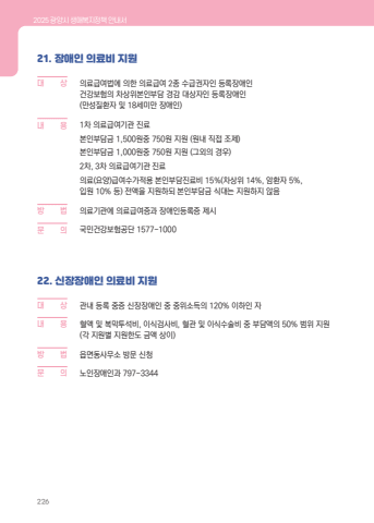 2025 %uad11%uc591%uc2dc %uc0dd%uc560%ubcf5%uc9c0%uc815%ucc45 %uc548%ub0b4%uc11c22621. %uc7a5%uc560%uc778 %uc758%ub8cc%ube44 %uc9c0%uc6d0%ub300 %u0009 %uc0c1 %uc758%ub8cc%uae09%uc5ec%ubc95%uc5d0 %uc758%ud55c %uc758%ub8cc%uae09%uc5ec 2%uc885 %uc218%uae09%uad8c%uc790%uc778 %ub4f1%ub85d%uc7a5%uc560%uc778%uac74%uac15%ubcf4%ud5d8%uc758 %ucc28%uc0c1%uc704%ubcf8%uc778%ubd80%ub2f4 %uacbd%uac10 %ub300%uc0c1%uc790%uc778 %ub4f1%ub85d%uc7a5%uc560%uc778(%ub9cc%uc131%uc9c8%ud658%uc790 %ubc0f 18%uc138%ubbf8%ub9cc %uc7a5%uc560%uc778)%ub0b4%u0009 %uc6a9 1%ucc28 %uc758%ub8cc%uae09%uc5ec%uae30%uad00 %uc9c4%ub8cc %ubcf8%uc778%ubd80%ub2f4%uae08 1,500%uc6d0%uc911 750%uc6d0 %uc9c0%uc6d0 (%uc6d0%ub0b4 %uc9c1%uc811 %uc870%uc81c) %ubcf8%uc778%ubd80%ub2f4%uae08 1,000%uc6d0%uc911 750%uc6d0 %uc9c0%uc6d0 (%uadf8%uc678%uc758 %uacbd%uc6b0) 2%ucc28, 3%ucc28 %uc758%ub8cc%uae09%uc5ec%uae30%uad00 %uc9c4%ub8cc %uc758%ub8cc(%uc694%uc591)%uae09%uc5ec%uc218%uac00%uc801%uc6a9 %ubcf8%uc778%ubd80%ub2f4%uc9c4%ub8cc%ube44 15%(%ucc28%uc0c1%uc704 14%, %uc554%ud658%uc790 5%, %uc785%uc6d0 10% %ub4f1) %uc804%uc561%uc744 %uc9c0%uc6d0%ud558%ub418 %ubcf8%uc778%ubd80%ub2f4%uae08 %uc2dd%ub300%ub294 %uc9c0%uc6d0%ud558%uc9c0 %uc54a%uc74c %ubc29 %u0009 %ubc95 %uc758%ub8cc%uae30%uad00%uc5d0 %uc758%ub8cc%uae09%uc5ec%uc99d%uacfc %uc7a5%uc560%uc778%ub4f1%ub85d%uc99d %uc81c%uc2dc%ubb38 %u0009 %uc758 %uad6d%ubbfc%uac74%uac15%ubcf4%ud5d8%uacf5%ub2e8 1577-100022. %uc2e0%uc7a5%uc7a5%uc560%uc778 %uc758%ub8cc%ube44 %uc9c0%uc6d0%ub300 %uc0c1 %uad00%ub0b4 %ub4f1%ub85d %uc911%uc99d %uc2e0%uc7a5%uc7a5%uc560%uc778 %uc911 %uc911%uc704%uc18c%ub4dd%uc758 120% %uc774%ud558%uc778 %uc790%ub0b4 %uc6a9 %ud608%uc561 %ubc0f %ubcf5%ub9c9%ud22c%uc11d%ube44, %uc774%uc2dd%uac80%uc0ac%ube44, %ud608%uad00 %ubc0f %uc774%uc2dd%uc218%uc220%ube44 %uc911 %ubd80%ub2f4%uc561%uc758 50% %ubc94%uc704 %uc9c0%uc6d0(%uac01 %uc9c0%uc6d0%ubcc4 %uc9c0%uc6d0%ud55c%ub3c4 %uae08%uc561 %uc0c1%uc774)%ubc29 %u0009 %ubc95 %uc74d%uba74%ub3d9%uc0ac%ubb34%uc18c %ubc29%ubb38 %uc2e0%uccad%ubb38%u0009 %uc758 %ub178%uc778%uc7a5%uc560%uc778%uacfc 797-3344