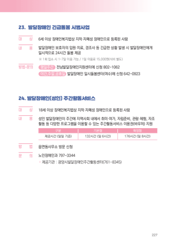 22723. %ubc1c%ub2ec%uc7a5%uc560%uc778 %uae34%uae09%ub3cc%ubd04 %uc2dc%ubc94%uc0ac%uc5c5%ub300%u0009 %uc0c1 6%uc138 %uc774%uc0c1 %uc7a5%uc560%uc778%ubcf5%uc9c0%ubc95%uc0c1 %uc9c0%uc801%u00b7%uc790%ud3d0%uc131 %uc7a5%uc560%uc778%uc73c%ub85c %ub4f1%ub85d%ub41c %uc0ac%ub78c%ub0b4 %u0009 %uc6a9 %ubc1c%ub2ec%uc7a5%uc560%uc778 %ubcf4%ud638%uc790%uc758 %uc785%uc6d0%u00b7%uce58%ub8cc, %uacbd%uc870%uc0ac %ub4f1 %uae34%uae09%ud55c %uc0c1%ud669 %ubc1c%uc0dd %uc2dc %ubc1c%ub2ec%uc7a5%uc560%uc778%uc5d0%uac8c %uc77c%uc2dc%uc801%uc73c%ub85c 24%uc2dc%uac04 %ub3cc%ubd04 %uc81c%uacf5%u203b 1%ud68c %uc785%uc18c %uc2dc 1~7%uc77c %uc774%uc6a9 %uac00%ub2a5 / 1%uc77c %uc774%uc6a9%ub8cc 15,000%uc6d0(%uc2dd%ube44 %ubcc4%ub3c4) %ubc29%ubc95%u0009%u2022%ubb38%uc758 %ud3c9%uc77c%uc8fc%uac04 %uc804%ub0a8%ubc1c%ub2ec%uc7a5%uc560%uc778%uc9c0%uc6d0%uc13c%ud130%uc5d0 %uc2e0%uccad 802-1062 %uc57c%uac04,%uc8fc%ub9d0,%uacf5%ud734%uc77c %ubc1c%ub2ec%uc7a5%uc560%uc778 %uc77c%uc2dc%ub3cc%ubd04%uc13c%ud130(%uc5ec%uc218)%uc5d0 %uc2e0%uccad 642-092324. %ubc1c%ub2ec%uc7a5%uc560%uc778(%uc131%uc778) %uc8fc%uac04%ud65c%ub3d9%uc11c%ube44%uc2a4%ub300 %u0009 %uc0c1 18%uc138 %uc774%uc0c1 %uc7a5%uc560%uc778%ubcf5%uc9c0%ubc95%uc0c1 %uc9c0%uc801%u00b7%uc790%ud3d0%uc131 %uc7a5%uc560%uc778%uc73c%ub85c %ub4f1%ub85d%ub41c %uc0ac%ub78c%ub0b4%u0009 %uc6a9 %uc131%uc778 %ubc1c%ub2ec%uc7a5%uc560%uc778%uc774 %uc8fc%uac04%uc5d0 %uc9c0%uc5ed%uc0ac%ud68c %ub0b4%uc5d0%uc11c %ucde8%ubbf8%u00b7%uc5ec%uac00, %uc790%ub9bd%uc900%ube44, %uad00%ub78c%u00b7%uccb4%ud5d8, %uc790%uc870%ud65c%ub3d9 %ub4f1 %ub2e4%uc591%ud55c %ud504%ub85c%uadf8%ub7a8%uc744 %uc774%uc6a9%ud560 %uc218 %uc788%ub294 %uc8fc%uac04%ud65c%ub3d9%uc11c%ube44%uc2a4 %uc774%uc6a9%uad8c(%ubc14%uc6b0%ucc98) %uc9c0%uc6d0%uad6c%ubd84 %uae30%ubcf8%ud615 %ud655%uc7a5%ud615%uc81c%uacf5%uc2dc%uac04 (%uc77c%uc77c %uae30%uc900) 132%uc2dc%uac04 (%uc77c 6%uc2dc%uac04) 176%uc2dc%uac04 (%uc77c 8%uc2dc%uac04)%ubc29 %u0009 %ubc95 %uc74d%uba74%ub3d9%uc0ac%ubb34%uc18c %ubc29%ubb38 %uc2e0%uccad%ubb38%u0009 %uc758 %ub178%uc778%uc7a5%uc560%uc778%uacfc 797-3344%u00bb %uc81c%uacf5%uae30%uad00 : %uad11%uc591%uc2dc%ubc1c%ub2ec%uc7a5%uc560%uc778%uc8fc%uac04%ud65c%ub3d9%uc13c%ud130(761-8345)