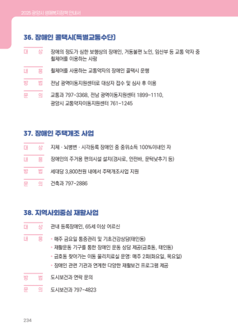 2025 %uad11%uc591%uc2dc %uc0dd%uc560%ubcf5%uc9c0%uc815%ucc45 %uc548%ub0b4%uc11c23436. %uc7a5%uc560%uc778 %ucf5c%ud0dd%uc2dc(%ud2b9%ubcc4%uad50%ud1b5%uc218%ub2e8) %ub300 %u0009 %uc0c1 %uc7a5%uc560%uc758 %uc815%ub3c4%uac00 %uc2ec%ud55c %ubcf4%ud589%uc0c1%uc758 %uc7a5%uc560%uc778, %uac70%ub3d9%ubd88%ud3b8 %ub178%uc778, %uc784%uc0b0%ubd80 %ub4f1 %uad50%ud1b5 %uc57d%uc790 %uc911 %ud720%uccb4%uc5b4%ub97c %uc774%uc6a9%ud558%ub294 %uc0ac%ub78c%ub0b4 %u0009 %uc6a9 %ud720%uccb4%uc5b4%ub97c %uc0ac%uc6a9%ud558%ub294 %uad50%ud1b5%uc57d%uc790%uc758 %uc7a5%uc560%uc778 %ucf5c%ud0dd%uc2dc %uc6b4%ud589%ubc29 %u0009 %ubc95 %uc804%ub0a8 %uad11%uc5ed%uc774%ub3d9%uc9c0%uc6d0%uc13c%ud130%ub85c %ub300%uc0c1%uc790 %uc811%uc218 %ubc0f %uc2ec%uc0ac %ud6c4 %uc774%uc6a9%ubb38%u0009 %uc758 %uad50%ud1b5%uacfc 797-3368, %uc804%ub0a8 %uad11%uc5ed%uc774%ub3d9%uc9c0%uc6d0%uc13c%ud130 1899-1110, %uad11%uc591%uc2dc %uad50%ud1b5%uc57d%uc790%uc774%ub3d9%uc9c0%uc6d0%uc13c%ud130 761-1245 37. %uc7a5%uc560%uc778 %uc8fc%ud0dd%uac1c%uc870 %uc0ac%uc5c5%ub300 %u0009 %uc0c1 %uc9c0%uccb4%u2027%ub1cc%ubcd1%ubcc0%u2027%uc2dc%uac01%ub4f1%ub85d %uc7a5%uc560%uc778 %uc911 %uc911%uc704%uc18c%ub4dd 100%%uc774%ub0b4%uc778 %uc790 %ub0b4 %u0009 %uc6a9 %uc7a5%uc560%uc778%uc758 %uc8fc%uac70%uc6a9 %ud3b8%uc758%uc2dc%uc124 %uc124%uce58(%uacbd%uc0ac%ub85c, %uc548%uc804%ubc14, %ubb38%ud131%ub0ae%ucd94%uae30 %ub4f1)%ubc29 %u0009 %ubc95 %uc138%ub300%ub2f9 3,800%ucc9c%uc6d0 %ub0b4%uc5d0%uc11c %uc8fc%ud0dd%uac1c%uc870%uc0ac%uc5c5 %uc9c0%uc6d0%ubb38 %u0009 %uc758 %uac74%ucd95%uacfc 797-288638. %uc9c0%uc5ed%uc0ac%ud68c%uc911%uc2ec %uc7ac%ud65c%uc0ac%uc5c5%ub300 %u0009 %uc0c1 %uad00%ub0b4 %ub4f1%ub85d%uc7a5%uc560%uc778, 65%uc138 %uc774%uc0c1 %uc5b4%ub974%uc2e0%ub0b4%u0009 %uc6a9 %u2022 %ub9e4%uc8fc %uae08%uc694%uc77c %ud1b5%uc99d%uad00%ub9ac %ubc0f %uae30%ucd08%uac74%uac15%uc0c1%ub2f4(%ud0dc%uc778%ub3d9)%u2022 %uc7ac%ud65c%uc6b4%ub3d9 %uae30%uad6c%ub97c %ud1b5%ud55c %uc7a5%uc560%uc778 %uc6b4%ub3d9 %uc0c1%ub2f4 %uc81c%uacf5(%uae08%ud638%ub3d9, %ud0dc%uc778%ub3d9)%u2022 %uae08%ud638%ub3d9 %ucc3e%uc544%uac00%ub294 %uc774%ub3d9 %ubb3c%ub9ac%uce58%ub8cc%uc2e4 %uc6b4%uc601: %ub9e4%uc8fc 2%ud68c(%ud654%uc694%uc77c, %ubaa9%uc694%uc77c)%u2022 %uc7a5%uc560%uc778 %uad00%ub828 %uae30%uad00%uacfc %uc5f0%uacc4%ud55c %ub2e4%uc591%ud55c %uc7ac%ud65c%ubcf4%uac74 %ud504%ub85c%uadf8%ub7a8 %uc81c%uacf5%ubc29%u0009 %ubc95 %ub3c4%uc2dc%ubcf4%uac74%uacfc %uc5f0%ub77d %ubb38%uc758%ubb38%u0009 %uc758 %ub3c4%uc2dc%ubcf4%uac74%uacfc 797-4823