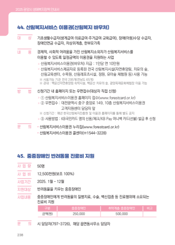 2025 %uad11%uc591%uc2dc %uc0dd%uc560%ubcf5%uc9c0%uc815%ucc45 %uc548%ub0b4%uc11c23844. %uc0b0%ub9bc%ubcf5%uc9c0%uc11c%ube44%uc2a4 %uc774%uc6a9%uad8c(%uc0b0%ub9bc%ubcf5%uc9c0 %ubc14%uc6b0%ucc98)%ub300%u0009 %uc0c1 %uae30%ucd08%uc0dd%ud65c%uc218%uae09%uc790(%uc0dd%uacc4%uae09%uc5ec%u00b7%uc758%ub8cc%uae09%uc5ec%u00b7%uc8fc%uac70%uae09%uc5ec%u00b7%uad50%uc721%uae09%uc5ec), %uc7a5%uc560(%uc544%ub3d9)%uc218%ub2f9 %uc218%uae09%uc790, %uc7a5%uc560%uc778%uc5f0%uae08 %uc218%uae09%uc790, %ucc28%uc0c1%uc704%uacc4%uce35, %ud55c%ubd80%ubaa8%uac00%uc871%ub0b4%u0009 %uc6a9 %uacbd%uc81c%uc801, %uc0ac%ud68c%uc801 %uc5b4%ub824%uc6c0%uc744 %uac00%uc9c4 %uc0b0%ub9bc%ubcf5%uc9c0%uc18c%uc678%uc790%uac00 %uc0b0%ub9bc%ubcf5%uc9c0%uc11c%ube44%uc2a4%ub97c %uc774%uc6a9%ud560 %uc218 %uc788%ub3c4%ub85d %uc77c%uc815%uae08%uc561%uc758 %uc774%uc6a9%uad8c%uc744 %uc9c0%uc6d0%ud558%ub294 %uc0ac%uc5c5%u00bb %uc0b0%ub9bc%ubcf5%uc9c0%uc11c%ube44%uc2a4%uc774%uc6a9%uad8c(%ubc14%uc6b0%ucc98) %uc9c0%uae09 : 1%uc778%ub2f9 %uc5f0 10%ub9cc%uc6d0%u00bb %uc0b0%ub9bc%ubcf5%uc9c0%uc11c%ube44%uc2a4%uc81c%uacf5%uc790%ub85c %ub4f1%ub85d%ub41c %uc804%uad6d %uc0b0%ub9bc%ubcf5%uc9c0%uc2dc%uc124(%uc790%uc5f0%ud734%uc591%ub9bc, %uce58%uc720%uc758 %uc232, %uc0b0%ub9bc%uad50%uc721%uc13c%ud130, %uc218%ubaa9%uc6d0, %uc0b0%ub9bc%ub808%ud3ec%uce20%uc2dc%uc124, %uc815%uc6d0, %uc720%uc544%uc232 %uccb4%ud5d8%uc6d0 %ub4f1) %uc0ac%uc6a9 %uac00%ub2a5 %u203b %uc0ac%uc6a9%uac00%ub2a5 %uae30%uad00 %uc804%uad6d 295%uac1c(%uc804%ub0a8%ub3c4 65%uac1c) %u203b %uad00%ub0b4 : %ubc31%uc6b4%uc0b0%uc790%uc5f0%ud734%uc591%ub9bc %uc219%ubc15%uc2dc%uc124, %ubc31%uc6b4%uc0b0 %uce58%uc720%uc758 %uc232, %uad11%uc591%ubaa9%uc7ac%ubb38%ud654%uccb4%ud5d8%uc7a5 %uc774%uc6a9 %uac00%ub2a5%ubc29%u0009 %ubc95 %uc2e0%uccad%uae30%uac04 %ub0b4 %ud648%ud398%uc774%uc9c0 %ub610%ub294 %uc6b0%ud3b8%uc811%uc218(%ub300%uc0c1%uc790 %uc9c1%uc811 %uc2e0%uccad)%u00bb %u2460 %uc0b0%ub9bc%ubcf5%uc9c0%uc11c%ube44%uc2a4%uc774%uc6a9%uad8c %ud648%ud398%uc774%uc9c0 %uc811%uc218(www.forestcard.or.kr)%u00bb %u2461 %uc6b0%ud3b8%uc811%uc218 : %ub300%uc804%uad11%uc5ed%uc2dc %uc911%uad6c %uc911%uc559%ub85c 149, 10%uce35 %uc0b0%ub9bc%ubcf5%uc9c0%uc11c%ube44%uc2a4%uc774%uc6a9%uad8c %uace0%uac1d%uc9c0%uc6d0%uc13c%ud130 %ub2f4%ub2f9%uc790 %uc55e %u203b %uc2e0%uccad%uae30%uac04 : %ub9e4%ub144 %ud55c%uad6d%uc0b0%ub9bc%ubcf5%uc9c0%uc9c4%ud765%uc6d0 %ubc0f %uc774%uc6a9%uad8c %ud648%ud398%uc774%uc9c0%ub97c %ud1b5%ud574 %ubcc4%ub3c4 %uacf5%uc9c0%u00bb %u2462 %uc0ac%uc6a9%ubc29%ubc95 : KB%uad6d%ubbfc%uce74%ub4dc %uba85%uc758 %uc2e0%uc6a9/%uccb4%ud06c/KB Pay %uba38%ub2c8%ubc31 %uce74%ub4dc(%uc120%ubd88) %ubc1c%uae09 %ud6c4 %uc2e0%uccad%ubb38 %u0009 %uc758 %u2022 %uc0b0%ub9bc%ubcf5%uc9c0%uc11c%ube44%uc2a4%uc774%uc6a9%uad8c %ub204%ub9ac%uc9d1(www.forestcard.or.kr)%u2022 %uc0b0%ub9bc%ubcf5%uc9c0%uc11c%ube44%uc2a4%uc774%uc6a9%uad8c %ucf5c%uc13c%ud130(%u260f1544-3228)45. %uc911%uc99d%uc7a5%uc560%uc778 %ubc18%ub824%ub3d9%ubb3c %uc9c4%ub8cc%ube44 %uc9c0%uc6d0%uc0ac %uc5c5 %ub7c9%u0009 50%uba85%uc0ac %uc5c5 %ube44%u0009 12,500%ucc9c%uc6d0(%ubcf4%uc870 100%)%uc0ac%uc5c5%uae30%uac04%u0009 2025. 1%uc6d4 ~ 12%uc6d4%uc9c0%uc6d0%ub300%uc0c1%u0009 %ubc18%ub824%ub3d9%ubb3c%uc744 %ud0a4%uc6b0%ub294 %uc911%uc99d%uc7a5%uc560%uc778%uc0ac%uc5c5%ub0b4%uc6a9%u0009 %uc911%uc99d%uc7a5%uc560%uc778%uc5d0%uac8c %ubc18%ub824%ub3d9%ubb3c%uc758 %uc9c8%ubcd1%uce58%ub8cc, %uc218%uc220, %ubc31%uc2e0%uc811%uc885 %ub4f1 %uc9c4%ub8cc%ud589%uc704%uc5d0 %uc18c%uc694%ub418%ub294 %uc9c4%ub8cc%ube44 %uc9c0%uc6d0%uad6c%ubd84 %uc911%uc99d%uc7a5%uc560%uc778 %ucde8%uc57d%uacc4%uce35 %uc911%uc99d%uc7a5%uc560%uc778 %ube44%uace0%uae08%uc561(%uc6d0) 250,000 500,000%ubb38%u0009 %uc758 %uc2dc %ub2f4%ub2f9%uc790(797-3726), %ud574%ub2f9 %uc74d%uba74%ub3d9%uc0ac%ubb34%uc18c %ub2f4%ub2f9%uc790