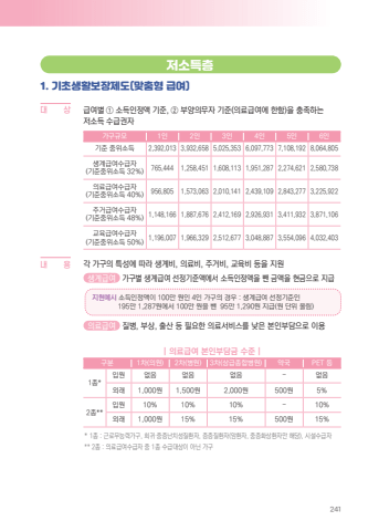 2411. %uae30%ucd08%uc0dd%ud65c%ubcf4%uc7a5%uc81c%ub3c4(%ub9de%ucda4%ud615 %uae09%uc5ec)%ub300%u0009 %uc0c1 %uae09%uc5ec%ubcc4 %u2460 %uc18c%ub4dd%uc778%uc815%uc561 %uae30%uc900, %u2461 %ubd80%uc591%uc758%ubb34%uc790 %uae30%uc900(%uc758%ub8cc%uae09%uc5ec%uc5d0 %ud55c%ud568)%uc744 %ucda9%uc871%ud558%ub294 %uc800%uc18c%ub4dd %uc218%uae09%uad8c%uc790 %uac00%uad6c%uaddc%ubaa8 1%uc778 2%uc778 3%uc778 4%uc778 5%uc778 6%uc778%uae30%uc900 %uc911%uc704%uc18c%ub4dd 2,392,013 3,932,658 5,025,353 6,097,773 7,108,192 8,064,805%uc0dd%uacc4%uae09%uc5ec%uc218%uae09%uc790(%uae30%uc900%uc911%uc704%uc18c%ub4dd 32%) 765,444 1,258,451 1,608,113 1,951,287 2,274,621 2,580,738%uc758%ub8cc%uae09%uc5ec%uc218%uae09%uc790(%uae30%uc900%uc911%uc704%uc18c%ub4dd 40%) 956,805 1,573,063 2,010,141 2,439,109 2,843,277 3,225,922%uc8fc%uac70%uae09%uc5ec%uc218%uae09%uc790(%uae30%uc900%uc911%uc704%uc18c%ub4dd 48%) 1,148,166 1,887,676 2,412,169 2,926,931 3,411,932 3,871,106%uad50%uc721%uae09%uc5ec%uc218%uae09%uc790(%uae30%uc900%uc911%uc704%uc18c%ub4dd 50%) 1,196,007 1,966,329 2,512,677 3,048,887 3,554,096 4,032,403%ub0b4%u0009 %uc6a9 %uac01 %uac00%uad6c%uc758 %ud2b9%uc131%uc5d0 %ub530%ub77c %uc0dd%uacc4%ube44, %uc758%ub8cc%ube44, %uc8fc%uac70%ube44, %uad50%uc721%ube44 %ub4f1%uc744 %uc9c0%uc6d0 %uc0dd%uacc4%uae09%uc5ec %uac00%uad6c%ubcc4 %uc0dd%uacc4%uae09%uc5ec %uc120%uc815%uae30%uc900%uc561%uc5d0%uc11c %uc18c%ub4dd%uc778%uc815%uc561%uc744 %ube80 %uae08%uc561%uc744 %ud604%uae08%uc73c%ub85c %uc9c0%uae09%uc9c0%uc6d0%uc608%uc2dc %uc18c%ub4dd%uc778%uc815%uc561%uc774 100%ub9cc %uc6d0%uc778 4%uc778 %uac00%uad6c%uc758 %uacbd%uc6b0 : %uc0dd%uacc4%uae09%uc5ec %uc120%uc815%uae30%uc900%uc778 195%ub9cc 1,287%uc6d0%uc5d0%uc11c 100%ub9cc %uc6d0%uc744 %ube80 95%ub9cc 1,290%uc6d0 %uc9c0%uae09(%uc6d0 %ub2e8%uc704 %uc62c%ub9bc) %uc758%ub8cc%uae09%uc5ec %uc9c8%ubcd1, %ubd80%uc0c1, %ucd9c%uc0b0 %ub4f1 %ud544%uc694%ud55c %uc758%ub8cc%uc11c%ube44%uc2a4%ub97c %ub0ae%uc740 %ubcf8%uc778%ubd80%ub2f4%uc73c%ub85c %uc774%uc6a9| %uc758%ub8cc%uae09%uc5ec %ubcf8%uc778%ubd80%ub2f4%uae08 %uc218%uc900 |%uad6c%ubd84 1%ucc28(%uc758%uc6d0) 2%ucc28(%ubcd1%uc6d0) 3%ucc28(%uc0c1%uae09%uc885%ud569%ubcd1%uc6d0) %uc57d%uad6d PET %ub4f11%uc885*%uc785%uc6d0 %uc5c6%uc74c %uc5c6%uc74c %uc5c6%uc74c - %uc5c6%uc74c%uc678%ub798 1,000%uc6d0 1,500%uc6d0 2,000%uc6d0 500%uc6d0 5%2%uc885**%uc785%uc6d0 10% 10% 10% - 10%%uc678%ub798 1,000%uc6d0 15% 15% 500%uc6d0 15%* 1%uc885 : %uadfc%ub85c%ubb34%ub2a5%ub825%uac00%uad6c, %ud76c%uadc0%u00b7%uc911%uc99d%ub09c%uce58%uc131%uc9c8%ud658%uc790, %uc99d%uc99d%uc9c8%ud658%uc790(%uc554%ud658%uc790, %uc911%uc99d%ud654%uc0c1%ud658%uc790%ub9cc %ud574%ub2f9), %uc2dc%uc124%uc218%uae09%uc790** 2%uc885 : %uc758%ub8cc%uae09%uc5ec%uc218%uae09%uc790 %uc911 1%uc885 %uc218%uae09%ub300%uc0c1%uc774 %uc544%ub2cc %uac00%uad6c%uc800%uc18c%ub4dd%uce35
