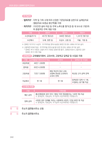 2025 %uad11%uc591%uc2dc %uc0dd%uc560%ubcf5%uc9c0%uc815%ucc45 %uc548%ub0b4%uc11c242 %uc8fc%uac70%uae09%uc5ec %u00bb %uc784%ucc28%uac00%uad6c : %uc9c0%uc5ed %ubc0f %uac00%uc871 %uc218%uc5d0 %ub530%ub77c %uc0b0%uc815%ud55c %uae30%uc900%uc784%ub300%ub8cc%ub97c %uc0c1%ud55c%uc73c%ub85c %uc2e4%uc81c%uc784%ucc28%ub8cc(%uc6d4%uc784%ucc28%ub8cc+%ubcf4%uc99d%uae08 %ud658%uc0b0%uc561)%ub97c %uc9c0%uc6d0%u00bb %uc790%uac00%uac00%uad6c : %uad6c%uc870%uc548%uc804%u00b7%uc124%ube44%u00b7%ub9c8%uac10 %ub4f1 %uc8fc%ud0dd %ub178%ud6c4%ub3c4%ub97c %ud3c9%uac00(%uacbd%u00b7%uc911%u00b7%ub300 %ubcf4%uc218%ub85c %uad6c%ubd84)%ud558%uc5ec %uc885%ud569%uc801%uc778 %uc8fc%ud0dd %uac1c%ub7c9 %uc9c0%uc6d0%uad6c%ubd84 %uacbd%ubcf4%uc218 %uc911%ubcf4%uc218 %ub300%ubcf4%uc218%uc218%uc120%ube44%uc6a9(%uc8fc%uae30) 457%ub9cc %uc6d0(3%ub144) 849%ub9cc %uc6d0(5%ub144) 1,241%ub9cc %uc6d0(7%ub144)%uc218%uc120%uc608%uc2dc %ub3c4%ubc30, %uc7a5%ud310 %ub4f1 %uc624%uae09%uc218, %ub09c%ubc29 %ub4f1 %uc9c0%ubd95, %uae30%ub465 %ub4f1%u203b %uc7a5%uc560%uc778 %uc790%uac00%uac00%uad6c %uc218%uae09%uc790 : %uc8fc%uac70%uc57d%uc790%uc6a9 %ud3b8%uc758%uc2dc%uc124*%uc744 380%ub9cc %uc6d0 %ud55c%ub3c4 %ub0b4%uc5d0%uc11c %ucd94%uac00%ub85c %uc124%uce58%u203b %uace0%ub839%uc790(%ub9cc 65%uc138 %uc774%uc0c1) : %uc8fc%uac70%uc57d%uc790%uc6a9 %ud3b8%uc758%uc2dc%uc124*%uc744 50%ub9cc %uc6d0 %ud55c%ub3c4 %ub0b4%uc5d0%uc11c %ucd94%uac00%ub85c %uc124%uce58* %uc7a5%uc560%uc778 %ucd94%uac00 %uc9c0%uc6d0%uacfc %uace0%ub839%uc790 %ucd94%uac00 %uc9c0%uc6d0%uc740 %uc911%ubcf5%uc9c0%uc6d0 %ubd88%uac00, %uc7a5%uc560%uc778%uc774%uba74%uc11c %uace0%ub839%uc790%uc778 %uacbd%uc6b0%uc7a5%uc560%uc778 %ucd94%uac00 %uc9c0%uc6d0 %uc801%uc6a9 %uad50%uc721%uae09%uc5ec %uad50%uc721%ud65c%ub3d9%uc9c0%uc6d0%ube44, %uad50%uacfc%uc11c%ub300, %uace0%ub4f1%ud559%uad50 %uc785%ud559%uae08 %ubc0f %uc218%uc5c5%ub8cc %uc9c0%uc6d0%uad6c%ubd84 %uad50%uc721%ud65c%ub3d9%uc9c0%uc6d0%ube44(%ubc14%uc6b0%ucc98) %uad50%uacfc%uc11c %uc785%ud559%uae08 %ubc0f %uc218%uc5c5%ub8cc%ucd08%ub4f1%ud559%uc0dd 46%ub9cc 1,000%uc6d0 - -%uc911%ud559%uc0dd 65%ub9cc 4,000%uc6d0 - -%uace0%ub4f1%ud559%uc0dd 72%ub9cc 7,000%uc6d0%ud574%ub2f9 %ud559%ub144%uc758 %uc815%uaddc %uad50%uc721 %uacfc%uc815%uc5d0 %ud3b8%uc131%ub41c %uad50%uacfc%ubaa9%uc758 %uad50%uacfc%uc11c %uc804%uccb4%ud559%uad50%uc7a5 %uace0%uc9c0 %uae08%uc561 %uc804%uc561%uc9c0%uae09%ud69f%uc218 %uc5f0 1%ud68c %uc5f0 1%ud68c %uc785%ud559%uae08%uc740 %uc785%ud559 %uc2dc 1%ud68c, %uc218%uc5c5%ub8cc%ub294 %ubd84%uae30%ubcc4 %uc9c0%uae09 %uadf8 %ubc16%uc758 %uc9c0%uc6d0 %uad6c%ubd84 %uc9c0%uc6d0%ub0b4%uc6a9%ud574%uc0b0 %uae09%uc5ec %ucd9c%uc0b0(%uc608%uc815)%ud55c %uacbd%uc6b0 %uc544%uc774 1%uba85%ub2f9 70%ub9cc %uc6d0(%uc30d%ub465%uc774%ub294 140%ub9cc %uc6d0) %uc9c0%uae09%u203b %uc0dd%uacc4%uae09%uc5ec, %uc758%ub8cc%uae09%uc5ec, %uc8fc%uac70%uae09%uc5ec %uc218%uae09%uc790%uc5d0%uac8c%ub9cc %uc9c0%uc6d0%ub429%ub2c8%ub2e4.%uc7a5%uc81c %uae09%uc5ec %uc0ac%ub9dd%ud55c %uacbd%uc6b0 %uc7a5%ub840%ub97c %uce58%ub974%ub294 %uc0ac%ub78c%uc5d0%uac8c %uc0ac%ub9dd%uc790 1%uc778%ub2f9 80%ub9cc %uc6d0 %uc9c0%uae09%u203b %uc0dd%uacc4%uae09%uc5ec, %uc758%ub8cc%uae09%uc5ec, %uc8fc%uac70%uae09%uc5ec %uc218%uae09%uc790%uc5d0%uac8c%ub9cc %uc9c0%uc6d0%ub429%ub2c8%ub2e4.%ubc29 %u0009 %ubc95 %uc8fc%uc18c%uc9c0 %uc74d%uba74%ub3d9%uc0ac%ubb34%uc18c %uc2e0%uccad%ubb38 %u0009 %uc758 %uc8fc%uc18c%uc9c0 %uc74d%uba74%ub3d9%uc0ac%ubb34%uc18c