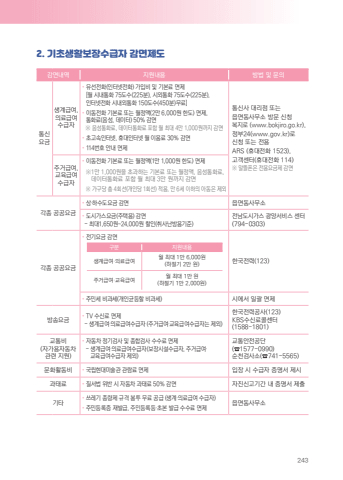 2432. %uae30%ucd08%uc0dd%ud65c%ubcf4%uc7a5%uc218%uae09%uc790 %uac10%uba74%uc81c%ub3c4%uac10%uba74%ub0b4%uc5ed %uc9c0%uc6d0%ub0b4%uc6a9 %ubc29%ubc95 %ubc0f %ubb38%uc758%ud1b5%uc2e0%uc694%uae08%uc0dd%uacc4%uae09%uc5ec, %uc758%ub8cc%uae09%uc5ec%uc218%uae09%uc790%u2022 %uc720%uc120%uc804%ud654(%uc778%ud130%ub137%uc804%ud654) %uac00%uc785%ube44 %ubc0f %uae30%ubcf8%ub8cc %uba74%uc81c[%uc6d4 %uc2dc%ub0b4%ud1b5%ud654 75%ub3c4%uc218(225%ubd84), %uc2dc%uc678%ud1b5%ud654 75%ub3c4%uc218(225%ubd84), %uc778%ud130%ub137%uc804%ud654 %uc2dc%ub0b4%uc678%ud1b5%ud654 150%ub3c4%uc218(450%ubd84)%ubb34%ub8cc]%u2022 %uc774%ub3d9%uc804%ud654 %uae30%ubcf8%ub8cc %ub610%ub294 %uc6d4%uc815%uc561(2%ub9cc 6,000%uc6d0 %ud55c%ub3c4) %uba74%uc81c, %ud1b5%ud654%ub8cc(%uc74c%uc131, %ub370%uc774%ud130) 50% %uac10%uba74 %u203b %uc74c%uc131%ud1b5%ud654%ub8cc, %ub370%uc774%ud130%ud1b5%ud654%ub8cc %ud3ec%ud568 %uc6d4 %ucd5c%ub300 4%ub9cc 1,000%uc6d0%uae4c%uc9c0 %uac10%uba74%u2022 %ucd08%uace0%uc18d%uc778%ud130%ub137, %ud734%ub300%uc778%ud130%ub137 %uc6d4 %uc774%uc6a9%ub8cc 30% %uac10%uba74%u2022 114%ubc88%ud638 %uc548%ub0b4 %uba74%uc81c%ud1b5%uc2e0%uc0ac %ub300%ub9ac%uc810 %ub610%ub294%uc74d%uba74%ub3d9%uc0ac%ubb34%uc18c %ubc29%ubb38 %uc2e0%uccad%ubcf5%uc9c0%ub85c (www.bokjiro.go.kr),%uc815%ubd8024(www.gov.kr)%ub85c %uc2e0%uccad %ub610%ub294 %uc804%uc6a9 ARS (%ud734%ub300%uc804%ud654 1523),%uace0%uac1d%uc13c%ud130(%ud734%ub300%uc804%ud654 114)%uc8fc%uac70%uae09%uc5ec, %u203b %uc54c%ub730%ud3f0%uc740 %uc804%uc6a9%uc694%uae08%uc81c %uac10%uba74%uad50%uc721%uae09%uc5ec%uc218%uae09%uc790%u2022 %uc774%ub3d9%uc804%ud654 %uae30%ubcf8%ub8cc %ub610%ub294 %uc6d4%uc815%uc561(1%ub9cc 1,000%uc6d0 %ud55c%ub3c4) %uba74%uc81c%u203b1%ub9cc 1,000%uc6d0%uc744 %ucd08%uacfc%ud558%ub294 %uae30%ubcf8%ub8cc %ub610%ub294 %uc6d4%uc815%uc561, %uc74c%uc131%ud1b5%ud654%ub8cc,%ub370%uc774%ud130%ud1b5%ud654%ub8cc %ud3ec%ud568 %uc6d4 %ucd5c%ub300 3%ub9cc %uc6d0%uae4c%uc9c0 %uac10%uba74%u203b %uac00%uad6c%ub2f9 %ucd1d 4%ud68c%uc120(%uac1c%uc778%ub2f9 1%ud68c%uc120) %uc801%uc6a9, %ub9cc 6%uc138 %uc774%ud558%uc758 %uc544%ub3d9%uc740 %uc81c%uc678%uac01%uc885 %uacf5%uacf5%uc694%uae08%u2022 %uc0c1%u00b7%ud558%uc218%ub3c4%uc694%uae08 %uac10%uba74 %uc74d%uba74%ub3d9%uc0ac%ubb34%uc18c%u2022 %ub3c4%uc2dc%uac00%uc2a4%uc694%uae08(%uc8fc%ud0dd%uc6a9) %uac10%uba74- %ucd5c%ub3001,650%uc6d0~24,000%uc6d0 %ud560%uc778(%ucde8%uc0ac%ub09c%ubc29%uc6a9%uae30%uc900)%uc804%ub0a8%ub3c4%uc2dc%uac00%uc2a4 %uad11%uc591%uc11c%ube44%uc2a4 %uc13c%ud130(794-0303)%uac01%uc885 %uacf5%uacf5%uc694%uae08%u2022 %uc804%uae30%uc694%uae08 %uac10%uba74 %uad6c%ubd84 %uc9c0%uc6d0%ub0b4%uc6a9%uc0dd%uacc4%uae09%uc5ec%u00b7%uc758%ub8cc%uae09%uc5ec %uc6d4 %ucd5c%ub300 1%ub9cc 6,000%uc6d0(%ud558%uc808%uae30 2%ub9cc %uc6d0)%uc8fc%uac70%uae09%uc5ec%u00b7%uad50%uc721%uae09%uc5ec %uc6d4 %ucd5c%ub300 1%ub9cc %uc6d0(%ud558%uc808%uae30 1%ub9cc 2,000%uc6d0)%ud55c%uad6d%uc804%ub825(123)%u2022 %uc8fc%ubbfc%uc138 %ube44%uacfc%uc138(%uac1c%uc778%uade0%ub4f1%ud560 %ube44%uacfc%uc138) %uc2dc%uc5d0%uc11c %uc77c%uad04 %uba74%uc81c%ubc29%uc1a1%uc694%uae08 %u2022 TV %uc218%uc2e0%ub8cc %uba74%uc81c- %uc0dd%uacc4%uae09%uc5ec%u00b7%uc758%ub8cc%uae09%uc5ec%uc218%uae09%uc790 (%uc8fc%uac70%uae09%uc5ec%u00b7%uad50%uc721%uae09%uc5ec%uc218%uae09%uc790%ub294 %uc81c%uc678)%ud55c%uad6d%uc804%ub825%uacf5%uc0ac(123)KBS%uc218%uc2e0%ub8cc%ucf5c%uc13c%ud130(1588-1801)%uad50%ud1b5%ube44(%uc790%uac00%uc6a9%uc790%ub3d9%ucc28 %uad00%ub828 %uc9c0%uc6d0)%u2022 %uc790%ub3d9%ucc28 %uc815%uae30%uac80%uc0ac %ubc0f %uc885%ud569%uac80%uc0ac %uc218%uc218%ub8cc %uba74%uc81c- %uc0dd%uacc4%uae09%uc5ec%u00b7%uc758%ub8cc%uae09%uc5ec%uc218%uae09%uc790(%ubcf4%uc7a5%uc2dc%uc124%uc218%uae09%uc790, %uc8fc%uac70%uae09%uc5ec%u00b7%uad50%uc721%uae09%uc5ec%uc218%uae09%uc790 %uc81c%uc678)%uad50%ud1b5%uc548%uc804%uacf5%ub2e8(%u260e1577-0990)%uc21c%ucc9c%uac80%uc0ac%uc18c(%u260e741-5565)%ubb38%ud654%ud65c%ub3d9%ube44 %u2022 %uad6d%ub9bd%ud604%ub300%ubbf8%uc220%uad00 %uad00%ub78c%ub8cc %uba74%uc81c %uc785%uc7a5 %uc2dc %uc218%uae09%uc790 %uc99d%uba85%uc11c %uc81c%uc2dc%uacfc%ud0dc%ub8cc %u2022 %uc9c8%uc11c%ubc95 %uc704%ubc18 %uc2dc %uc790%ub3d9%ucc28 %uacfc%ud0dc%ub8cc 50% %uac10%uba74 %uc790%uc9c4%uc2e0%uace0%uae30%uac04 %ub0b4 %uc99d%uba85%uc11c %uc81c%ucd9c%uae30%ud0c0%u2022 %uc4f0%ub808%uae30 %uc885%ub7c9%uc81c %uaddc%uaca9 %ubd09%ud22c %ubb34%ub8cc %uacf5%uae09 (%uc0dd%uacc4%u00b7%uc758%ub8cc%uae09%uc5ec %uc218%uae09%uc790)%u2022 %uc8fc%ubbfc%ub4f1%ub85d%uc99d %uc7ac%ubc1c%uae09, %uc8fc%ubbfc%ub4f1%ub85d%ub4f1%u00b7%ucd08%ubcf8 %ubc1c%uae09 %uc218%uc218%ub8cc %uba74%uc81c %uc74d%uba74%ub3d9%uc0ac%ubb34%uc18c