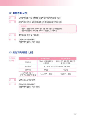 24912. %uc790%ud65c%uadfc%ub85c %uc0ac%uc5c5%ub300%u0009 %uc0c1 %uadfc%ub85c%ub2a5%ub825 %uc788%ub294 %uad6d%ubbfc%uae30%ucd08%uc0dd%ud65c %uc218%uae09%uc790 %ubc0f %ucc28%uc0c1%uc704%uacc4%uce35 %uc911 %ud76c%ub9dd%uc790%ub0b4 %u0009 %uc6a9 %uc790%ud65c%uadfc%ub85c%uc0ac%uc5c5%ub2e8%uc758 %uc77c%uc790%ub9ac%ub97c %uc81c%uacf5%ud558%uace0 %ucc38%uc5ec%uc790%uc5d0%uac8c %uc778%uac74%ube44 %uc9c0%uae09%uc6b4%uc601%uc0ac%uc5c5%u00b7%uad11%uc591%uc2dc : %uc74d%uba74%ub3d9%uc0ac%ubb34%uc18c %uc0ac%ud68c%ubcf5%uc9c0 %uc5c5%ubb34 %uc218%ud589 %ubcf4%uc870%u00b7%uc9c0%uc6d0 %ub610%ub294 %uc9c0%uc5ed%ud658%uacbd%uc815%ube44%u00b7%uad11%uc591%uc9c0%uc5ed%uc790%ud65c%uc13c%ud130 : %ubcf5%uc9c0%uac04%ubcd1, %uc624%ubc31%uad6d%uc218, %uacc4%ub2e8%uccad%uc18c, %uad50%uad6c%uc138%ucc99 %ub4f1%ubc29 %u0009 %ubc95 %uc8fc%ubbfc%ubcf5%uc9c0%uacfc %ubc29%ubb38 %ubc0f %uc804%ud654 %uc0c1%ub2f4%ubb38%u0009 %uc758 %uc8fc%ubbfc%ubcf5%uc9c0%uacfc 797-2810%uad11%uc591%uc9c0%uc5ed%uc790%ud65c%uc13c%ud130 762-989613. %ud76c%ub9dd%uc800%ucd95%uacc4%uc88c(%u2160,%u2161)%uad6c %ubd84 %ud76c%ub9dd%uc800%ucd95%uacc4%uc88c%u2160 %ud76c%ub9dd%uc800%ucd95%uacc4%uc88c%u2161%uac00%uc785%ub300%uc0c1 %uc77c%ud558%ub294 %uc0dd%uacc4%u00b7%uc758%ub8cc%uae09%uc5ec%uc218%uae09 %uac00%uad6c%uc77c%ud558%ub294 %uc8fc%uac70%u00b7%uad50%uc721%uae09%uc5ec %uc218%uae09%uac00%uad6c %ubc0f %ucc28%uc0c1%uc704 %uac00%uad6c%ubcf8%uc778%uc800%ucd95 %uc6d4 10%ub9cc%uc6d0 %uc774%uc0c1 ~ 50%ub9cc%uc6d0 %uc774%ud558 %uc790%uc728 %uc800%ucd95%uc815%ubd80%uc9c0%uc6d0 30%ub9cc%uc6d0 10%ub9cc%uc6d03%ub144 %ud3c9%uade0 %uc800%ucd95 %uc2dc (%ubcf8%uc778 %uc800%ucd95 360%ub9cc%uc6d0 %ud3ec%ud568) 1,440%ub9cc%uc6d0 + %uc774%uc790 720%ub9cc%uc6d0 + %uc774%uc790%ubc29%u0009 %ubc95 %uc74d%uba74%ub3d9%uc0ac%ubb34%uc18c %ubc29%ubb38 %uc2e0%uccad%ubb38%u0009 %uc758 %uc8fc%ubbfc%ubcf5%uc9c0%uacfc 797-2810%uad11%uc591%uc9c0%uc5ed%uc790%ud65c%uc13c%ud130 762-9896%uac00%uc785%ub300%uc0c1%ubc0f %ub0b4%uc6a9