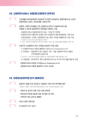 25728. %uc0b0%ub9bc%ubcf5%uc9c0%uc11c%ube44%uc2a4 %uc774%uc6a9%uad8c(%uc0b0%ub9bc%ubcf5%uc9c0 %ubc14%uc6b0%ucc98)%ub300%u0009 %uc0c1 %uae30%ucd08%uc0dd%ud65c%uc218%uae09%uc790(%uc0dd%uacc4%uae09%uc5ec%u00b7%uc758%ub8cc%uae09%uc5ec%u00b7%uc8fc%uac70%uae09%uc5ec%u00b7%uad50%uc721%uae09%uc5ec), %uc7a5%uc560(%uc544%ub3d9)%uc218%ub2f9 %uc218%uae09%uc790, %uc7a5%uc560%uc778%uc5f0%uae08 %uc218%uae09%uc790, %ucc28%uc0c1%uc704%uacc4%uce35, %ud55c%ubd80%ubaa8%uac00%uc871%ub0b4%u0009 %uc6a9 %uacbd%uc81c%uc801, %uc0ac%ud68c%uc801 %uc5b4%ub824%uc6c0%uc744 %uac00%uc9c4 %uc0b0%ub9bc%ubcf5%uc9c0%uc18c%uc678%uc790%uac00 %uc0b0%ub9bc%ubcf5%uc9c0%uc11c%ube44%uc2a4%ub97c %uc774%uc6a9%ud560 %uc218 %uc788%ub3c4%ub85d %uc77c%uc815%uae08%uc561%uc758 %uc774%uc6a9%uad8c%uc744 %uc9c0%uc6d0%ud558%ub294 %uc0ac%uc5c5%u00bb %uc0b0%ub9bc%ubcf5%uc9c0%uc11c%ube44%uc2a4%uc774%uc6a9%uad8c(%ubc14%uc6b0%ucc98) %uc9c0%uae09 : 1%uc778%ub2f9 %uc5f0 10%ub9cc%uc6d0%u00bb %uc0b0%ub9bc%ubcf5%uc9c0%uc11c%ube44%uc2a4%uc81c%uacf5%uc790%ub85c %ub4f1%ub85d%ub41c %uc804%uad6d %uc0b0%ub9bc%ubcf5%uc9c0%uc2dc%uc124(%uc790%uc5f0%ud734%uc591%ub9bc, %uce58%uc720%uc758 %uc232, %uc0b0%ub9bc%uad50%uc721%uc13c%ud130, %uc218%ubaa9%uc6d0, %uc0b0%ub9bc%ub808%ud3ec%uce20%uc2dc%uc124, %uc815%uc6d0, %uc720%uc544%uc232 %uccb4%ud5d8%uc6d0 %ub4f1) %uc0ac%uc6a9 %uac00%ub2a5 %u203b %uc0ac%uc6a9%uac00%ub2a5 %uae30%uad00 %uc804%uad6d 295%uac1c(%uc804%ub0a8%ub3c4 65%uac1c) %u203b %uad00%ub0b4 : %ubc31%uc6b4%uc0b0%uc790%uc5f0%ud734%uc591%ub9bc %uc219%ubc15%uc2dc%uc124, %ubc31%uc6b4%uc0b0 %uce58%uc720%uc758 %uc232, %uad11%uc591%ubaa9%uc7ac%ubb38%ud654%uccb4%ud5d8%uc7a5 %uc774%uc6a9 %uac00%ub2a5%ubc29%u0009 %ubc95 %uc2e0%uccad%uae30%uac04 %ub0b4 %ud648%ud398%uc774%uc9c0 %ub610%ub294 %uc6b0%ud3b8%uc811%uc218(%ub300%uc0c1%uc790 %uc9c1%uc811 %uc2e0%uccad)%u00bb %u2460 %uc0b0%ub9bc%ubcf5%uc9c0%uc11c%ube44%uc2a4%uc774%uc6a9%uad8c %ud648%ud398%uc774%uc9c0 %uc811%uc218(www.forestcard.or.kr)%u00bb %u2461 %uc6b0%ud3b8%uc811%uc218 : %ub300%uc804%uad11%uc5ed%uc2dc %uc911%uad6c %uc911%uc559%ub85c 149, 10%uce35 %uc0b0%ub9bc%ubcf5%uc9c0%uc11c%ube44%uc2a4%uc774%uc6a9%uad8c %uace0%uac1d%uc9c0%uc6d0%uc13c%ud130 %ub2f4%ub2f9%uc790 %uc55e %u203b %uc2e0%uccad%uae30%uac04 : %ub9e4%ub144 %ud55c%uad6d%uc0b0%ub9bc%ubcf5%uc9c0%uc9c4%ud765%uc6d0 %ubc0f %uc774%uc6a9%uad8c %ud648%ud398%uc774%uc9c0%ub97c %ud1b5%ud574 %ubcc4%ub3c4 %uacf5%uc9c0%u00bb %u2462 %uc0ac%uc6a9%ubc29%ubc95 : KB%uad6d%ubbfc%uce74%ub4dc %uba85%uc758 %uc2e0%uc6a9/%uccb4%ud06c/KB Pay %uba38%ub2c8%ubc31 %uce74%ub4dc(%uc120%ubd88) %ubc1c%uae09 %ud6c4 %uc2e0%uccad%ubb38 %u0009 %uc758 %u2022 %uc0b0%ub9bc%ubcf5%uc9c0%uc11c%ube44%uc2a4%uc774%uc6a9%uad8c %ub204%ub9ac%uc9d1(www.forestcard.or.kr)%u2022 %uc0b0%ub9bc%ubcf5%uc9c0%uc11c%ube44%uc2a4%uc774%uc6a9%uad8c %ucf5c%uc13c%ud130(%u260f1544-3228)29. %uc544%ud1a0%ud53c%uc131%ud53c%ubd80%uc5fc%u00b7%ucc9c%uc2dd %uc608%ubc29%uad00%ub9ac%ub300%u0009 %uc0c1 %uc54c%ub808%ub974%uae30 %uc9c8%ud658*%uc73c%ub85c %uc9c4%ub2e8%ubc1b%uace0 %uce58%ub8cc%uc911%uc778 18%uc138 %uc774%ud558 %ucde8%uc57d%uacc4%uce35 %ud658%uc544*%uc54c%ub808%ub974%uae30 %uc9c8%ud658: %uc544%ud1a0%ud53c%uc131%ud53c%ubd80%uc5fc(%uc0c1%ubcd1%ucf54%ub4dcL20), %ucc9c%uc2dd%ud658%uc544(%uc0c1%ubcd1%ucf54%ub4dcJ45)%ub0b4%u0009 %uc6a9 %u2022 %uc9c4%ub8cc%ube44 %ubc0f %uac80%uc0ac%ube44 %uc9c0%uc6d0: %uc5f0%uac04 %ucd5c%ub300 20%ub9cc%uc6d0%u2022 %uc544%ud1a0%ud53c%uc131 %ud53c%ubd80%uc5fc %ubcf4%uc2b5%uc81c %uc9c0%uc6d0: %ubd84%uae30%ubcc4 2%uac1c %uc9c0%uc6d0%u2022 %uc9c0%uc5ed%uc8fc%ubbfc %ub300%uc0c1 %uad50%uc721 %ubc0f %ucea0%ud398%uc778%ubc29%u0009 %ubc95 %ubcf4%uac74%uc18c %ubc29%ubb38%u00b7%uc804%ud654%uc2e0%uccad%ubb38%u0009 %uc758 %ub3c4%uc2dc%ubcf4%uac74%uacfc 797-4012