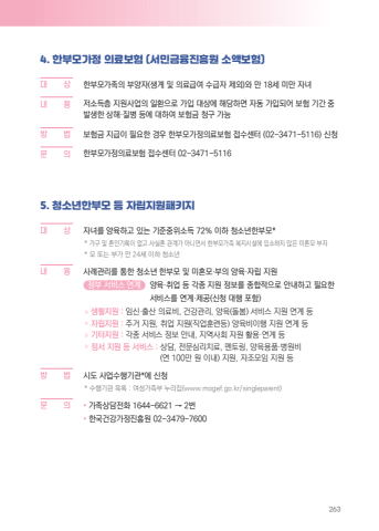 2634. %ud55c%ubd80%ubaa8%uac00%uc815 %uc758%ub8cc%ubcf4%ud5d8 (%uc11c%ubbfc%uae08%uc735%uc9c4%ud765%uc6d0 %uc18c%uc561%ubcf4%ud5d8)%ub300%u0009 %uc0c1 %ud55c%ubd80%ubaa8%uac00%uc871%uc758 %ubd80%uc591%uc790(%uc0dd%uacc4 %ubc0f %uc758%ub8cc%uae09%uc5ec %uc218%uae09%uc790 %uc81c%uc678)%uc640 %ub9cc 18%uc138 %ubbf8%ub9cc %uc790%ub140%ub0b4%u0009 %uc6a9 %uc800%uc18c%ub4dd%uce35 %uc9c0%uc6d0%uc0ac%uc5c5%uc758 %uc77c%ud658%uc73c%ub85c %uac00%uc785 %ub300%uc0c1%uc5d0 %ud574%ub2f9%ud558%uba74 %uc790%ub3d9 %uac00%uc785%ub418%uc5b4 %ubcf4%ud5d8 %uae30%uac04 %uc911 %ubc1c%uc0dd%ud55c %uc0c1%ud574%u00b7%uc9c8%ubcd1 %ub4f1%uc5d0 %ub300%ud558%uc5ec %ubcf4%ud5d8%uae08 %uccad%uad6c %uac00%ub2a5%ubc29 %u0009 %ubc95 %ubcf4%ud5d8%uae08 %uc9c0%uae09%uc774 %ud544%uc694%ud55c %uacbd%uc6b0 %ud55c%ubd80%ubaa8%uac00%uc815%uc758%ub8cc%ubcf4%ud5d8 %uc811%uc218%uc13c%ud130 (02-3471-5116) %uc2e0%uccad%ubb38 %u0009 %uc758 %ud55c%ubd80%ubaa8%uac00%uc815%uc758%ub8cc%ubcf4%ud5d8 %uc811%uc218%uc13c%ud130 02-3471-51165. %uccad%uc18c%ub144%ud55c%ubd80%ubaa8 %ub4f1 %uc790%ub9bd%uc9c0%uc6d0%ud328%ud0a4%uc9c0%ub300 %u0009 %uc0c1 %uc790%ub140%ub97c %uc591%uc721%ud558%uace0 %uc788%ub294 %uae30%uc900%uc911%uc704%uc18c%ub4dd 72% %uc774%ud558 %uccad%uc18c%ub144%ud55c%ubd80%ubaa8** %uac00%uad6c %ubc0f %ud63c%uc778%uae30%ub85d%uc774 %uc5c6%uace0 %uc0ac%uc2e4%ud63c %uad00%uacc4%uac00 %uc544%ub2c8%uba74%uc11c %ud55c%ubd80%ubaa8%uac00%uc871 %ubcf5%uc9c0%uc2dc%uc124%uc5d0 %uc785%uc18c%ud558%uc9c0 %uc54a%uc740 %ubbf8%ud63c%ubaa8%u00b7%ubd80%uc790* %ubaa8 %ub610%ub294 %ubd80%uac00 %ub9cc 24%uc138 %uc774%ud558 %uccad%uc18c%ub144%ub0b4%u0009 %uc6a9 %uc0ac%ub840%uad00%ub9ac%ub97c %ud1b5%ud55c %uccad%uc18c%ub144 %ud55c%ubd80%ubaa8 %ubc0f %ubbf8%ud63c%ubaa8%u00b7%ubd80%uc758 %uc591%uc721%u00b7%uc790%ub9bd %uc9c0%uc6d0 %uc815%ubd80 %uc11c%ube44%uc2a4 %uc5f0%uacc4 %uc591%uc721%u00b7%ucde8%uc5c5 %ub4f1 %uac01%uc885 %uc9c0%uc6d0 %uc815%ubcf4%ub97c %uc885%ud569%uc801%uc73c%ub85c %uc548%ub0b4%ud558%uace0 %ud544%uc694%ud55c %uc11c%ube44%uc2a4%ub97c %uc5f0%uacc4%u00b7%uc81c%uacf5(%uc2e0%uccad %ub300%ud589 %ud3ec%ud568)%u00bb %uc0dd%ud65c%uc9c0%uc6d0 : %uc784%uc2e0%u00b7%ucd9c%uc0b0 %uc758%ub8cc%ube44, %uac74%uac15%uad00%ub9ac, %uc591%uc721(%ub3cc%ubd04) %uc11c%ube44%uc2a4 %uc9c0%uc6d0 %uc5f0%uacc4 %ub4f1%u00bb %uc790%ub9bd%uc9c0%uc6d0 : %uc8fc%uac70 %uc9c0%uc6d0, %ucde8%uc5c5 %uc9c0%uc6d0(%uc9c1%uc5c5%ud6c8%ub828%ub4f1) %uc591%uc721%ube44%uc774%ud589 %uc9c0%uc6d0 %uc5f0%uacc4 %ub4f1%u00bb %uae30%ud0c0%uc9c0%uc6d0 : %uac01%uc885 %uc11c%ube44%uc2a4 %uc815%ubcf4 %uc548%ub0b4, %uc9c0%uc5ed%uc0ac%ud68c %uc790%uc6d0 %ud65c%uc6a9%u00b7%uc5f0%uacc4 %ub4f1%u00bb %uc815%uc11c %uc9c0%uc6d0 %ub4f1 %uc11c%ube44%uc2a4 : %uc0c1%ub2f4, %uc804%ubb38%uc2ec%ub9ac%uce58%ub8cc, %uba58%ud1a0%ub9c1, %uc591%uc721%uc6a9%ud488%u00b7%ubcd1%uc6d0%ube44(%uc5f0 100%ub9cc %uc6d0 %uc774%ub0b4) %uc9c0%uc6d0, %uc790%uc870%ubaa8%uc784 %uc9c0%uc6d0 %ub4f1%ubc29 %u0009 %ubc95 %uc2dc%ub3c4 %uc0ac%uc5c5%uc218%ud589%uae30%uad00*%uc5d0 %uc2e0%uccad* %uc218%ud589%uae30%uad00 %ubaa9%ub85d : %uc5ec%uc131%uac00%uc871%ubd80 %ub204%ub9ac%uc9d1(www.mogef.go.kr/singleparent)%ubb38 %u0009 %uc758 %u2022 %uac00%uc871%uc0c1%ub2f4%uc804%ud654 1644-6621 %u2192 2%ubc88%u2022 %ud55c%uad6d%uac74%uac15%uac00%uc815%uc9c4%ud765%uc6d0 02-3479-7600