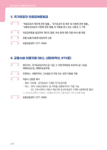2025 %uad11%uc591%uc2dc %uc0dd%uc560%ubcf5%uc9c0%uc815%ucc45 %uc548%ub0b4%uc11c2725. %uad6d%uac00%uc720%uacf5%uc790 %uc758%ub8cc%uae09%uc5ec%uc99d%ubc1c%uae09%ub300 %u0009 %uc0c1 %u300c%ub3c5%ub9bd%uc720%uacf5%uc790 %uc608%uc6b0%uc5d0 %uad00%ud55c %ubc95%ub960%u300d, %u300c%uad6d%uac00%uc720%uacf5%uc790 %ub4f1 %uc608%uc6b0 %ubc0f %uc9c0%uc6d0%uc5d0 %uad00%ud55c %ubc95%ub960%u300d, %u300c%ubcf4%ud6c8%ubcf4%uc0c1%ub300%uc0c1%uc790 %uc9c0%uc6d0%uc5d0 %uad00%ud55c %ubc95%ub960%u300d%uc758 %uc801%uc6a9%uc744 %ubc1b%uace0 %uc788%ub294 %uc0ac%ub78c%uacfc %uadf8 %uac00%uc871%ub0b4 %u0009 %uc6a9 %uc758%ub8cc%uae09%uc5ec%uc99d%uc744 %ubc1c%uae09%ud558%uc5ec %uac1c%uc778%uc758 %uc9c8%ubcd1, %ubd80%uc0c1 %ub4f1%uc5d0 %ub300%ud55c %uc758%ub8cc%uc11c%ube44%uc2a4%ub97c %uc81c%uacf5%ubc29%u0009 %ubc95 %uad00%ud560 %ubcf4%ud6c8(%uc9c0)%uccad%uc5d0 %ubc29%ubb38%ud558%uc5ec %uc2e0%uccad%ubb38%u0009 %uc758 %ubcf4%ud6c8%uc0c1%ub2f4%uc13c%ud130 1577-06066. %uad50%ud1b5%uc2dc%uc124 %uc774%uc6a9%uc9c0%uc6d0 (%ubc84%uc2a4, %ub0b4%ud56d%uc5ec%uac1d%uc120, KTX%ub4f1)%ub300 %u0009 %uc0c1 %uc560%uad6d%uc9c0%uc0ac, %uad6d%uac00%uc720%uacf5%uc0c1%uc774%uc790(1%uae09~7%uae09), 5.18%ubbfc%uc8fc%ud654%uc6b4%ub3d9 %ubd80%uc0c1%uc790(1%uae09~14%uae09),%uc7ac%ud574%ubd80%uc0c1%uad70%uacbd, %uc7ac%ud574%ubd80%uc0c1%uacf5%ubb34%uc6d0%ub0b4%u0009 %uc6a9 %ubbfc%uc601%ubc84%uc2a4, %ub0b4%ud56d%uc5ec%uac1d%uc120, %uace0%uc18d%ucca0%ub3c4%uc758 %ubb34%ub8cc %ub610%ub294 %uac10%uba74 %uc774%uc6a9%uc744 %uc9c0%uc6d0%ubc29 %u0009 %ubc95 %uc774%uc6a9%uc2dc %uc2e0%ubd84%uc99d %uc81c%uc2dc %u00bb %uc5f4%ucc28, %uc9c0%ud558%ucca0 : %uc0c1%uc774%ub4f1%uae09%uc774 %uae30%uc7ac%ub41c %uad6d%uac00%uc720%uacf5%uc790%uc99d%u00bb %ubc84%uc2a4 : %uc804%uad6d %uc2dc%ub0b4(%uad70%ub0b4)%ubc84%uc2a4 %ubc0f %uc9c0%ud558%ucca0 %uad50%ud1b5%ubcf5%uc9c0%uce74%ub4dc %uc774%uc6a9 %uac00%ub2a5(%ub2e8, %uace0%uc18d%uc2dc%uc678%ubc84%uc2a4 %uc774%uc6a9%uc2dc %ub300%uc0c1%uad6c%ubd84 %ubc0f %uc0c1%uc774%ub4f1%uae09%uc774 %uae30%uc7ac%ub41c %uc2e0%ubd84%ud655%uc778%uc99d %ud544%uc694)%u203b %uc218%ub3c4%uad8c %ubc0f %uad11%uc5ed%uc2dc %uc2dc%ub0b4%ubc84%uc2a4, %uc9c0%ud558%ucca0%uc740 %ubcf5%uc9c0%uce74%ub4dc %uc774%uc6a9%uac00%ub2a5(%ub2e8, %uc9c0%uc5ed %uac04 %ud638%ud658 %uc548%ub428)%ubb38%u0009 %uc758 %ubcf4%ud6c8%uc0c1%ub2f4%uc13c%ud130 1577-0606