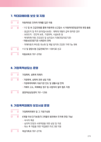 2737. %ud559%ub300%ud53c%ud574%uc544%ub3d9 %ubcf4%ud638 %ubc0f %uc9c0%uc6d0%ub300%u0009 %uc0c1 %uc544%ub3d9%ud559%ub300%ub85c %uc778%ud558%uc5ec %ud53c%ud574%ub97c %uc785%uc740 %uc544%ub3d9%ub0b4 %u0009 %uc6a9 %u2022 112 %ubc0f %u5e02 %uae34%uae09%uc804%ud654%ub97c %ud1b5%ud574 %uc544%ub3d9%ud559%ub300 %uc2e0%uace0%uc811%uc218 %uc2dc %uc544%ub3d9%ud559%ub300%uc804%ub2f4%uacf5%ubb34%uc6d0 %ud604%uc7a5 %ucd9c%ub3d9%u00bb %uc751%uae09%uc870%uce58 %ubc0f %uc989%uac01 %ubd84%ub9ac(%uc77c%uc2dc%ubcf4%ud638) : %uc7ac%ud559%ub300 %uc704%ud5d8%uc774 %uae09%ubc15%u00b7%ud604%uc800%ud55c %uacbd%uc6b0 %u00bb %ubcf4%ud638%uc870%uce58 : %uce5c%uc778%ucc99 %ubcf4%ud638, %uac00%uc815%uc704%ud0c1, %uc2dc%uc124%ubcf4%ud638 %ub4f1%u00bb %ud559%ub300%ud53c%ud574 %uc544%ub3d9 %uac74%uac15%uac80%uc9c4 %ubc0f %uc2ec%ub9ac%uac80%uc0ac %uc9c0%uc6d0(%uc804%ub2f4%uc758%ub8cc%uae30%uad00)%u2022 %uc544%ub3d9%ubcf4%ud638%uc804%ubb38%uae30%uad00 %uc0ac%ub840%uad00%ub9ac %uc5f0%uacc4%u00bb %ud53c%ud574%uc544%ub3d9%uc758 %ud6c4%uc720%uc99d %ucd5c%uc18c%ud654 %ubc0f %uc7ac%ubc1c %ubc29%uc9c0%uc640 %uac74%uac15%ud55c %uac00%uc871%uae30%ub2a5 %ud68c%ubcf5%ubc29%u0009 %ubc95 112 %ubc0f %uad11%uc591%uc2dc%uccad %uae34%uae09%uc804%ud654(791-1391)%ub85c %uc2e0%uace0%ubb38 %u0009 %uc758 %uc544%ub3d9%ubcf4%uc721%uacfc 797-37508. %uac00%uc815%ud3ed%ub825%uc0c1%ub2f4%uc18c %uc6b4%uc601%ub300%u0009 %uc0c1 %uac00%uc815%ud3ed%ub825, %uc131%ud3ed%ub825 %ud53c%ud574%uc790%ub0b4 %u0009 %uc6a9 %u2022 %uac00%uc815%ud3ed%ub825, %uc131%ud3ed%ub825 %uad00%ub828 %uc0c1%ub2f4 %uc9c0%uc6d0%u2022 %uac00%uc815%ud3ed%ub825%ud53c%ud574%uc790 %uc758%ub8cc%uae30%uad00 %uc778%ub3c4 %ubc0f %uc0dd%ud65c%uc2dc%uc124 %uc5f0%uacc4%u2022 %uac00%ud574%uc790 %uace0%uc18c, %ud53c%ud574%ubc30%uc0c1 %uccad%uad6c %ub4f1 %uc0ac%ubc95%ucc98%ub9ac %uc808%ucc28 %ud611%uc870 %uc9c0%uc6d0%ubb38 %u0009 %uc758 %uad11%uc591%uc5ec%uc131%uc0c1%ub2f4%uc13c%ud130 761-12569. %uac00%uc815%ud3ed%ub825%ud53c%ud574%uc790 %ubcf4%ud638%uc2dc%uc124 %uc6b4%uc601%ub300 %u0009 %uc0c1 %uac00%uc815%ud3ed%ub825%ud53c%ud574%uc790 %ubc0f %uadf8 %uac00%uc815%uad6c%uc131%uc6d0%ub0b4%u0009 %uc6a9 6%uac1c%uc6d4 %uc774%ub0b4 %ub2e8%uae30%ubcf4%ud638(%uac01 3%uac1c%uc6d4%uc758 %ubc94%uc704%uc5d0%uc11c %ub450%ucc28%ub840 %uc5f0%uc7a5 %uac00%ub2a5)%u00bb %uc219%uc2dd%uc758 %uc81c%uacf5%u00bb %uc2ec%ub9ac%uc801 %uc548%uc815%uacfc %uc0ac%ud68c%uc801%uc751%uc744 %uc704%ud55c %uc0c1%ub2f4 %ubc0f %uce58%ub8cc%u00bb %ud1f4%uc18c %ud6c4 %uc790%ub9bd%uc744 %uc704%ud55c %uc9c1%uc5c5%ud6c8%ub828 %ud504%ub85c%uadf8%ub7a8 %uc9c0%uc6d0%ubb38 %u0009 %uc758 %uc5ec%uc131%uac00%uc871%uacfc 797-2776