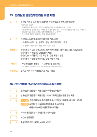 2025 %uad11%uc591%uc2dc %uc0dd%uc560%ubcf5%uc9c0%uc815%ucc45 %uc548%ub0b4%uc11c3825. %uc804%ub77c%ub0a8%ub3c4 %uacf5%uacf5%uc0b0%ud6c4%uc870%ub9ac%uc6d0 %ube44%uc6a9 %uc9c0%uc6d0%ub300%u0009 %uc0c1 %uc2e0%uccad%uc77c %uae30%uc900 %ubd80 %ub610%ub294 %ubaa8%uac00 %uad11%uc591%uc2dc%uc5d0 %uc8fc%ubbfc%ub4f1%ub85d%uc744 %ub454 %uac10%uba74%uc0ac%uc720 %ub300%uc0c1%uc790** %uac10%uba74%uc0ac%uc720 %ub300%uc0c1%uc790%ub458%uc9f8%uc544 %uc774%uc0c1 %ucd9c%uc0b0 %uc0b0%ubaa8, %uad6d%ubbfc%uae30%ucd08%uc0dd%ud65c %uc218%uae09%uc790, %ucc28%uc0c1%uc704%uacc4%uce35(%uc0c1%uc704 120%),%uc81c1%uae09~%uc81c3%uae09 %uc7a5%uc560%uc778 %ub610%ub294 %uadf8 %ubc30%uc6b0%uc790, %uad6d%uac00%uc720%uacf5%uc790, %uc720%uc871, %uac00%uc871%uc73c%ub85c %uacb0%uc815%ub41c %uc0ac%ub78c %ub610%ub294 %uadf8 %ubc30%uc6b0%uc790, %ub2e4%ubb38%ud654%uac00%uc871%uc758 %uc0b0%ubaa8, %ubbf8%ud63c%ubaa8, %ubd81%ud55c%uc774%ud0c8%uc8fc%ubbfc %ub610%ub294 %uadf8 %ubc30%uc6b0%uc7905.18 %ubbfc%uc8fc %uc720%uacf5%uc790 %uc720%uc871 %ub610%ub294 %uac00%uc871, %uadc0%ub18d%uc5b4%u00b7%uadc0%ucd0c%uc778%ub0b4%u0009 %uc6a9 %uc804%ub77c%ub0a8%ub3c4 %uacf5%uacf5%uc0b0%ud6c4%uc870%ub9ac%uc6d0 %uc774%uc6a9 %ube44%uc6a9 70% %uc9c0%uc6d0%u00bb %uc774%uc6a9%ub8cc%ub294 %uc0b0%ubaa8 1%uba85, %uc601%uc720%uc544 1%uba85%ub2f9 1%uc77c %uae30%uc900 %ub2e8%uac00 11%ub9cc%uc6d0 %u203b %uc30d%ud0dc%uc544 %uc774%uc0c1%uc758 %uacbd%uc6b0 1%uba85%ub2f9 30% %uc774%uc6a9%ub8cc %uac00%uc0b0 %u0009%uc2e0%uccad%uc808%ucc28 %u2460 (%uc774%uc6a9%uc790 %u21d2 %uacf5%uacf5%uc0b0%ud6c4%uc870%ub9ac%uc6d0) 28%uc8fc %uc774%ud6c4 %ubb38%uc758(* %uc608%uc57d %uac00%ub2a5 %uc2dc%uc810 %uae30%uad00%ubcc4 %uc0c1%uc774)%u2461 (%uc774%uc6a9%uc790 %u21d2 %ubcf4%uac74%uc18c) %uac10%uba74%uc2e0%uccad%uc11c %uc81c%ucd9c%u2462 (%ubcf4%uac74%uc18c %u21d2 %uc774%uc6a9%uc790) %uc0ac%uc720 %ud655%uc778 %ud6c4, %uac10%uba74 %ud655%uc778%uc11c %ubc1c%uae09%u2463 (%uc774%uc6a9%uc790 %u21d2 %uacf5%uacf5%uc0b0%ud6c4%uc870%ub9ac%uc6d0) %uac10%uba74 %ud655%uc778%uc11c %uc81c%ucd9c%u0009%uad6c%ube44%uc11c%ub958 %u2022 %uc8fc%ubbfc%ub4f1%ub85d%ub4f1%ubcf8, %uc2e0%ubd84%uc99d %u2022 %uac10%uba74%uc0ac%uc720%ubcc4 %uc99d%ube59%uc11c%ub958%uc608) %ub458%uc9f8%uc544 %uc774%uc0c1 %ucd9c%uc0b0 %uc0b0%ubaa8: %uc8fc%ubbfc%ub4f1%ub85d%ub4f1%ubcf8, %uac00%uc871%uad00%uacc4%uc99d%uba85%uc11c%ubc29%ubc95/%ubb38%uc758 %ubcf4%uac74%uc18c %ubc29%ubb38 %uc2e0%uccad / %ucd9c%uc0dd%ubcf4%uac74%uacfc 797-406626. %uc0b0%ubaa8%uc2e0%uc0dd%uc544 %uac74%uac15%uad00%ub9ac %ubcf8%uc778%ubd80%ub2f4%uae08 %ucd94%uac00%uc9c0%uc6d0%ub300 %u0009 %uc0c1 %uc0b0%ubaa8%uc2e0%uc0dd%uc544 %uac74%uac15%uad00%ub9ac %uc9c0%uc6d0%uc0ac%uc5c5(%ubc14%uc6b0%ucc98 %uc0dd%uc131) %ub300%uc0c1%uc790%ub0b4 %u0009 %uc6a9 %uc0b0%ubaa8%uc2e0%uc0dd%uc544 %uac74%uac15%uad00%ub9ac %uc9c0%uc6d0%uc0ac%uc5c5 %uc11c%ube44%uc2a4 %uac00%uaca9%uc758 %ubcf8%uc778%ubd80%ub2f4%uae08 %uc77c%ubd80 %uc9c0%uc6d0%uae30 %u0009 %uc900 %ub3c4 %uc9c0%uc6d0 %ubaa8%uac00 %uad11%uc591%uc2dc%uc5d0 %uc8fc%ubbfc%ub4f1%ub85d %ub454 %ucd9c%uc0b0%uac00%uc815(%ubcf8%uc778%ubd80%ub2f4%uae08 %ub0b4 %ucd5c%ub300 19%ub9cc%uc6d0) %uc2dc %uc9c0%uc6d0 %ubd80%ubaa8%uc640 %uadf8 %uc2e0%uc0dd%uc544%uac00 %uc8fc%ubbfc%ub4f1%ub85d%uc744 %ub454 %ucd9c%uc0b0%uac00%uc815(%ud45c%uc900%uc11c%ube44%uc2a4%uc2dc%uac04%uc774%uc6a9%ub8cc%uc758 90%%uc9c0%uc6d0)%uae30%u0009 %ud55c %uc11c%ube44%uc2a4 %uc885%ub8cc%uc77c%ub85c%ubd80%ud130 6%uac1c%uc6d4 %uc774%ub0b4(%uc0ac%ud6c4 %uc2e0%uccad)%ubc29%u0009 %ubc95 %ubcf4%uac74%uc18c %ubc29%ubb38%uc2e0%uccad%ubb38 %u0009 %uc758 %ucd9c%uc0dd%ubcf4%uac74%uacfc 797-4026, 4891, 4757