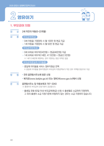 2025 %uad11%uc591%uc2dc %uc0dd%uc560%ubcf5%uc9c0%uc815%ucc45 %uc548%ub0b4%uc11c421. %ubd80%ubaa8%uae09%uc5ec %uc9c0%uc6d0%ub300%u0009 %uc0c1 2%uc138 %ubbf8%ub9cc%uc758 %uc544%ub3d9(0~23%uac1c%uc6d4)%ub0b4%u0009 %uc6a9 %ubd80%ubaa8%uae09%uc5ec(%ud604%uae08) %u00bb 0%uc138 %uc544%ub3d9%uc744 %uac00%uc815%uc591%uc721 %uc2dc %uc6d4 100%ub9cc %uc6d0 %ud604%uae08 %uc9c0%uae09%u00bb 1%uc138 %uc544%ub3d9%uc744 %uac00%uc815%uc591%uc721 %uc2dc %uc6d4 50%ub9cc %uc6d0 %ud604%uae08 %uc9c0%uae09 %ubd80%ubaa8%uae09%uc5ec(%ubcf4%uc721%ub8cc) %u00bb 0%uc138 %ubcf4%uc721%ub8cc %ubc14%uc6b0%ucc98(54%ub9cc%uc6d0) + %ud604%uae08(46%ub9cc%uc6d0) %uc9c0%uae09%u00bb 1%uc138 %ubcf4%uc721%ub8cc %ubc14%uc6b0%ucc98(1%uc138%ubc18, 47.5%ub9cc%uc6d0) + %ud604%uae08(2.5%ub9cc%uc6d0)%u203b 1%uc138%uac00 0%uc138%ubc18%uc5d0 %uc7ac%uc6d0%ud558%ub294 %uacbd%uc6b0 %uc9c0%uc6d0%ub418%ub294 %ud604%uae08 %ucc28%uc561%uc740 %uc5c6%uc74c %ubd80%ubaa8%uae09%uc5ec(%uc885%uc77c%uc81c %uc544%uc774%ub3cc%ubd04) %u00bb %uc885%uc77c%uc81c %uc544%uc774%ub3cc%ubd04 %uc11c%ube44%uc2a4 %uc815%ubd80%uc9c0%uc6d0%uae08 %uc804%uc561 %u203b %uc885%uc77c%uc81c %uc544%uc774%ub3cc%ubd04 %uc815%ubd80%uc9c0%uc6d0%uae08%uc774 %ubd80%ubaa8%uae09%uc5ec %uc9c0%uc6d0%uae08%uc561%ubcf4%ub2e4 %uc791%uc740 %uacbd%uc6b0 %ucc28%uc561%uc744 %ud604%uae08%uc73c%ub85c %uc9c0%uae09%ubc29%u0009 %ubc95 %u2022 %uc804%uad6d %uc74d%uba74%ub3d9%uc0ac%ubb34%uc18c%uc5d0 %ubc29%ubb38 %uc2e0%uccad%u2022 %ubcf5%uc9c0%ub85c(www.bokjiro.go.kr) %ub610%ub294 %uc815%ubd8024(www.gov.kr)%uc5d0%uc11c %uc2e0%uccad%ubb38%u0009 %uc758 %uc74d%uba74%ub3d9%uc0ac%ubb34%uc18c %ubc0f %uc544%ub3d9%ubcf4%uc721%uacfc 797-3343%u203b %ucd9c%uc0dd%uc544%uc758 %ubd80%ubaa8%uae09%uc5ec %uc2e0%uccad%uae30%ud55c%uc774 %uad81%uae08%ud569%ub2c8%ub2e4.%u00bb %ucd9c%uc0dd%uc77c %ud3ec%ud568 60%uc77c %uc774%ub0b4 %ubd80%ubaa8%uae09%uc5ec(%ud604%uae08) %uc2e0%uccad %uc2dc %ucd9c%uc0dd%uc6d4%ub85c %uc18c%uae09%ud558%uc5ec %uc9c0%uc6d0%ud558%uba70, %uadf8 %uc678%uc758 %ucd9c%uc0dd%uc544 %uc18c%uae09 %uc9c0%uc6d0%uae30%uc900%uc5d0 %ubd80%ud569%ud558%uc9c0 %uc54a%ub294 %uacbd%uc6b0%ub294 %uc18c%uae09 %uc9c0%uc6d0%ud558%uc9c0 %uc54a%uc2b5%ub2c8%ub2e4.2 %uc601%uc720%uc544%uae30