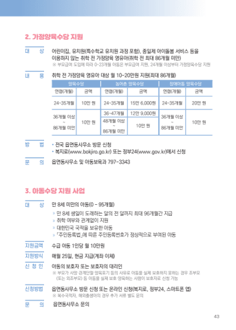 432. %uac00%uc815%uc591%uc721%uc218%ub2f9 %uc9c0%uc6d0%ub300%u0009 %uc0c1 %uc5b4%ub9b0%uc774%uc9d1, %uc720%uce58%uc6d0(%ud2b9%uc218%ud559%uad50 %uc720%uce58%uc6d0 %uacfc%uc815 %ud3ec%ud568), %uc885%uc77c%uc81c %uc544%uc774%ub3cc%ubd04 %uc11c%ube44%uc2a4 %ub4f1%uc744 %uc774%uc6a9%ud558%uc9c0 %uc54a%ub294 %ucde8%ud559 %uc804 %uac00%uc815%uc591%uc721 %uc601%uc720%uc544(%ucde8%ud559 %uc804 %ucd5c%ub300 86%uac1c%uc6d4 %ubbf8%ub9cc)%u203b %ubd80%ubaa8%uae09%uc5ec %ub3c4%uc785%uc5d0 %ub530%ub77c 0~23%uac1c%uc6d4 %uc544%ub3d9%uc740 %ubd80%ubaa8%uae09%uc5ec %uc9c0%uc6d0, 24%uac1c%uc6d4 %uc774%uc0c1%ubd80%ud130 %uac00%uc815%uc591%uc721%uc218%ub2f9 %uc9c0%uc6d0%ub0b4%u0009 %uc6a9 %ucde8%ud559 %uc804 %uac00%uc815%uc591%uc721 %uc601%uc720%uc544 %ub300%uc0c1 %uc6d4 10~20%ub9cc%uc6d0 %uc9c0%uc6d0(%ucd5c%ub300 86%uac1c%uc6d4)%uc591%uc721%uc218%ub2f9 %ub18d%uc5b4%ucd0c %uc591%uc721%uc218%ub2f9 %uc7a5%uc560%uc544%ub3d9 %uc591%uc721%uc218%ub2f9%uc5f0%ub839(%uac1c%uc6d4) %uae08%uc561 %uc5f0%ub839(%uac1c%uc6d4) %uae08%uc561 %uc5f0%ub839(%uac1c%uc6d4) %uae08%uc56124~35%uac1c%uc6d4 10%ub9cc %uc6d0 24~35%uac1c%uc6d4 15%ub9cc 6,000%uc6d0 24~35%uac1c%uc6d4 20%ub9cc %uc6d036%uac1c%uc6d4 %uc774%uc0c1 ~86%uac1c%uc6d4 %ubbf8%ub9cc10%ub9cc %uc6d036~47%uac1c%uc6d4 12%ub9cc 9,000%uc6d0 36%uac1c%uc6d4 %uc774%uc0c1 ~86%uac1c%uc6d4 %ubbf8%ub9cc48%uac1c%uc6d4 %uc774%uc0c1 10%ub9cc %uc6d0~86%uac1c%uc6d4 %ubbf8%ub9cc10%ub9cc %uc6d0%ubc29%u0009 %ubc95 %u2022 %uc804%uad6d %uc74d%uba74%ub3d9%uc0ac%ubb34%uc18c %ubc29%ubb38 %uc2e0%uccad%u2022 %ubcf5%uc9c0%ub85c(www.bokjiro.go.kr) %ub610%ub294 %uc815%ubd8024(www.gov.kr)%uc5d0%uc11c %uc2e0%uccad%ubb38%u0009 %uc758 %uc74d%uba74%ub3d9%uc0ac%ubb34%uc18c %ubc0f %uc544%ub3d9%ubcf4%uc721%uacfc 797-33433. %uc544%ub3d9%uc218%ub2f9 %uc9c0%uc6d0 %uc0ac%uc5c5%ub300%u0009 %uc0c1 %ub9cc 8%uc138 %ubbf8%ub9cc%uc758 %uc544%ub3d9(0 ~ 95%uac1c%uc6d4)%u00bb %ub9cc 8%uc138 %uc0dd%uc77c%uc774 %ub3c4%ub798%ud558%ub294 %ub2ec%uc758 %uc804 %ub2ec%uae4c%uc9c0 %ucd5c%ub300 96%uac1c%uc6d4%uac04 %uc9c0%uae09%u00bb %ucde8%ud559 %uc5ec%ubd80%uc640 %uad00%uacc4%uc5c6%uc774 %uc9c0%uc6d0%u00bb %ub300%ud55c%ubbfc%uad6d %uad6d%uc801%uc744 %ubcf4%uc720%ud55c %uc544%ub3d9%u00bb %u300c%uc8fc%ubbfc%ub4f1%ub85d%ubc95%u300d%uc5d0 %ub530%ub978 %uc8fc%ubbfc%ub4f1%ub85d%ubc88%ud638%uac00 %uc815%uc0c1%uc801%uc73c%ub85c %ubd80%uc5ec%ub41c %uc544%ub3d9%uc9c0%uc6d0%uae08%uc561%u0009 %uc218%uae09 %uc544%ub3d9 1%uc778%ub2f9 %uc6d4 10%ub9cc%uc6d0%uc9c0%uc6d0%ubc29%uc2dd%u0009 %ub9e4%uc6d4 25%uc77c, %ud604%uae08 %uc9c0%uae09(%uacc4%uc88c %uc774%uccb4)%uc2e0 %uccad %uc778 %uc544%ub3d9%uc758 %ubcf4%ud638%uc790 %ub610%ub294 %ubcf4%ud638%uc790%uc758 %ub300%ub9ac%uc778%u203b %ubd80%ubaa8%uac00 %uc0ac%ub9dd%u00b7%uad00%uacc4%ub2e8%uc808%u00b7%uc591%uc721%ud3ec%uae30 %ub4f1%uc758 %uc0ac%uc720%ub85c %uc544%ub3d9%uc744 %uc2e4%uc81c %ubcf4%ud638%ud558%uc9c0 %ubabb%ud558%ub294 %uacbd%uc6b0 %uc870%ubd80%ubaa8(%ub610%ub294 %uc678%uc870%ubd80%ubaa8) %ub4f1 %uc544%ub3d9%uc744 %uc2e4%uc81c %ubcf4%ud638%u00b7%uc591%uc721%ud558%ub294 %uc0ac%ub78c%uc774 %ubcf4%ud638%uc790%ub85c %uc2e0%uccad %uac00%ub2a5%uc2e0%uccad%ubc29%ubc95%u0009 %uc74d%uba74%ub3d9%uc0ac%ubb34%uc18c %ubc29%ubb38 %uc2e0%uccad %ub610%ub294 %uc628%ub77c%uc778 %uc2e0%uccad(%ubcf5%uc9c0%ub85c, %uc815%ubd8024, %uc2a4%ub9c8%ud2b8%ud3f0 %uc571)%u203b %ubcf5%uc218%uad6d%uc801%uc790, %ud574%uc678%ucd9c%uc0dd%uc544%uc758 %uacbd%uc6b0 %ucd94%uac00 %uc11c%ub958 %ubcc4%ub3c4 %ubb38%uc758%ubb38%u0009 %uc758 %uc74d%uba74%ub3d9%uc0ac%ubb34%uc18c %ubb38%uc758