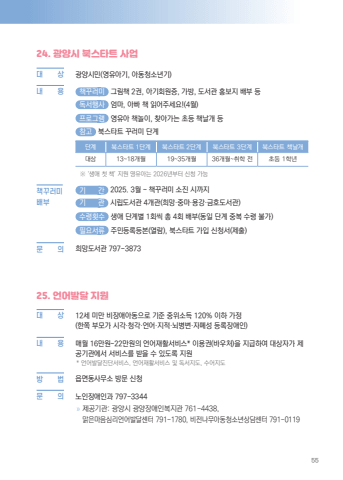 5524. %uad11%uc591%uc2dc %ubd81%uc2a4%ud0c0%ud2b8 %uc0ac%uc5c5%ub300%u0009 %uc0c1 %uad11%uc591%uc2dc%ubbfc(%uc601%uc720%uc544%uae30, %uc544%ub3d9%uccad%uc18c%ub144%uae30)%ub0b4%u0009 %uc6a9 %ucc45%uafb8%ub7ec%ubbf8 %uadf8%ub9bc%ucc45 2%uad8c, %uc544%uae30%ud68c%uc6d0%uc99d, %uac00%ubc29, %ub3c4%uc11c%uad00 %ud64d%ubcf4%uc9c0 %ubc30%ubd80 %ub4f1 %ub3c5%uc11c%ud589%uc0ac %uc5c4%ub9c8, %uc544%ube60 %ucc45 %uc77d%uc5b4%uc8fc%uc138%uc694!(4%uc6d4) %ud504%ub85c%uadf8%ub7a8 %uc601%uc720%uc544 %ucc45%ub180%uc774, %ucc3e%uc544%uac00%ub294 %ucd08%ub4f1 %ucc45%ub0a0%uac1c %ub4f1 %ucc38%uace0 %ubd81%uc2a4%ud0c0%ud2b8 %uafb8%ub7ec%ubbf8 %ub2e8%uacc4%ub2e8%uacc4 %ubd81%uc2a4%ud0c0%ud2b8 1%ub2e8%uacc4 %ubd81%uc2a4%ud0c0%ud2b8 2%ub2e8%uacc4 %ubd81%uc2a4%ud0c0%ud2b8 3%ub2e8%uacc4 %ubd81%uc2a4%ud0c0%ud2b8 %ucc45%ub0a0%uac1c%ub300%uc0c1 13~18%uac1c%uc6d4 19~35%uac1c%uc6d4 36%uac1c%uc6d4~%ucde8%ud559 %uc804 %ucd08%ub4f1 1%ud559%ub144 %u203b %u2018%uc0dd%uc560 %uccab %ucc45%u2019 %uc9c0%uc6d0 %uc601%uc720%uc544%ub294 2026%ub144%ubd80%ud130 %uc2e0%uccad %uac00%ub2a5 %uae30 %uac04 2025. 3%uc6d4 ~ %ucc45%uafb8%ub7ec%ubbf8 %uc18c%uc9c4 %uc2dc%uae4c%uc9c0 %uae30 %uad00 %uc2dc%ub9bd%ub3c4%uc11c%uad00 4%uac1c%uad00(%ud76c%ub9dd%u00b7%uc911%ub9c8%u00b7%uc6a9%uac15%u00b7%uae08%ud638%ub3c4%uc11c%uad00) %uc218%ub839%ud69f%uc218 %uc0dd%uc560 %ub2e8%uacc4%ubcc4 1%ud68c%uc529 %ucd1d 4%ud68c %ubc30%ubd80(%ub3d9%uc77c %ub2e8%uacc4 %uc911%ubcf5 %uc218%ub839 %ubd88%uac00) %ud544%uc694%uc11c%ub958 %uc8fc%ubbfc%ub4f1%ub85d%ub4f1%ubcf8(%uc5f4%ub78c), %ubd81%uc2a4%ud0c0%ud2b8 %uac00%uc785 %uc2e0%uccad%uc11c(%uc81c%ucd9c)%ubb38%u0009 %uc758 %ud76c%ub9dd%ub3c4%uc11c%uad00 797-387325. %uc5b8%uc5b4%ubc1c%ub2ec %uc9c0%uc6d0%ub300%u0009 %uc0c1 12%uc138 %ubbf8%ub9cc %ube44%uc7a5%uc560%uc544%ub3d9%uc73c%ub85c %uae30%uc900 %uc911%uc704%uc18c%ub4dd 120% %uc774%ud558 %uac00%uc815(%ud55c%ucabd %ubd80%ubaa8%uac00 %uc2dc%uac01%u00b7%uccad%uac01%u00b7%uc5b8%uc5b4%u00b7%uc9c0%uc801%u00b7%ub1cc%ubcd1%ubcc0%u00b7%uc790%ud3d0%uc131 %ub4f1%ub85d%uc7a5%uc560%uc778) %ub0b4%u0009 %uc6a9 %ub9e4%uc6d4 16%ub9cc%uc6d0~22%ub9cc%uc6d0%uc758 %uc5b8%uc5b4%uc7ac%ud65c%uc11c%ube44%uc2a4* %uc774%uc6a9%uad8c(%ubc14%uc6b0%ucc98)%uc744 %uc9c0%uae09%ud558%uc5ec %ub300%uc0c1%uc790%uac00 %uc81c%uacf5%uae30%uad00%uc5d0%uc11c %uc11c%ube44%uc2a4%ub97c %ubc1b%uc744 %uc218 %uc788%ub3c4%ub85d %uc9c0%uc6d0 * %uc5b8%uc5b4%ubc1c%ub2ec%uc9c4%ub2e8%uc11c%ube44%uc2a4, %uc5b8%uc5b4%uc7ac%ud65c%uc11c%ube44%uc2a4 %ubc0f %ub3c5%uc11c%uc9c0%ub3c4, %uc218%uc5b4%uc9c0%ub3c4%ubc29%u0009 %ubc95 %uc74d%uba74%ub3d9%uc0ac%ubb34%uc18c %ubc29%ubb38 %uc2e0%uccad%ubb38%u0009 %uc758 %ub178%uc778%uc7a5%uc560%uc778%uacfc 797-3344%u00bb %uc81c%uacf5%uae30%uad00: %uad11%uc591%uc2dc %uad11%uc591%uc7a5%uc560%uc778%ubcf5%uc9c0%uad00 761-4438, %ub9d1%uc740%ub9c8%uc74c%uc2ec%ub9ac%uc5b8%uc5b4%ubc1c%ub2ec%uc13c%ud130 791-1780, %ube44%uc804%ub098%ubb34%uc544%ub3d9%uccad%uc18c%ub144%uc0c1%ub2f4%uc13c%ud130 791-0119%ucc45%uafb8%ub7ec%ubbf8%ubc30%ubd80