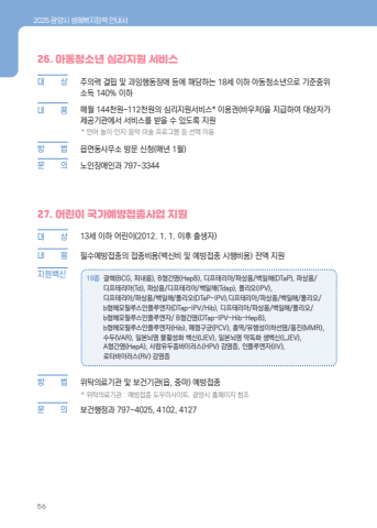 2025 %uad11%uc591%uc2dc %uc0dd%uc560%ubcf5%uc9c0%uc815%ucc45 %uc548%ub0b4%uc11c5626. %uc544%ub3d9%uccad%uc18c%ub144 %uc2ec%ub9ac%uc9c0%uc6d0 %uc11c%ube44%uc2a4%ub300%u0009 %uc0c1 %uc8fc%uc758%ub825 %uacb0%ud54d %ubc0f %uacfc%uc789%ud589%ub3d9%uc7a5%uc560 %ub4f1%uc5d0 %ud574%ub2f9%ud558%ub294 18%uc138 %uc774%ud558 %uc544%ub3d9%uccad%uc18c%ub144%uc73c%ub85c %uae30%uc900%uc911%uc704%uc18c%ub4dd 140% %uc774%ud558%ub0b4 %u0009 %uc6a9 %ub9e4%uc6d4 144%ucc9c%uc6d0~112%ucc9c%uc6d0%uc758 %uc2ec%ub9ac%uc9c0%uc6d0%uc11c%ube44%uc2a4* %uc774%uc6a9%uad8c(%ubc14%uc6b0%ucc98)%uc744 %uc9c0%uae09%ud558%uc5ec %ub300%uc0c1%uc790%uac00 %uc81c%uacf5%uae30%uad00%uc5d0%uc11c %uc11c%ube44%uc2a4%ub97c %ubc1b%uc744 %uc218 %uc788%ub3c4%ub85d %uc9c0%uc6d0* %uc5b8%uc5b4%u00b7%ub180%uc774%u00b7%uc778%uc9c0%u00b7%uc74c%uc545%u00b7%ubbf8%uc220 %ud504%ub85c%uadf8%ub7a8 %ub4f1 %uc120%ud0dd %uc774%uc6a9%ubc29%u0009 %ubc95 %uc74d%uba74%ub3d9%uc0ac%ubb34%uc18c %ubc29%ubb38 %uc2e0%uccad(%ub9e4%ub144 1%uc6d4)%ubb38 %u0009 %uc758 %ub178%uc778%uc7a5%uc560%uc778%uacfc 797-334427. %uc5b4%ub9b0%uc774 %uad6d%uac00%uc608%ubc29%uc811%uc885%uc0ac%uc5c5 %uc9c0%uc6d0%ub300%u0009 %uc0c1 13%uc138 %uc774%ud558 %uc5b4%ub9b0%uc774(2012. 1. 1. %uc774%ud6c4 %ucd9c%uc0dd%uc790)%ub0b4%u0009 %uc6a9 %ud544%uc218%uc608%ubc29%uc811%uc885%uc758 %uc811%uc885%ube44%uc6a9(%ubc31%uc2e0%ube44 %ubc0f %uc608%ubc29%uc811%uc885 %uc2dc%ud589%ube44%uc6a9) %uc804%uc561 %uc9c0%uc6d0%uc9c0%uc6d0%ubc31%uc2e0%u0009 19%uc885 %uacb0%ud575(BCG, %ud53c%ub0b4%uc6a9), B%ud615%uac04%uc5fc(HepB), %ub514%ud504%ud14c%ub9ac%uc544/%ud30c%uc0c1%ud48d/%ubc31%uc77c%ud574(DTaP), %ud30c%uc0c1%ud48d/%ub514%ud504%ud14c%ub9ac%uc544(Td), %ud30c%uc0c1%ud48d/%ub514%ud504%ud14c%ub9ac%uc544/%ubc31%uc77c%ud574(Tdap), %ud3f4%ub9ac%uc624(IPV), %ub514%ud504%ud14c%ub9ac%uc544/%ud30c%uc0c1%ud48d/%ubc31%uc77c%ud574/%ud3f4%ub9ac%uc624(DTaP-IPV),%ub514%ud504%ud14c%ub9ac%uc544/%ud30c%uc0c1%ud48d/%ubc31%uc77c%ud574/%ud3f4%ub9ac%uc624/b%ud615%ud5e4%ubaa8%ud544%ub8e8%uc2a4%uc778%ud50c%ub8e8%uc5d4%uc790(DTap-IPV/Hib), %ub514%ud504%ud14c%ub9ac%uc544/%ud30c%uc0c1%ud48d/%ubc31%uc77c%ud574/%ud3f4%ub9ac%uc624/ b%ud615%ud5e4%ubaa8%ud544%ub8e8%uc2a4%uc778%ud50c%ub8e8%uc5d4%uc790/ B%ud615%uac04%uc5fc(DTap-IPV-Hib-HepB), b%ud615%ud5e4%ubaa8%ud544%ub8e8%uc2a4%uc778%ud50c%ub8e8%uc5d4%uc790(Hib), %ud3d0%ub834%uad6c%uade0(PCV), %ud64d%uc5ed/%uc720%ud589%uc131%uc774%ud558%uc120%uc5fc/%ud48d%uc9c4(MMR), %uc218%ub450(VAR), %uc77c%ubcf8%ub1cc%uc5fc %ubd88%ud65c%uc131%ud654 %ubc31%uc2e0(IJEV), %uc77c%ubcf8%ub1cc%uc5fc %uc57d%ub3c5%ud654 %uc0dd%ubc31%uc2e0(LJEV), A%ud615%uac04%uc5fc(HepA), %uc0ac%ub78c%uc720%ub450%uc885%ubc14%uc774%ub7ec%uc2a4(HPV) %uac10%uc5fc%uc99d, %uc778%ud50c%ub8e8%uc5d4%uc790(IIV), %ub85c%ud0c0%ubc14%uc774%ub7ec%uc2a4(RV) %uac10%uc5fc%uc99d%ubc29%u0009 %ubc95 %uc704%ud0c1%uc758%ub8cc%uae30%uad00 %ubc0f %ubcf4%uac74%uae30%uad00(%uc74d, %uc911%ub9c8) %uc608%ubc29%uc811%uc885* %uc704%ud0c1%uc758%ub8cc%uae30%uad00 : %uc608%ubc29%uc811%uc885 %ub3c4%uc6b0%ubbf8%uc0ac%uc774%ud2b8, %uad11%uc591%uc2dc %ud648%ud398%uc774%uc9c0 %ucc38%uc870%ubb38%u0009 %uc758 %ubcf4%uac74%ud589%uc815%uacfc 797-4025, 4102, 4127