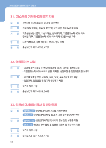2025 %uad11%uc591%uc2dc %uc0dd%uc560%ubcf5%uc9c0%uc815%ucc45 %uc548%ub0b4%uc11c5831. %uc800%uc18c%ub4dd%uce35 %uae30%uc800%uadc0%u00b7%uc870%uc81c%ubd84%uc720 %uc9c0%uc6d0%ub300%u0009 %uc0c1 %uad11%uc591%uc2dc%uc5d0 %uc8fc%ubbfc%ub4f1%ub85d%uc744 %ub454 24%uac1c%uc6d4 %ubbf8%ub9cc %uc601%uc544%ub0b4%u0009 %uc6a9 %uae30%uc800%uadc0(%uc6d4 9%ub9cc%uc6d0), %ubd84%uc720(%uc6d4 11%ub9cc%uc6d0) %uad6c%uc785 %ube44%uc6a9 %ucd5c%ub300 24%uac1c%uc6d4 %uc9c0%uc6d0%uae30 %u0009 %uc900 %uae30%ucd08%uc0dd%ud65c%ubcf4%uc7a5%uc218%uae09%uc790, %ucc28%uc0c1%uc704%uacc4%uce35, %ud55c%ubd80%ubaa8%uac00%uc871, %uae30%uc900%uc911%uc704%uc18c%ub4dd 80% %uc774%ud558 %uc7a5%uc560%uc778 %uac00%uad6c, %uae30%uc900%uc911%uc704%uc18c%ub4dd 80% %uc774%ud558 %ub2e4%uc790%ub140(2%uc778 %uc774%uc0c1) %uac00%uad6c%ubc29%u0009 %ubc95 %uc628%ub77c%uc778(%ubcf5%uc9c0%ub85c, %uc815%ubd80 24) %ub610%ub294 %ubcf4%uac74%uc18c %ubc29%ubb38 %uc2e0%uccad%ubb38%u0009 %uc758 %ucd9c%uc0dd%ubcf4%uac74%uacfc 797-4752, 475732. %uc601%uc591%ud50c%ub7ec%uc2a4 %uc0ac%uc5c5%ub300%u0009 %uc0c1 %u2022 %uad11%uc591%uc2dc %uc8fc%ubbfc%ub4f1%ub85d%uc744 %ub454 %uc601%uc720%uc544(66%uac1c%uc6d4 %ubbf8%ub9cc), %uc784%uc0b0%ubd80, %ucd9c%uc0b0%uc218%uc720%ubd80%u2022 %uae30%uc900%uc911%uc704%uc18c%ub4dd 80% %uc774%ud558%uc758 %ube48%ud608, %uc800%uccb4%uc911, %uc131%uc7a5%ubd80%uc9c4 %ub4f1 %uc601%uc591%uc704%ud5d8%uc694%uc778 %ubcf4%uc720%uc790%ub0b4 %u0009 %uc6a9 %u2022 %uac00%uad6c%ubcc4 %ub9de%ucda4%ud615 %ubcf4%ucda9 %uc2dd%ud488(%uc300, %uac10%uc790, %ub2ec%uac40, %uc6b0%uc720 %ub4f1) %uc6d4 2%ud68c %uc81c%uacf5%u2022 %uc601%uc591%uad50%uc721, %uc601%uc591%uc0c1%ub2f4 %ubc0f %uc815%uae30%uc801 %uc601%uc591%ud3c9%uac00 %uc81c%uacf5%ubc29%u0009 %ubc95 %ubcf4%uac74%uc18c %ubc29%ubb38 %uc2e0%uccad%ubb38 %u0009 %uc758 %ucd9c%uc0dd%ubcf4%uac74%uacfc 797-4033, 364933. %uc120%ucc9c%uc131 %ub300%uc0ac%uc774%uc0c1 %uac80%uc0ac %ubc0f %ud658%uc544%uad00%ub9ac%ub300%u0009 %uc0c1 %uac80%uc0ac%ube44 %uc9c0%uc6d0 %uc120%ucc9c%uc131%ub300%uc0ac%uc774%uc0c1 %uac80%uc0ac%ub97c %uc2dc%ud589%ud55c %uc601%uc544 %ud658%uc544 %uc9c0%uc6d0 %uc120%ucc9c%uc131%ub300%uc0ac%uc774%uc0c1 %ubc0f %ud76c%uadc0 %ub4f1 %uae30%ud0c0 %uc9c8%ud658 %uc9c4%ub2e8%ubc1b%uc740 %ud658%uc544%ub0b4%u0009 %uc6a9 %uac80%uc0ac%ube44 %uc9c0%uc6d0 %uc120%ucc9c%uc131%ub300%uc0ac%uc774%uc0c1 %uac80%uc0ac%ube44%uc758 %uc77c%ubd80 %ubcf8%uc778 %ubd80%ub2f4%uae08 %uc9c0%uc6d0 %ud658%uc544 %uc9c0%uc6d0 %ubcf4%uac74%uc18c %ud658%uc544 %ub4f1%ub85d %ud6c4 %ubc1c%uc0dd%ud55c %uc758%ub8cc%ube44 %ubc0f %ud2b9%uc218%uc2dd%uc774 %uc9c0%uc6d0%ubc29%u0009 %ubc95 %ubcf4%uac74%uc18c %ubc29%ubb38 %uc2e0%uccad%ubb38%u0009 %uc758 %ucd9c%uc0dd%ubcf4%uac74%uacfc 797-4752, 4757