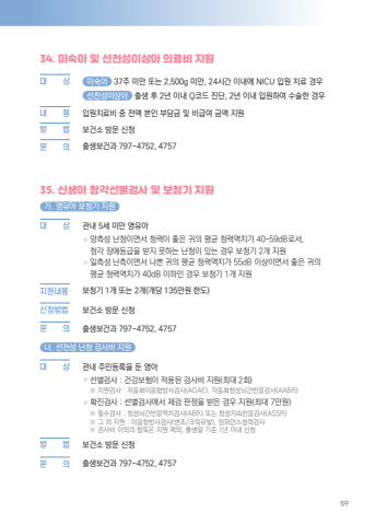 5934. %ubbf8%uc219%uc544 %ubc0f %uc120%ucc9c%uc131%uc774%uc0c1%uc544 %uc758%ub8cc%ube44 %uc9c0%uc6d0%ub300%u0009 %uc0c1 %ubbf8%uc219%uc544 37%uc8fc %ubbf8%ub9cc %ub610%ub294 2,500g %ubbf8%ub9cc, 24%uc2dc%uac04 %uc774%ub0b4%uc5d0 NICU %uc785%uc6d0 %uce58%ub8cc %uacbd%uc6b0 %uc120%ucc9c%uc131%uc774%uc0c1%uc544 %ucd9c%uc0dd %ud6c4 2%ub144 %uc774%ub0b4 Q%ucf54%ub4dc %uc9c4%ub2e8, 2%ub144 %uc774%ub0b4 %uc785%uc6d0%ud558%uc5ec %uc218%uc220%ud55c %uacbd%uc6b0%ub0b4%u0009 %uc6a9 %uc785%uc6d0%uce58%ub8cc%ube44 %uc911 %uc804%uc561 %ubcf8%uc778 %ubd80%ub2f4%uae08 %ubc0f %ube44%uae09%uc5ec %uae08%uc561 %uc9c0%uc6d0%ubc29%u0009 %ubc95 %ubcf4%uac74%uc18c %ubc29%ubb38 %uc2e0%uccad%ubb38%u0009 %uc758 %ucd9c%uc0dd%ubcf4%uac74%uacfc 797-4752, 475735. %uc2e0%uc0dd%uc544 %uccad%uac01%uc120%ubcc4%uac80%uc0ac %ubc0f %ubcf4%uccad%uae30 %uc9c0%uc6d0 %uac00. %uc601%uc720%uc544 %ubcf4%uccad%uae30 %uc9c0%uc6d0 %ub300%u0009 %uc0c1 %uad00%ub0b4 5%uc138 %ubbf8%ub9cc %uc601%uc720%uc544%u00bb %uc591%uce21%uc131 %ub09c%uccad%uc774%uba74%uc11c %uccad%ub825%uc774 %uc88b%uc740 %uadc0%uc758 %ud3c9%uade0 %uccad%ub825%uc5ed%uce58%uac00 40~59dB%ub85c%uc11c,%uccad%uac01 %uc7a5%uc560%ub4f1%uae09%uc744 %ubc1b%uc9c0 %ubabb%ud558%ub294 %ub09c%uccad%uc774 %uc788%ub294 %uacbd%uc6b0 %ubcf4%uccad%uae30 2%uac1c %uc9c0%uc6d0%u00bb %uc77c%uce21%uc131 %ub09c%uce21%uc774%uba74%uc11c %ub098%uc05c %uadc0%uc758 %ud3c9%uade0 %uccad%ub825%uc5ed%uce58%uac00 55dB %uc774%uc0c1%uc774%uba74%uc11c %uc88b%uc740 %uadc0%uc758 %ud3c9%uade0 %uccad%ub825%uc5ed%uce58%uac00 40dB %uc774%ud558%uc778 %uacbd%uc6b0 %ubcf4%uccad%uae30 1%uac1c %uc9c0%uc6d0%uc9c0%uc6d0%ub0b4%uc6a9%u0009 %ubcf4%uccad%uae30 1%uac1c %ub610%ub294 2%uac1c(%uac1c%ub2f9 135%ub9cc%uc6d0 %ud55c%ub3c4) %uc2e0%uccad%ubc29%ubc95%u0009 %ubcf4%uac74%uc18c %ubc29%ubb38 %uc2e0%uccad %ubb38%u0009 %uc758 %ucd9c%uc0dd%ubcf4%uac74%uacfc 797-4752, 4757 %ub098. %uc120%ucc9c%uc131 %ub09c%uccad %uac80%uc0ac%ube44 %uc9c0%uc6d0 %ub300%u0009 %uc0c1 %uad00%ub0b4 %uc8fc%ubbfc%ub4f1%ub85d%uc744 %ub454 %uc601%uc544 %u00bb %uc120%ubcc4%uac80%uc0ac : %uac74%uac15%ubcf4%ud5d8%uc774 %uc801%uc6a9%ub41c %uac80%uc0ac%ube44 %uc9c0%uc6d0(%ucd5c%ub300 2%ud68c) %u203b %uc9c0%uc6d0%uac80%uc0ac : %uc790%ub3d9%ud654%uc774%uc74c%ud5a5%ubc29%uc0ac%uac80%uc0ac(AOAE), %uc790%ub3d9%ud654%uccad%uc131%ub1cc%uac04%ubc18%uc751%uac80%uc0ac(AABR)%u00bb %ud655%uc9c4%uac80%uc0ac : %uc120%ubcc4%uac80%uc0ac%uc5d0%uc11c %uc7ac%uac80 %ud310%uc815%uc744 %ubc1b%uc740 %uacbd%uc6b0 %uc9c0%uc6d0(%ucd5c%ub300 7%ub9cc%uc6d0)%u203b %ud544%uc218%uac80%uc0ac : %uccad%uc131%ub1cc%uac04%ubc18%uc751%uc5ed%uce58%uac80%uc0ac(ABR) %ub610%ub294 %uccad%uc131%uc9c0%uc18d%ubc18%uc751%uac80%uc0ac(ASSR)%u203b %uadf8 %uc678 %uc9c0%uc6d0 : %uc774%uc74c%ud5a5%ubc29%uc0ac%uac80%uc0ac(%ubcc0%uc870/%ud06c%ub9ad%uc720%ubc1c), %uc784%ud53c%ub358%uc2a4%uccad%ub825%uac80%uc0ac%u203b %uac80%uc0ac%ube44 %uc774%uc678%uc758 %ud56d%ubaa9%uc740 %uc9c0%uc6d0 %uc81c%uc678, %ucd9c%uc0dd%uc77c %uae30%uc900 1%ub144 %uc774%ub0b4 %uc2e0%uccad %ubc29%u0009 %ubc95 %ubcf4%uac74%uc18c %ubc29%ubb38 %uc2e0%uccad %ubb38%u0009 %uc758 %ucd9c%uc0dd%ubcf4%uac74%uacfc 797-4752, 4757