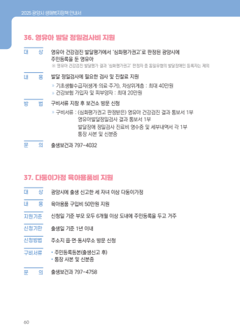 2025 %uad11%uc591%uc2dc %uc0dd%uc560%ubcf5%uc9c0%uc815%ucc45 %uc548%ub0b4%uc11c6036. %uc601%uc720%uc544 %ubc1c%ub2ec %uc815%ubc00%uac80%uc0ac%ube44 %uc9c0%uc6d0 %ub300%u0009 %uc0c1 %uc601%uc720%uc544 %uac74%uac15%uac80%uc9c4 %ubc1c%ub2ec%ud3c9%uac00%uc5d0%uc11c %u2018%uc2ec%ud654%ud3c9%uac00%uad8c%uace0%u2019%ub85c %ud310%uc815%ub41c %uad11%uc591%uc2dc%uc5d0 %uc8fc%ubbfc%ub4f1%ub85d%uc744 %ub454 %uc601%uc720%uc544%u203b %uc601%uc720%uc544 %uac74%uac15%uac80%uc9c4 %ubc1c%ub2ec%ud3c9%uac00 %uacb0%uacfc %u2018%uc2ec%ud654%ud3c9%uac00%uad8c%uace0%u2019 %ud310%uc815%uc790 %uc911 %ub3d9%uc77c%uc720%ud615%uc758 %ubc1c%ub2ec%uc7a5%uc560%uc778 %ub4f1%ub85d%uc790%ub294 %uc81c%uc678%ub0b4%u0009 %uc6a9 %ubc1c%ub2ec %uc815%ubc00%uac80%uc0ac%uc5d0 %ud544%uc694%ud55c %uac80%uc0ac %ubc0f %uc9c4%ucc30%ub8cc %uc9c0%uc6d0%u00bb %uae30%ucd08%uc0dd%ud65c%uc218%uae09%uc790(%uc0dd%uacc4%u00b7%uc758%ub8cc%u00b7%uc8fc%uac70), %ucc28%uc0c1%uc704%uacc4%uce35 : %ucd5c%ub300 40%ub9cc%uc6d0%u00bb %uac74%uac15%ubcf4%ud5d8 %uac00%uc785%uc790 %ubc0f %ud53c%ubd80%uc591%uc790 : %ucd5c%ub300 20%ub9cc%uc6d0 %ubc29%u0009 %ubc95 %uad6c%ube44%uc11c%ub958 %uc9c0%ucc38 %ud6c4 %ubcf4%uac74%uc18c %ubc29%ubb38 %uc2e0%uccad %u00bb %uad6c%ube44%uc11c%ub958 : (%uc2ec%ud654%ud3c9%uac00%uad8c%uace0 %ud310%uc815%ubc1b%uc740) %uc601%uc720%uc544 %uac74%uac15%uac80%uc9c4 %uacb0%uacfc %ud1b5%ubcf4%uc11c 1%ubd80%uc601%uc720%uc544%ubc1c%ub2ec%uc815%ubc00%uac80%uc0ac %uacb0%uacfc %ud1b5%ubcf4%uc11c 1%ubd80%ubc1c%ub2ec%uc7a5%uc560 %uc815%ubc00%uac80%uc0ac %uc9c4%ub8cc%ube44 %uc601%uc218%uc99d %ubc0f %uc138%ubd80%ub0b4%uc5ed%uc11c %uac01 1%ubd80%ud1b5%uc7a5 %uc0ac%ubcf8 %ubc0f %uc2e0%ubd84%uc99d%ubb38%u0009 %uc758 %ucd9c%uc0dd%ubcf4%uac74%uacfc 797-403237. %ub2e4%ub465%uc774%uac00%uc815 %uc721%uc544%uc6a9%ud488%ube44 %uc9c0%uc6d0%ub300 %uc0c1 %uad11%uc591%uc2dc%uc5d0 %ucd9c%uc0dd %uc2e0%uace0%ud55c %uc138 %uc790%ub140 %uc774%uc0c1 %ub2e4%ub465%uc774%uac00%uc815%ub0b4 %u0009 %uc6a9 %uc721%uc544%uc6a9%ud488 %uad6c%uc785%ube44 50%ub9cc%uc6d0 %uc9c0%uc6d0%uc9c0%uc6d0%uae30%uc900%u0009 %uc2e0%uccad%uc77c %uae30%uc900 %ubd80%ubaa8 %ubaa8%ub450 6%uac1c%uc6d4 %uc774%uc0c1 %ub3c4%ub0b4%uc5d0 %uc8fc%ubbfc%ub4f1%ub85d%uc744 %ub450%uace0 %uac70%uc8fc%uc2e0%uccad%uae30%ud55c%u0009 %ucd9c%uc0dd%uc77c %uae30%uc900 1%ub144 %uc774%ub0b4%uc2e0%uccad%ubc29%ubc95%u0009 %uc8fc%uc18c%uc9c0 %uc74d%u00b7%uba74%u00b7%ub3d9%uc0ac%ubb34%uc18c %ubc29%ubb38 %uc2e0%uccad%uad6c%ube44%uc11c%ub958%u0009 %u2022 %uc8fc%ubbfc%ub4f1%ub85d%ub4f1%ubcf8(%ucd9c%uc0dd%uc2e0%uace0 %ud6c4) %u2022 %ud1b5%uc7a5 %uc0ac%ubcf8 %ubc0f %uc2e0%ubd84%uc99d%ubb38 %uc758 %ucd9c%uc0dd%ubcf4%uac74%uacfc 797-4758