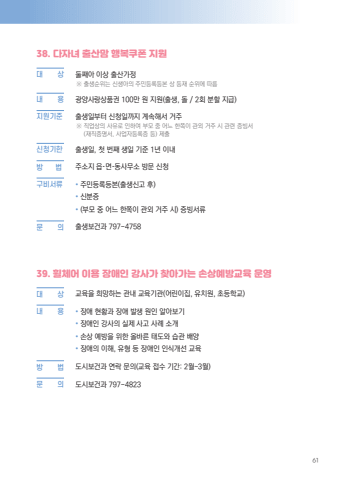 6138. %ub2e4%uc790%ub140 %ucd9c%uc0b0%ub9d8 %ud589%ubcf5%ucfe0%ud3f0 %uc9c0%uc6d0%ub300%u0009 %uc0c1 %ub458%uc9f8%uc544 %uc774%uc0c1 %ucd9c%uc0b0%uac00%uc815%u203b %ucd9c%uc0dd%uc21c%uc704%ub294 %uc2e0%uc0dd%uc544%uc758 %uc8fc%ubbfc%ub4f1%ub85d%ub4f1%ubcf8 %uc0c1 %ub4f1%uc7ac %uc21c%uc704%uc5d0 %ub530%ub984%ub0b4%u0009 %uc6a9 %uad11%uc591%uc0ac%ub791%uc0c1%ud488%uad8c 100%ub9cc %uc6d0 %uc9c0%uc6d0(%ucd9c%uc0dd, %ub3cc / 2%ud68c %ubd84%ud560 %uc9c0%uae09)%uc9c0%uc6d0%uae30%uc900%u0009 %ucd9c%uc0dd%uc77c%ubd80%ud130 %uc2e0%uccad%uc77c%uae4c%uc9c0 %uacc4%uc18d%ud574%uc11c %uac70%uc8fc%u203b %uc9c1%uc5c5%uc0c1%uc758 %uc0ac%uc720%ub85c %uc778%ud558%uc5ec %ubd80%ubaa8 %uc911 %uc5b4%ub290 %ud55c%ucabd%uc774 %uad00%uc678 %uac70%uc8fc %uc2dc %uad00%ub828 %uc99d%ube59%uc11c(%uc7ac%uc9c1%uc99d%uba85%uc11c, %uc0ac%uc5c5%uc790%ub4f1%ub85d%uc99d %ub4f1) %uc81c%ucd9c%uc2e0%uccad%uae30%ud55c%u0009 %ucd9c%uc0dd%uc77c, %uccab %ubc88%uc9f8 %uc0dd%uc77c %uae30%uc900 1%ub144 %uc774%ub0b4%ubc29 %ubc95%u0009 %uc8fc%uc18c%uc9c0 %uc74d%u00b7%uba74%u00b7%ub3d9%uc0ac%ubb34%uc18c %ubc29%ubb38 %uc2e0%uccad%uad6c%ube44%uc11c%ub958%u0009 %u2022 %uc8fc%ubbfc%ub4f1%ub85d%ub4f1%ubcf8(%ucd9c%uc0dd%uc2e0%uace0 %ud6c4)%u2022 %uc2e0%ubd84%uc99d%u2022 (%ubd80%ubaa8 %uc911 %uc5b4%ub290 %ud55c%ucabd%uc774 %uad00%uc678 %uac70%uc8fc %uc2dc) %uc99d%ube59%uc11c%ub958%ubb38%u0009 %uc758 %ucd9c%uc0dd%ubcf4%uac74%uacfc 797-475839. %ud720%uccb4%uc5b4 %uc774%uc6a9 %uc7a5%uc560%uc778 %uac15%uc0ac%uac00 %ucc3e%uc544%uac00%ub294 %uc190%uc0c1%uc608%ubc29%uad50%uc721 %uc6b4%uc601%ub300%u0009 %uc0c1 %uad50%uc721%uc744 %ud76c%ub9dd%ud558%ub294 %uad00%ub0b4 %uad50%uc721%uae30%uad00(%uc5b4%ub9b0%uc774%uc9d1, %uc720%uce58%uc6d0, %ucd08%ub4f1%ud559%uad50)%ub0b4%u0009 %uc6a9 %u2022 %uc7a5%uc560 %ud604%ud669%uacfc %uc7a5%uc560 %ubc1c%uc0dd %uc6d0%uc778 %uc54c%uc544%ubcf4%uae30%u2022 %uc7a5%uc560%uc778 %uac15%uc0ac%uc758 %uc2e4%uc81c %uc0ac%uace0 %uc0ac%ub840 %uc18c%uac1c%u2022 %uc190%uc0c1 %uc608%ubc29%uc744 %uc704%ud55c %uc62c%ubc14%ub978 %ud0dc%ub3c4%uc640 %uc2b5%uad00 %ubc30%uc591%u2022 %uc7a5%uc560%uc758 %uc774%ud574, %uc720%ud615 %ub4f1 %uc7a5%uc560%uc778 %uc778%uc2dd%uac1c%uc120 %uad50%uc721%ubc29%u0009 %ubc95 %ub3c4%uc2dc%ubcf4%uac74%uacfc %uc5f0%ub77d %ubb38%uc758(%uad50%uc721 %uc811%uc218 %uae30%uac04: 2%uc6d4~3%uc6d4)%ubb38%u0009 %uc758 %ub3c4%uc2dc%ubcf4%uac74%uacfc 797-4823