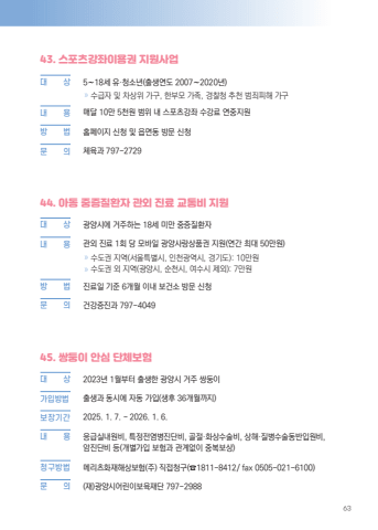 6343. %uc2a4%ud3ec%uce20%uac15%uc88c%uc774%uc6a9%uad8c %uc9c0%uc6d0%uc0ac%uc5c5%ub300%u0009 %uc0c1 5%u223c18%uc138 %uc720%u00b7%uccad%uc18c%ub144(%ucd9c%uc0dd%uc5f0%ub3c4 2007%u223c2020%ub144)%u00bb %uc218%uae09%uc790 %ubc0f %ucc28%uc0c1%uc704 %uac00%uad6c, %ud55c%ubd80%ubaa8 %uac00%uc871, %uacbd%ucc30%uccad %ucd94%ucc9c %ubc94%uc8c4%ud53c%ud574 %uac00%uad6c%ub0b4%u0009 %uc6a9 %ub9e4%ub2ec 10%ub9cc 5%ucc9c%uc6d0 %ubc94%uc704 %ub0b4 %uc2a4%ud3ec%uce20%uac15%uc88c %uc218%uac15%ub8cc %uc5f0%uc911%uc9c0%uc6d0%ubc29%u0009 %ubc95 %ud648%ud398%uc774%uc9c0 %uc2e0%uccad %ubc0f %uc74d%uba74%ub3d9 %ubc29%ubb38 %uc2e0%uccad%ubb38%u0009 %uc758 %uccb4%uc721%uacfc 797-272944. %uc544%ub3d9 %uc911%uc99d%uc9c8%ud658%uc790 %uad00%uc678 %uc9c4%ub8cc %uad50%ud1b5%ube44 %uc9c0%uc6d0%ub300 %u0009 %uc0c1 %uad11%uc591%uc2dc%uc5d0 %uac70%uc8fc%ud558%ub294 18%uc138 %ubbf8%ub9cc %uc911%uc99d%uc9c8%ud658%uc790%ub0b4 %u0009 %uc6a9 %uad00%uc678 %uc9c4%ub8cc 1%ud68c %ub2f9 %ubaa8%ubc14%uc77c %uad11%uc591%uc0ac%ub791%uc0c1%ud488%uad8c %uc9c0%uc6d0(%uc5f0%uac04 %ucd5c%ub300 50%ub9cc%uc6d0)%u00bb %uc218%ub3c4%uad8c %uc9c0%uc5ed(%uc11c%uc6b8%ud2b9%ubcc4%uc2dc, %uc778%ucc9c%uad11%uc5ed%uc2dc, %uacbd%uae30%ub3c4): 10%ub9cc%uc6d0%u00bb %uc218%ub3c4%uad8c %uc678 %uc9c0%uc5ed(%uad11%uc591%uc2dc, %uc21c%ucc9c%uc2dc, %uc5ec%uc218%uc2dc %uc81c%uc678): 7%ub9cc%uc6d0%ubc29%u0009 %ubc95 %uc9c4%ub8cc%uc77c %uae30%uc900 6%uac1c%uc6d4 %uc774%ub0b4 %ubcf4%uac74%uc18c %ubc29%ubb38 %uc2e0%uccad%ubb38 %u0009 %uc758 %uac74%uac15%uc99d%uc9c4%uacfc 797-404945. %uc30d%ub465%uc774 %uc548%uc2ec %ub2e8%uccb4%ubcf4%ud5d8%ub300 %u0009 %uc0c1 2023%ub144 1%uc6d4%ubd80%ud130 %ucd9c%uc0dd%ud55c %uad11%uc591%uc2dc %uac70%uc8fc %uc30d%ub465%uc774%uac00%uc785%ubc29%ubc95%u0009 %ucd9c%uc0dd%uacfc %ub3d9%uc2dc%uc5d0 %uc790%ub3d9 %uac00%uc785(%uc0dd%ud6c4 36%uac1c%uc6d4%uae4c%uc9c0)%ubcf4%uc7a5%uae30%uac04%u0009 2025. 1. 7. ~ 2026. 1. 6.%ub0b4%u0009 %uc6a9 %uc751%uae09%uc2e4%ub0b4%uc6d0%ube44, %ud2b9%uc815%uc804%uc5fc%ubcd1%uc9c4%ub2e8%ube44, %uace8%uc808%u00b7%ud654%uc0c1%uc218%uc220%ube44, %uc0c1%ud574%u00b7%uc9c8%ubcd1%uc218%uc220%ub3d9%ubc18%uc785%uc6d0%ube44, %uc554%uc9c4%ub2e8%ube44 %ub4f1(%uac1c%ubcc4%uac00%uc785 %ubcf4%ud5d8%uacfc %uad00%uacc4%uc5c6%uc774 %uc911%ubcf5%ubcf4%uc0c1)%uccad%uad6c%ubc29%ubc95%u0009 %uba54%ub9ac%uce20%ud654%uc7ac%ud574%uc0c1%ubcf4%ud5d8(%uc8fc) %uc9c1%uc811%uccad%uad6c(%u260e1811-8412/ fax 0505-021-6100)%ubb38 %uc758 (%uc7ac)%uad11%uc591%uc2dc%uc5b4%ub9b0%uc774%ubcf4%uc721%uc7ac%ub2e8 797-2988