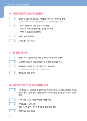 2025 %uad11%uc591%uc2dc %uc0dd%uc560%ubcf5%uc9c0%uc815%ucc45 %uc548%ub0b4%uc11c6446. %uc544%ud1a0%ud53c%uc131%ud53c%ubd80%uc5fc%u00b7%ucc9c%uc2dd %uc608%ubc29%uad00%ub9ac%ub300%u0009 %uc0c1 %uc54c%ub808%ub974%uae30 %uc9c8%ud658*%uc73c%ub85c %uc9c4%ub2e8%ubc1b%uace0 %uce58%ub8cc%uc911%uc778 18%uc138 %uc774%ud558 %ucde8%uc57d%uacc4%uce35 %ud658%uc544*%uc54c%ub808%ub974%uae30 %uc9c8%ud658: %uc544%ud1a0%ud53c%uc131%ud53c%ubd80%uc5fc(%uc0c1%ubcd1%ucf54%ub4dcL20), %ucc9c%uc2dd%ud658%uc544(%uc0c1%ubcd1%ucf54%ub4dcJ45)%ub0b4%u0009 %uc6a9 %u2022 %uc9c4%ub8cc%ube44 %ubc0f %uac80%uc0ac%ube44 %uc9c0%uc6d0: %uc5f0%uac04 %ucd5c%ub300 20%ub9cc%uc6d0%u2022 %uc544%ud1a0%ud53c%uc131 %ud53c%ubd80%uc5fc %ubcf4%uc2b5%uc81c %uc9c0%uc6d0: %ubd84%uae30%ubcc4 2%uac1c %uc9c0%uc6d0%u2022 %uc9c0%uc5ed%uc8fc%ubbfc %ub300%uc0c1 %uad50%uc721 %ubc0f %ucea0%ud398%uc778%ubc29%u0009 %ubc95 %ubcf4%uac74%uc18c %ubc29%ubb38%u00b7%uc804%ud654%uc2e0%uccad%ubb38%u0009 %uc758 %ub3c4%uc2dc%ubcf4%uac74%uacfc 797-401247. %ub9d8 %ud3b8%ud55c %ub3c4%uc11c%uad00 %ub300%u0009 %uc0c1 %uad11%uc591%uc2dc %uac70%uc8fc %uc784%uc0b0%ubd80(3%uac1c%uc6d4 %uc774%uc0c1) %ubc0f %uc790%ub140(12%uac1c%uc6d4 %uc774%ud558) %uc591%uc721%uc790%ub0b4 %u0009 %uc6a9 %ub3c4%uc11c %ud0dd%ubc30 %ubc30%ub2ec(1%uc778 10%uad8c/30%uc77c%uac04) %ubc0f %ub3c5%uc11c %ubc0f %uc721%uc544 %uc815%ubcf4 %uc81c%uacf5%ubc29%u0009 %ubc95 %ub3c4%uc11c%uad00(7%uac1c%uc18c) %ubc29%ubb38 %uac00%uc785 %ud6c4 %ub204%ub9ac%uc9d1 %ub3c4%uc11c %ub300%ucd9c %uc2e0%uccad%u203b %ubc29%ubb38%uc774 %uc5b4%ub824%uc6b4 %uacbd%uc6b0 %uc6b0%ud3b8, %ud329%uc2a4, %uba54%uc77c %uc811%uc218 %uac00%ub2a5%ubb38%u0009 %uc758 %uc911%uc559%ub3c4%uc11c%uad00 797-253048. %uad11%uc591%ud615 %ud55c%ubd80%ubaa8%uac00%uc871 %uc544%ub3d9%uc591%uc721%ube44 %uc9c0%uc6d0 %ub300%u0009 %uc0c1 %uae30%uc900%uc911%uc704%uc18c%ub4dd 100%%uc774%ud558 %ud55c%ubd80%ubaa8%uac00%uc871%uc758 %uc790%ub140(%uae30%uc900%uc911%uc704%uc18c%ub4dd 63%%uc774%ud558 %ubc95%uc815 %uc800%uc18c%ub4dd %ud55c%ubd80%ubaa8%uac00%uc871 %ub300%uc0c1%uc790 %uc81c%uc678, %uae30%uc900%uc911%uc704%uc18c%ub4dd 65%%uc774%ud558 %ubc95%uc815 %uccad%uc18c%ub144%ud55c%ubd80%ubaa8%uac00%uc871 %ub300%uc0c1%uc790 %uc81c%uc678) %ub0b4 %u0009 %uc6a9 18%uc138 %ubbf8%ub9cc %uc790%ub140%ub2f9 %uc544%ub3d9%uc591%uc721%ube44 %uc6d4 10%ub9cc%uc6d0 %uc9c0%uae09%ubc29%u0009 %ubc95 %uc74d%uba74%ub3d9%uc0ac%ubb34%uc18c %ubc29%ubb38 %uc2e0%uccad(%ubc95%uc815 %uc800%uc18c%ub4dd%ud55c%ubd80%ubaa8%uac00%uc871%uacfc %ub3d9%uc2dc%uc2e0%uccad, %uc2e0%uccad%uc11c %ub4f1 %uc81c%ucd9c)%ubb38%u0009 %uc758 %uc5ec%uc131%uac00%uc871%uacfc 797-2776