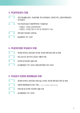 713. %ud559%uad50%uc6b0%uc720%uae09%uc2dd %uc9c0%uc6d0%ub300 %u0009 %uc0c1 %uad6d%ubbfc%uae30%ucd08%uc0dd%ud65c%uc218%uae09%uc790, %ucc28%uc0c1%uc704%uacc4%uce35, %ud2b9%uc218%uad50%uc721%ub300%uc0c1%uc790, %ud55c%ubd80%ubaa8%uac00%uc871, %uad50%uc721%ube44%uc9c0%uc6d0%ub300%uc0c1%uc790, %uad6d%uac00%uc720%uacf5%uc790%ub0b4 %u0009 %uc6a9 %ubb34%uc0c1 %ud559%uad50%uc6b0%uc720%uae09%uc2dd %uc81c%uacf5(%ubc31%uc0c9%uc6b0%uc720 100%u3396%uc774%uc0c1)%u00bb %uc9c0%uc6d0%uc77c%uc218: 250%uc77c %ub0b4%uc678(%ubc29%ud559%ud3ec%ud568 )%u00bb %uc9c0%uc6d0%ud55c%ub3c4: 530%uc6d0/%uac1c(%ub3c4%uc11c%u00b7%ubcbd%uc9c0 %ub4f1 580%uc6d0%uae4c%uc9c0 %uac00%ub2a5)%ubc29 %u0009 %ubc95 %ucde8%ud559 %uc911%uc778 %ud559%uad50%uc5d0%uc11c %uc2e0%uccad%uac00%ub2a5%ubb38%u0009 %uc758 %ub18d%uc5c5%uc815%ucc45%uacfc 797-23914. %ud559%uad50(%uc720%uce58%uc6d0) %ubb34%uc0c1%uae09%uc2dd %uc9c0%uc6d0%ub300 %u0009 %uc0c1 %uad00%ub0b4%uc5d0 %uc704%uce58%ud558%uace0 %uc6b4%uc601 %uc911%uc778 %uc720%uce58%uc6d0, %ud559%uad50%uc5d0 %uc7ac%ud559 %uc911%uc778 %uc6d0%uc544 %ubc0f %ud559%uc0dd%ub0b4 %u0009 %uc6a9 %ud559%uad50 %uae09%uc2dd %uc911 %u2018%uc911%uc2dd%u2019%uc5d0 %uc18c%uc694%ub418%ub294%u2018%uc2dd%ud488%ube44%u2019%uc9c0%uc6d0%ubc29%u0009 %ubc95 %uc720%uce58%uc6d0 %ubc0f %ud559%uad50%uc5d0%uc11c %uc77c%uad04 %uc2e0%uccad%ubb38%u0009 %uc758 %ub18d%uc2dd%ud488%uc720%ud1b5%uacfc 797-3440, %uad11%uc591%uad50%uc721%uc9c0%uc6d0%uccad 760-33345. %ud559%uad50%uae09%uc2dd %uce5c%ud658%uacbd %uad11%uc591%ub9e4%uc2e4%uccad %uc9c0%uc6d0%ub300 %u0009 %uc0c1 %uad00%ub0b4%uc5d0 %uc704%uce58%ud558%uace0 %uc6b4%uc601 %uc911%uc778 %ubcf4%uc721%uc2dc%uc124, %uc720%uce58%uc6d0, %ud559%uad50%uc5d0 %uc7ac%ud559 %uc911%uc778 %uc6d0%uc544 %ubc0f %ud559%uc0dd%ub0b4%u0009 %uc6a9 %uce5c%ud658%uacbd %uad11%uc591%ub9e4%uc2e4%uccad %ubc0f %uc0dd%uc218 %uc9c0%uc6d0 (%u203b %uae09%uc2dd %uc2dd%ub2e8%ud45c%uc5d0 %ubc18%uc601%ud558%uc5ec %uc6b4%uc601)%ubc29 %u0009 %ubc95 %ubcf4%uc721%uc2dc%uc124 %ubc0f %uc720%uce58%uc6d0, %ud559%uad50%uc5d0%uc11c %uc77c%uad04 %uc2e0%uccad%ubb38 %u0009 %uc758 %ub18d%uc2dd%ud488%uc720%ud1b5%uacfc 797-3440